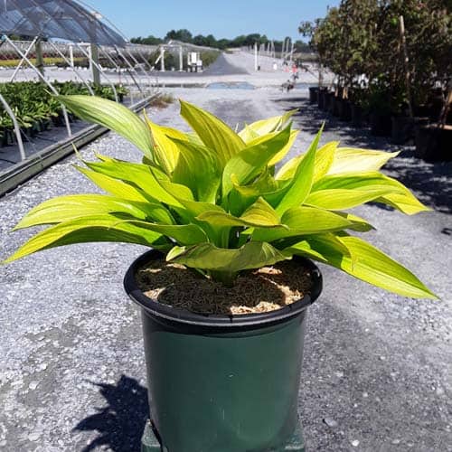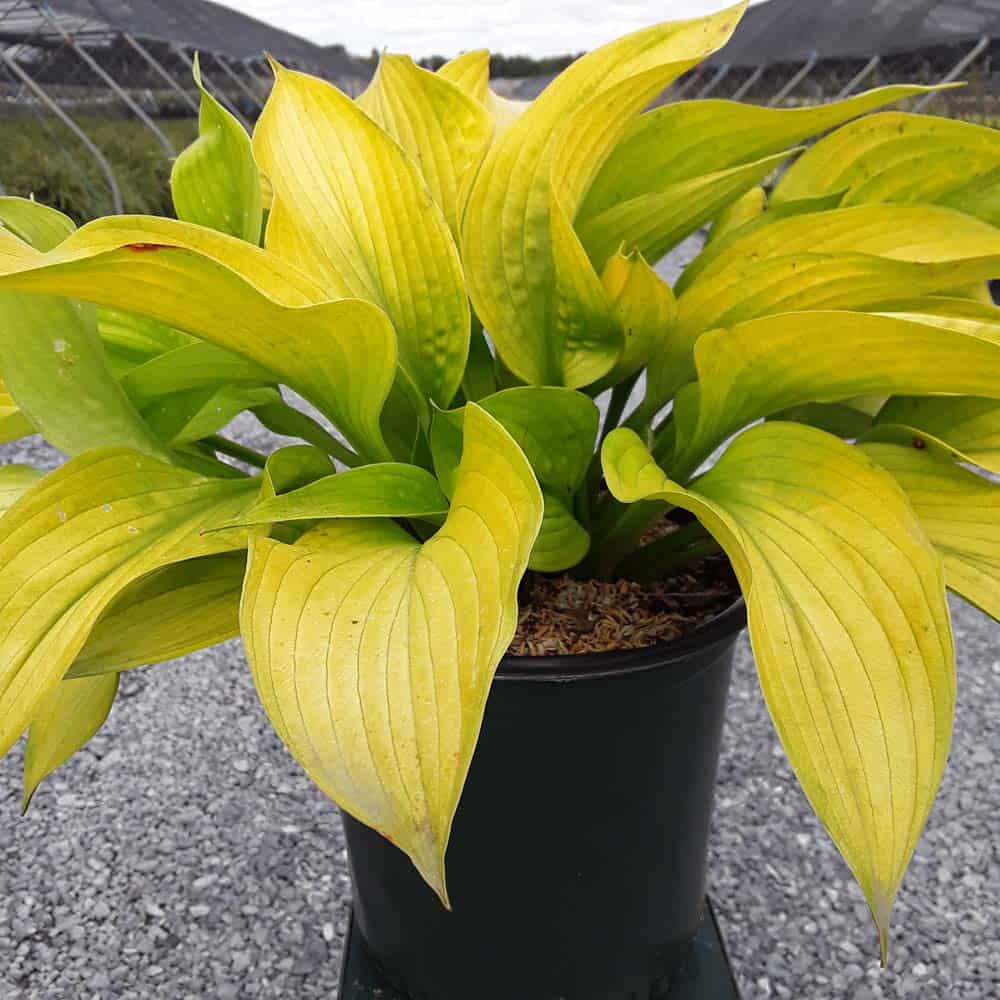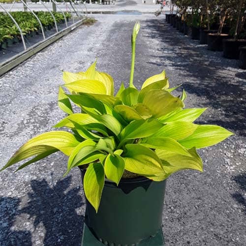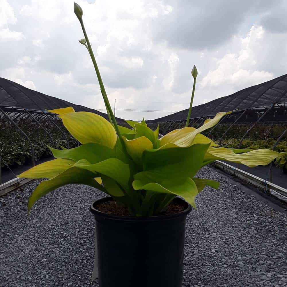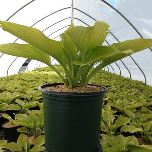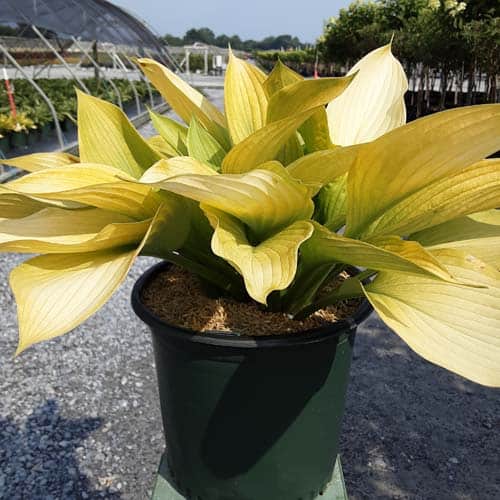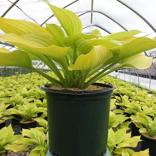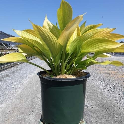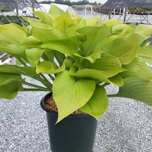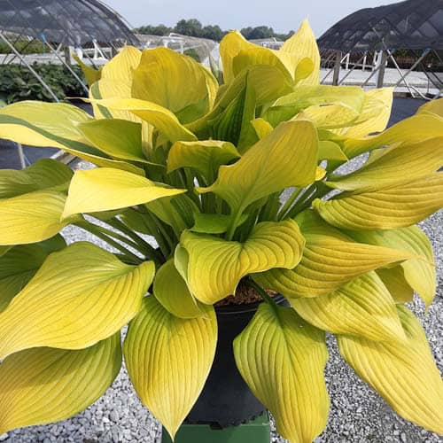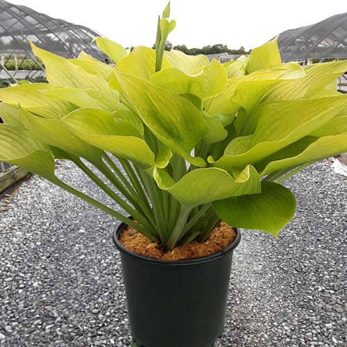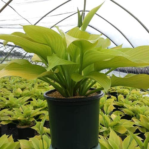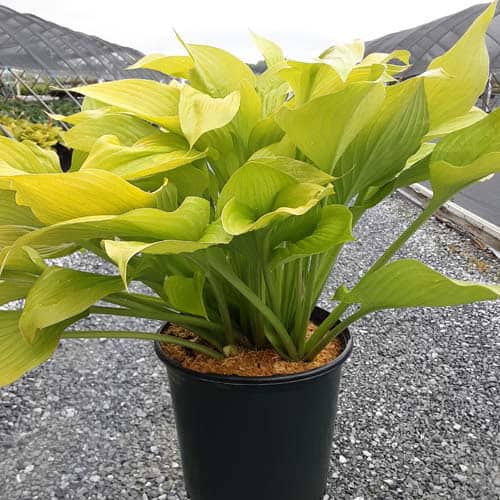 "A large gold hosta from renowned Hosta breeder Hans Hansen. With golden yellow leaves, this is the perfect specimen for making a statement in the shade with its upright spreading habit and large smooth leaves. In midsummer, near white, tubular flowers appear with a very faint pale lavender central pattern on the interior petals. Plant in morning sun or filtered shade for best yellow color." Walters Gardens [Hosta]