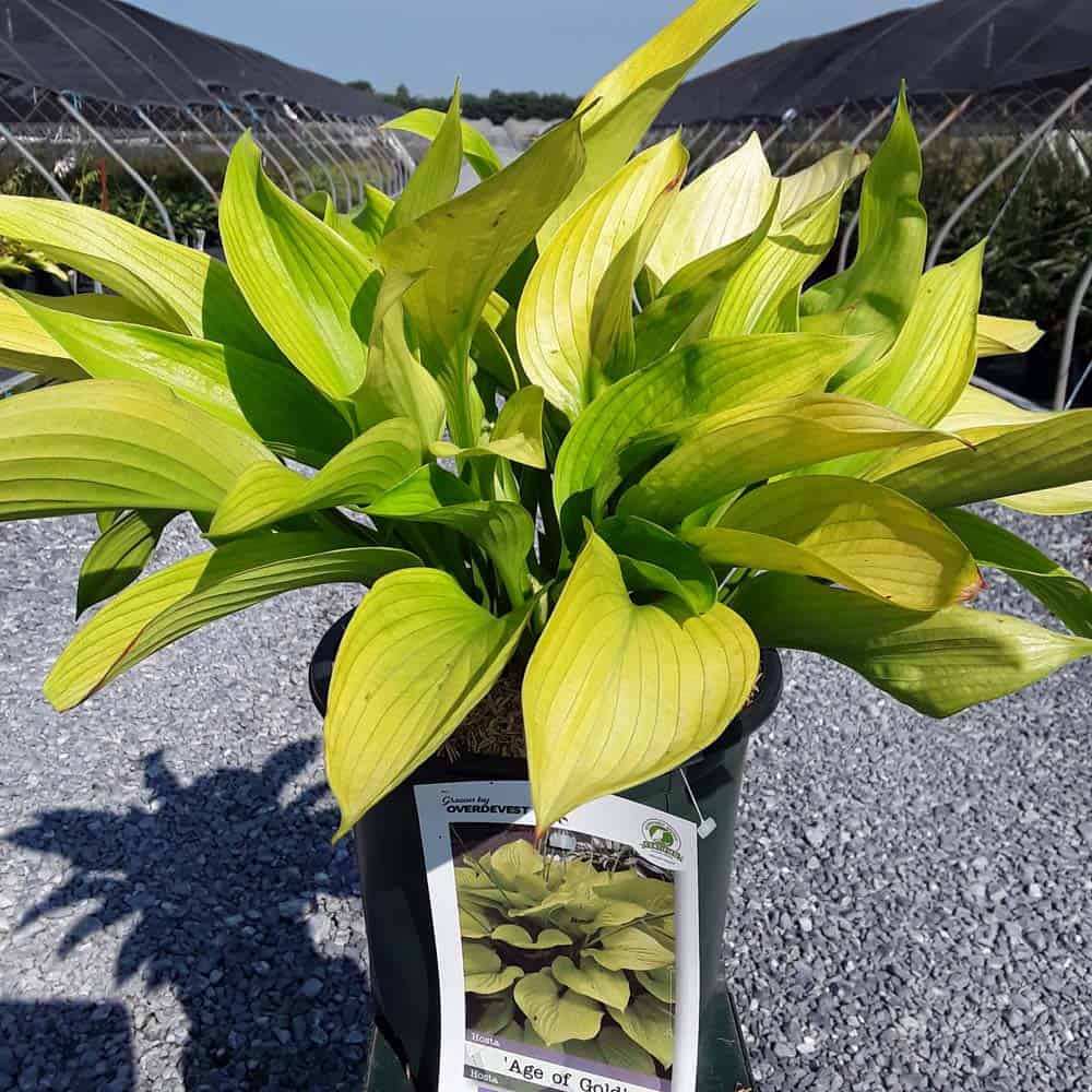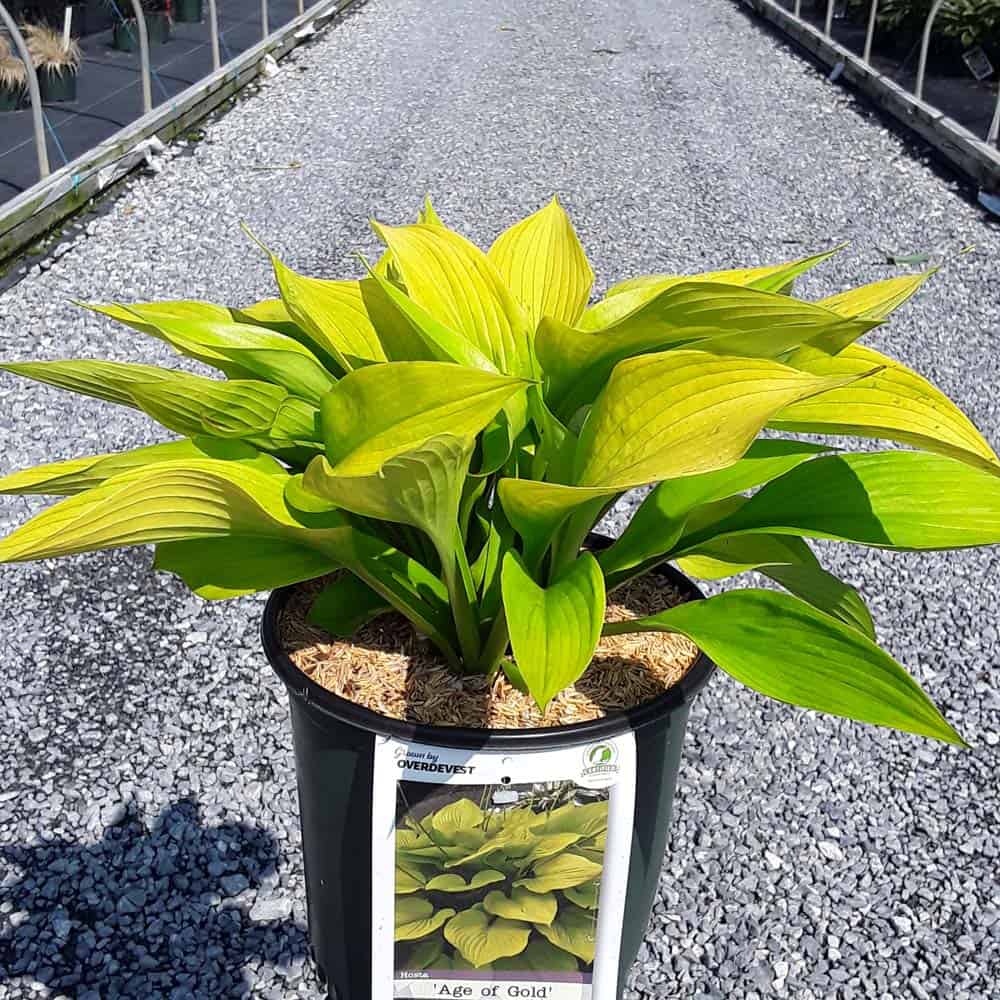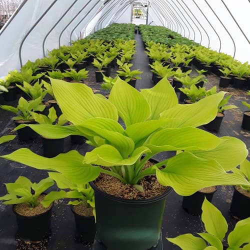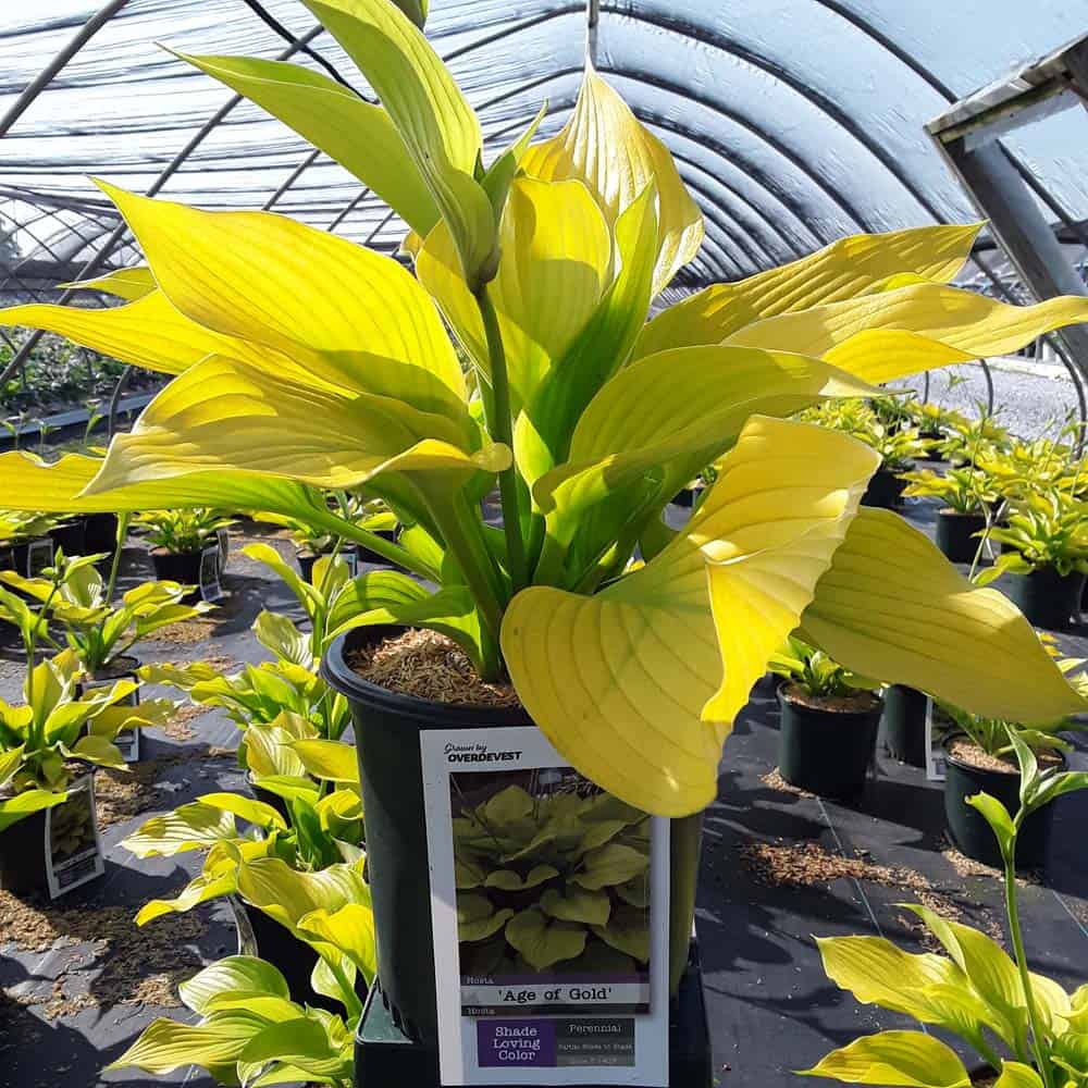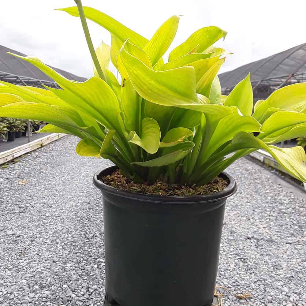 "A large gold hosta from renowned Hosta breeder Hans Hansen. With golden yellow leaves, this is the perfect specimen for making a statement in the shade with its upright spreading habit and large smooth leaves. In midsummer, near white, tubular flowers appear with a very faint pale lavender central pattern on the interior petals. Plant in morning sun or filtered shade for best yellow color." Walters Gardens [Hosta]
