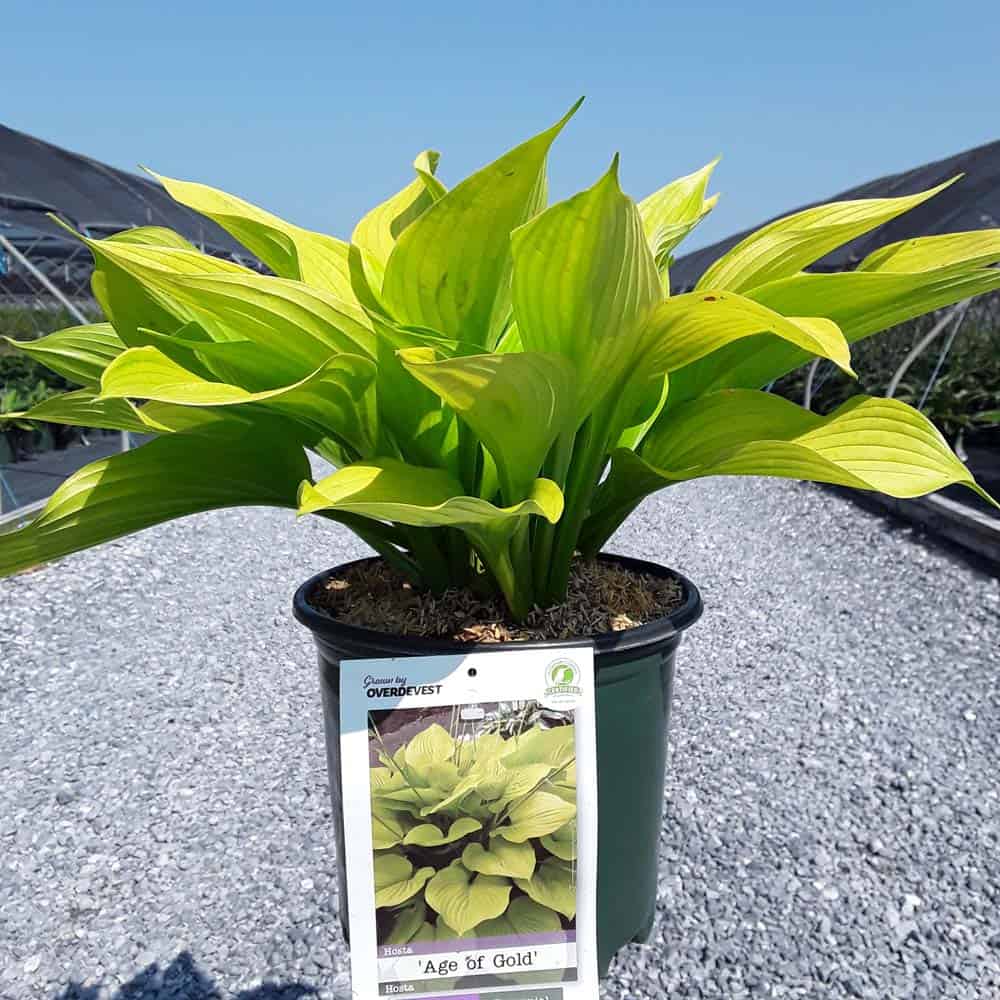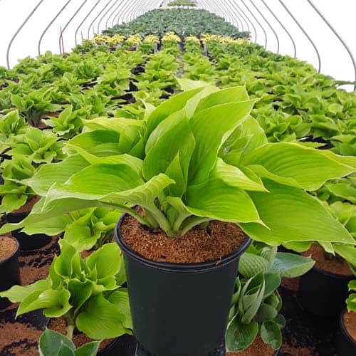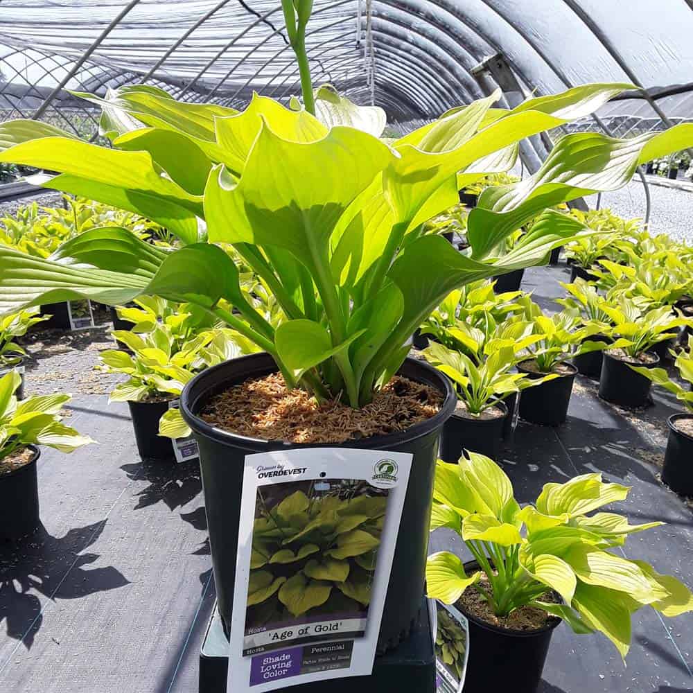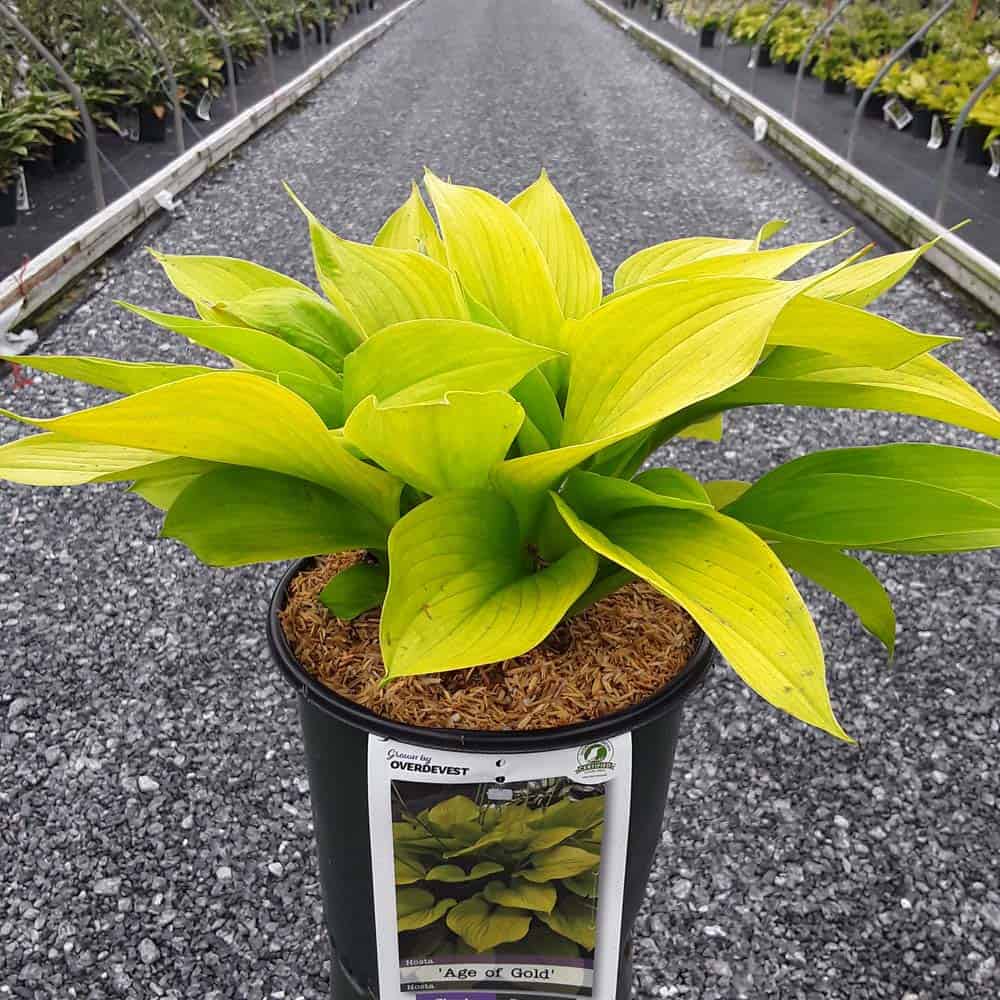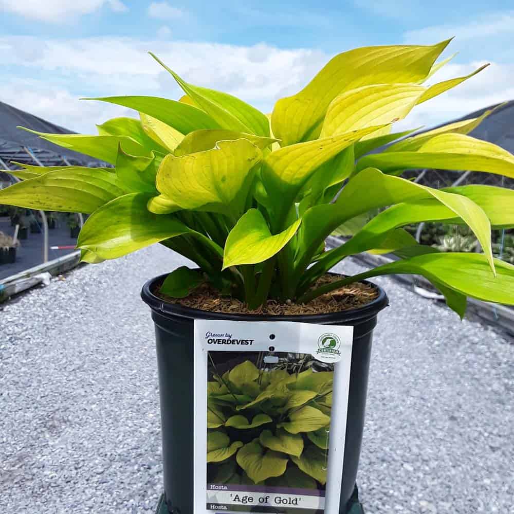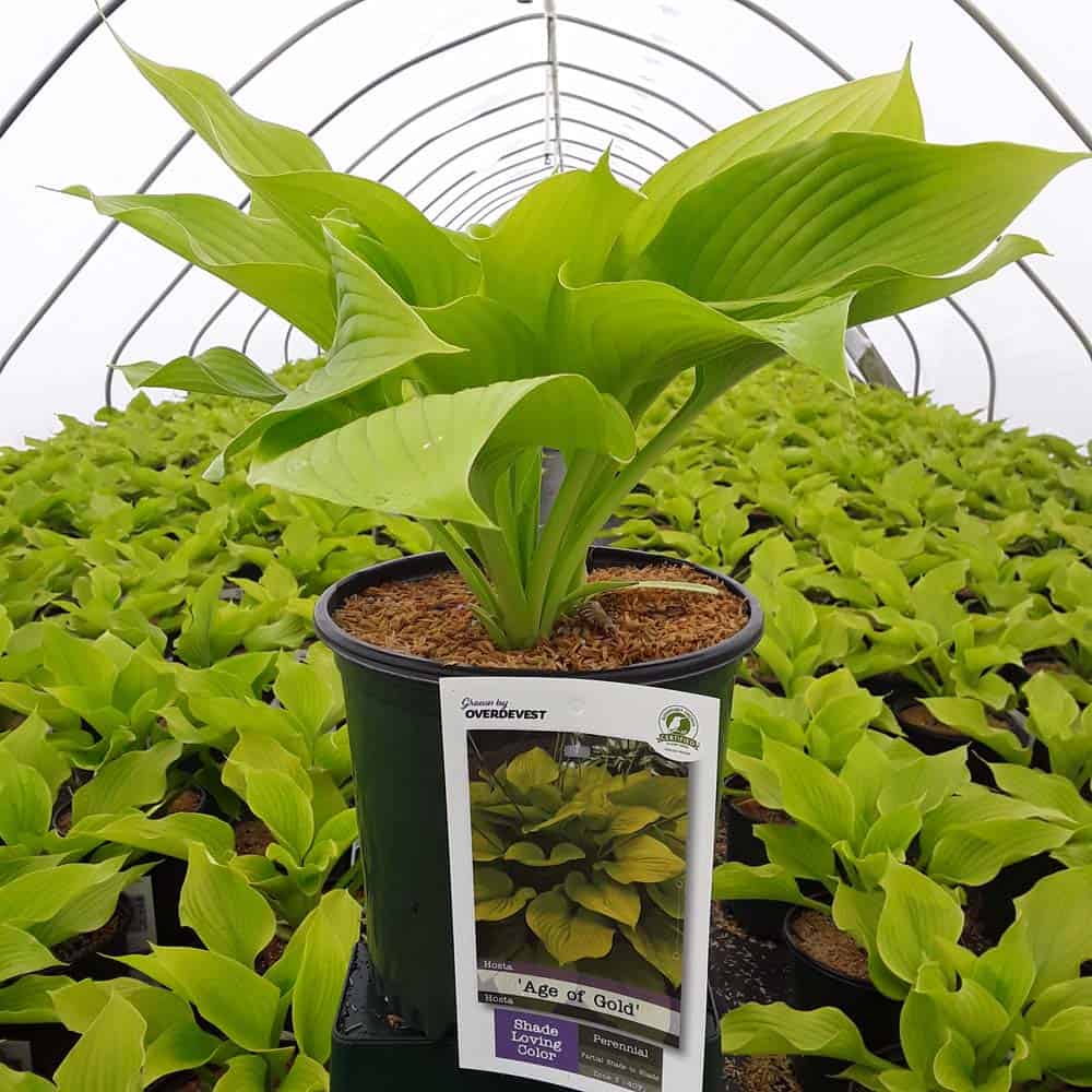 "A large gold hosta from renowned Hosta breeder Hans Hansen. With golden yellow leaves, this is the perfect specimen for making a statement in the shade with its upright spreading habit and large smooth leaves. In midsummer, near white, tubular flowers appear with a very faint pale lavender central pattern on the interior petals. Plant in morning sun or filtered shade for best yellow color." Walters Gardens [Hosta]