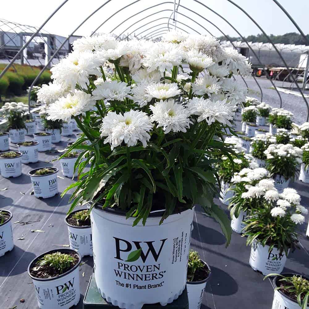 "Large, 3.5" fully double bright white flowers absolutely cover this summer-blooming plant. Use in containers or in the landscape!" Proven Winners [Leucanthemum]