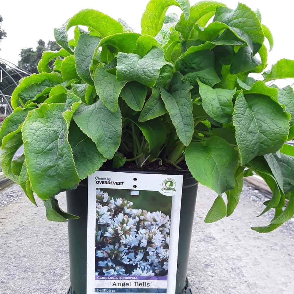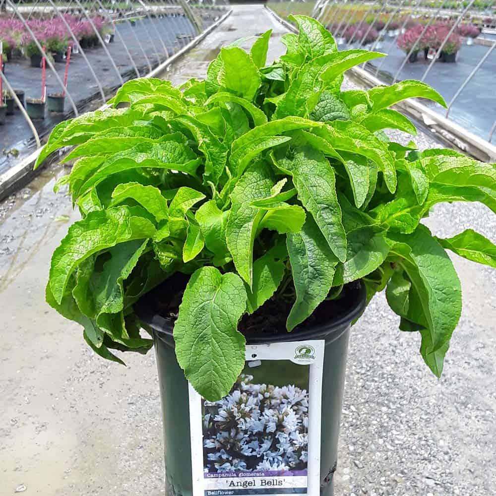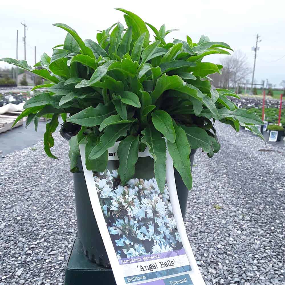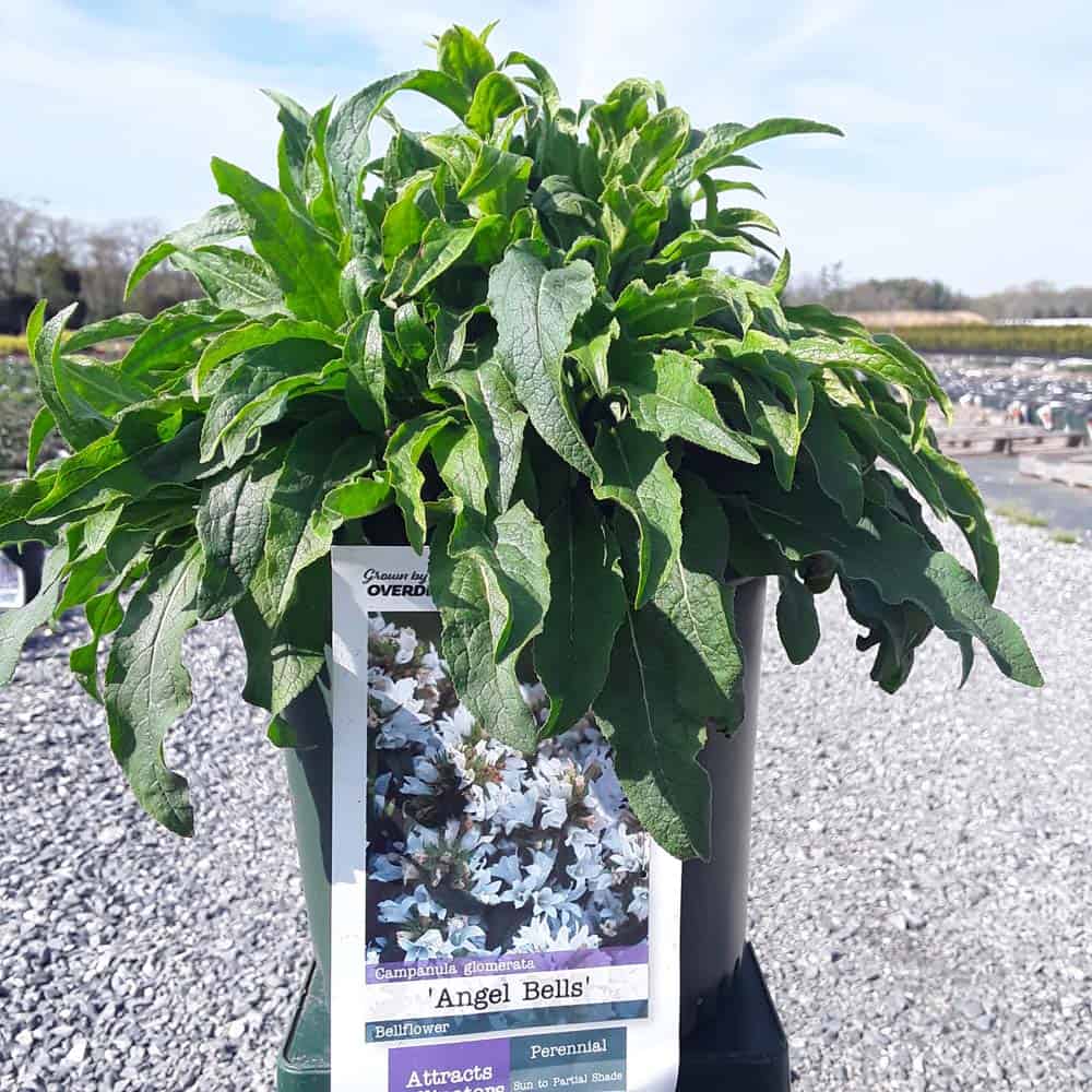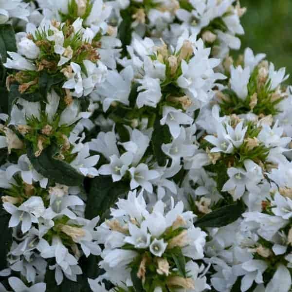 "Well-formed clusters of white flowers are packed onto rich, dark green foliage. A little later to bloom than its blue counterpart, 'Church Bells', by about a week. A great choice for the gardener looking for a pollinator-friendly, deer resistant perennial." Walters Gardens [Campanula]