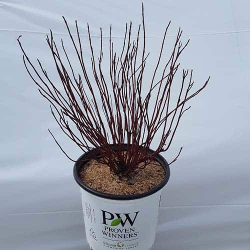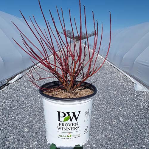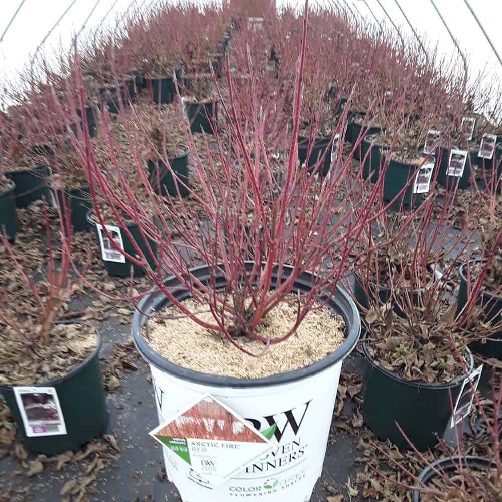 "Arctic Fire® Red dogwood has beautiful red stems and a compact habit and is at its best in the winter sunlight. This dwarf variety reaches just 3-5' feet rather than the 8-10' of conventional red-twig dogwood. Its smaller size makes this variety a great breakthrough for smaller gardens or residential landscapes. Tolerates a wide range of soil and light conditions. Plant a few extra to use in winter arrangements and holiday dècor! Native to North America." - Proven Winners [Cornus]