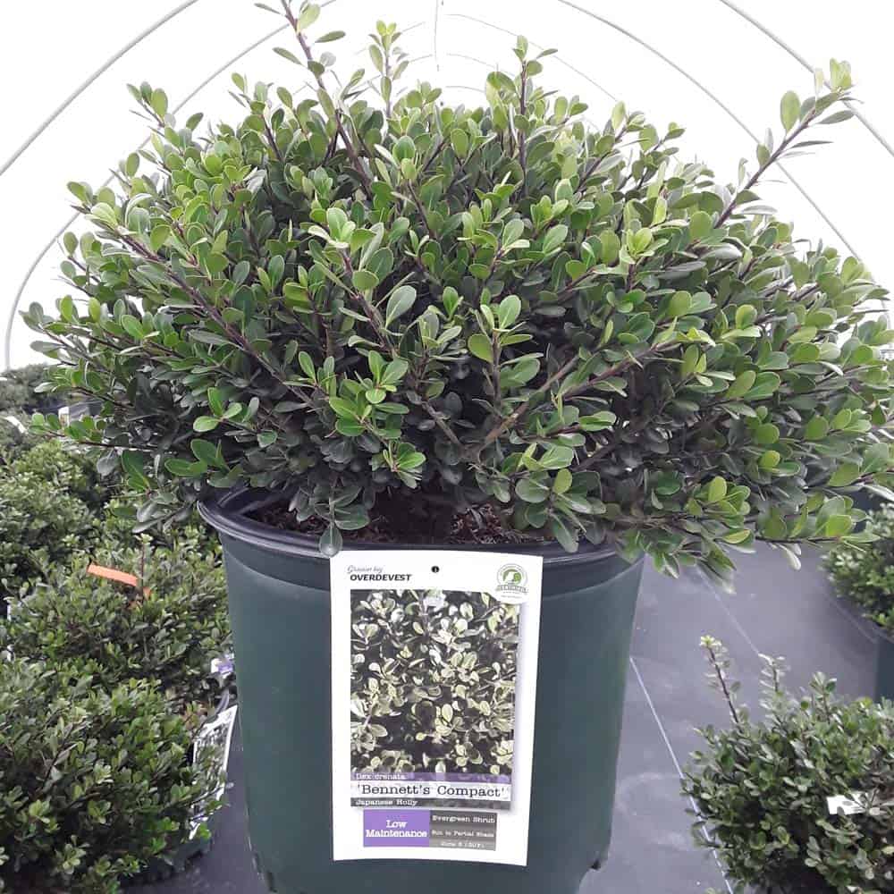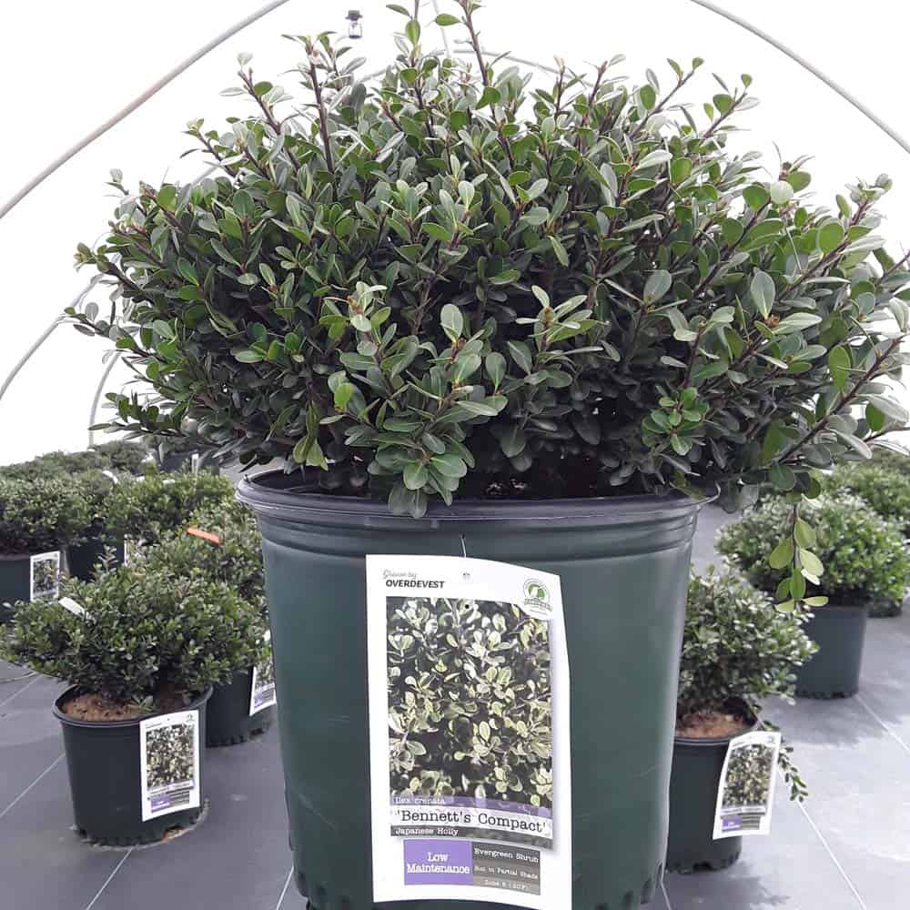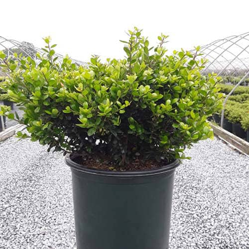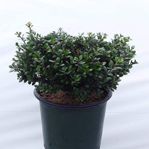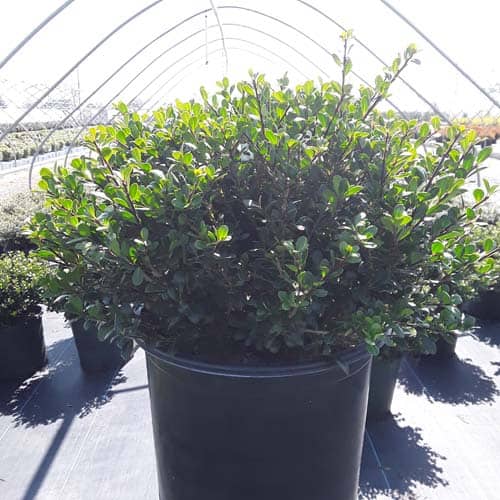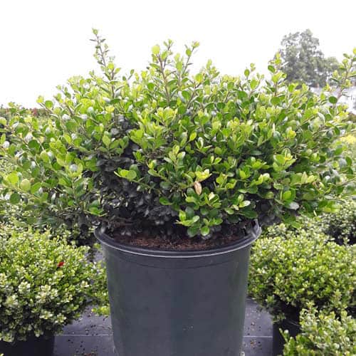 This crenata or Japanese holly type of ilex is a dense, compact shrub. It has glossy, dark green foliage and grows to about 4' high and 4' wide. This evergreen shrub is low maintenance and is ideal for shrub beds, massing, foundation plantings, and hedges. [Ilex]