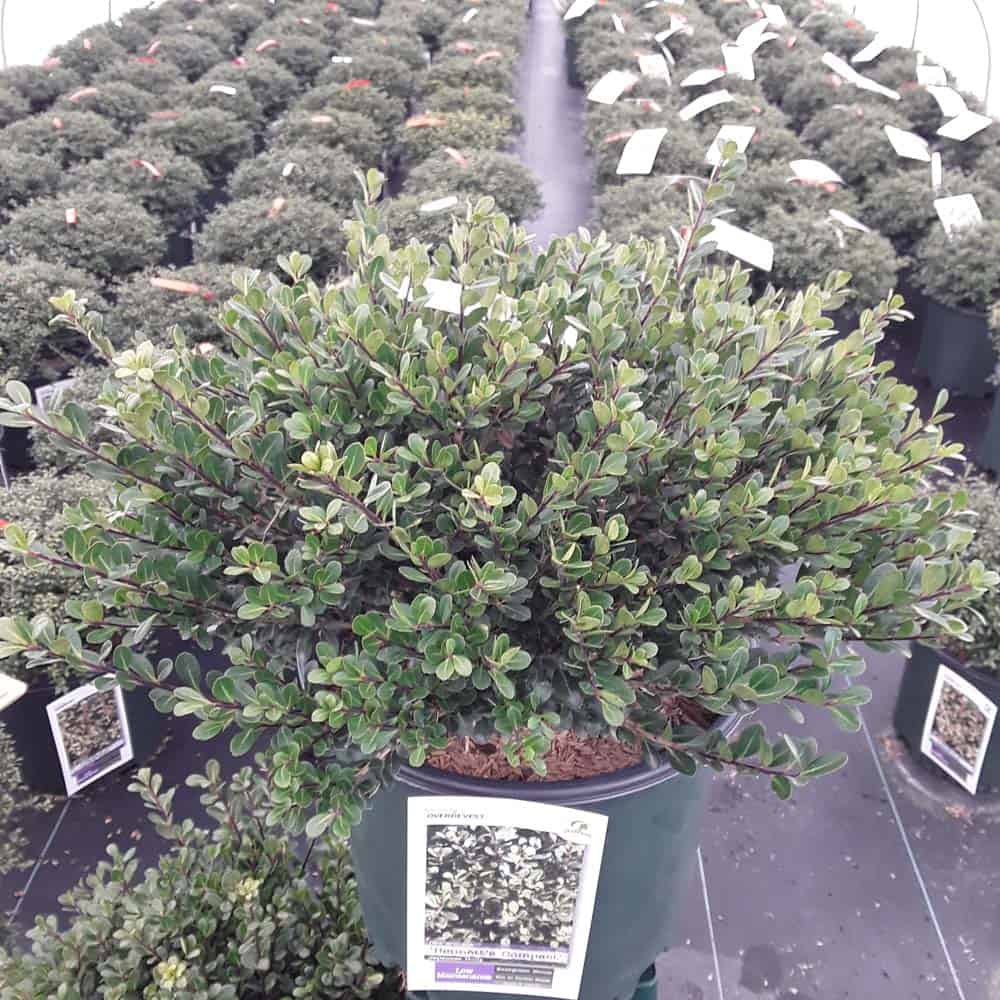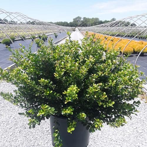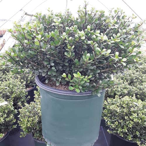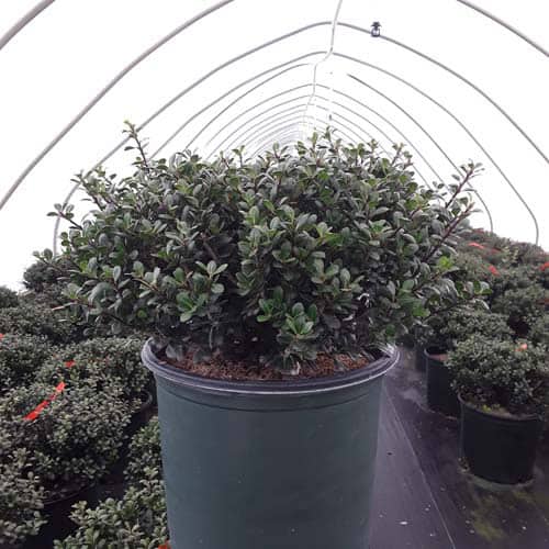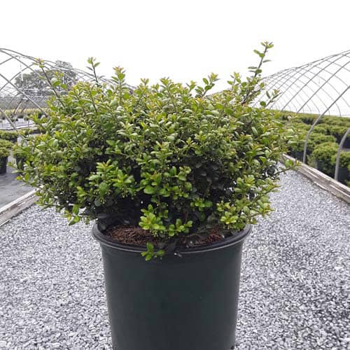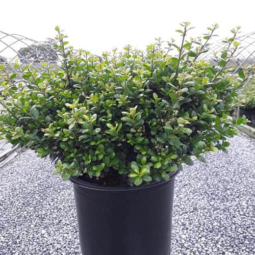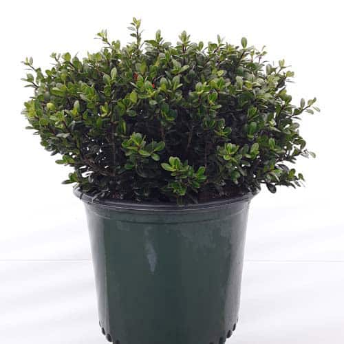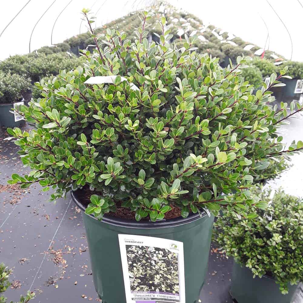 This crenata or Japanese holly type of ilex is a dense, compact shrub. It has glossy, dark green foliage and grows to about 4' high and 4' wide. This evergreen shrub is low maintenance and is ideal for shrub beds, massing, foundation plantings, and hedges. [Ilex]