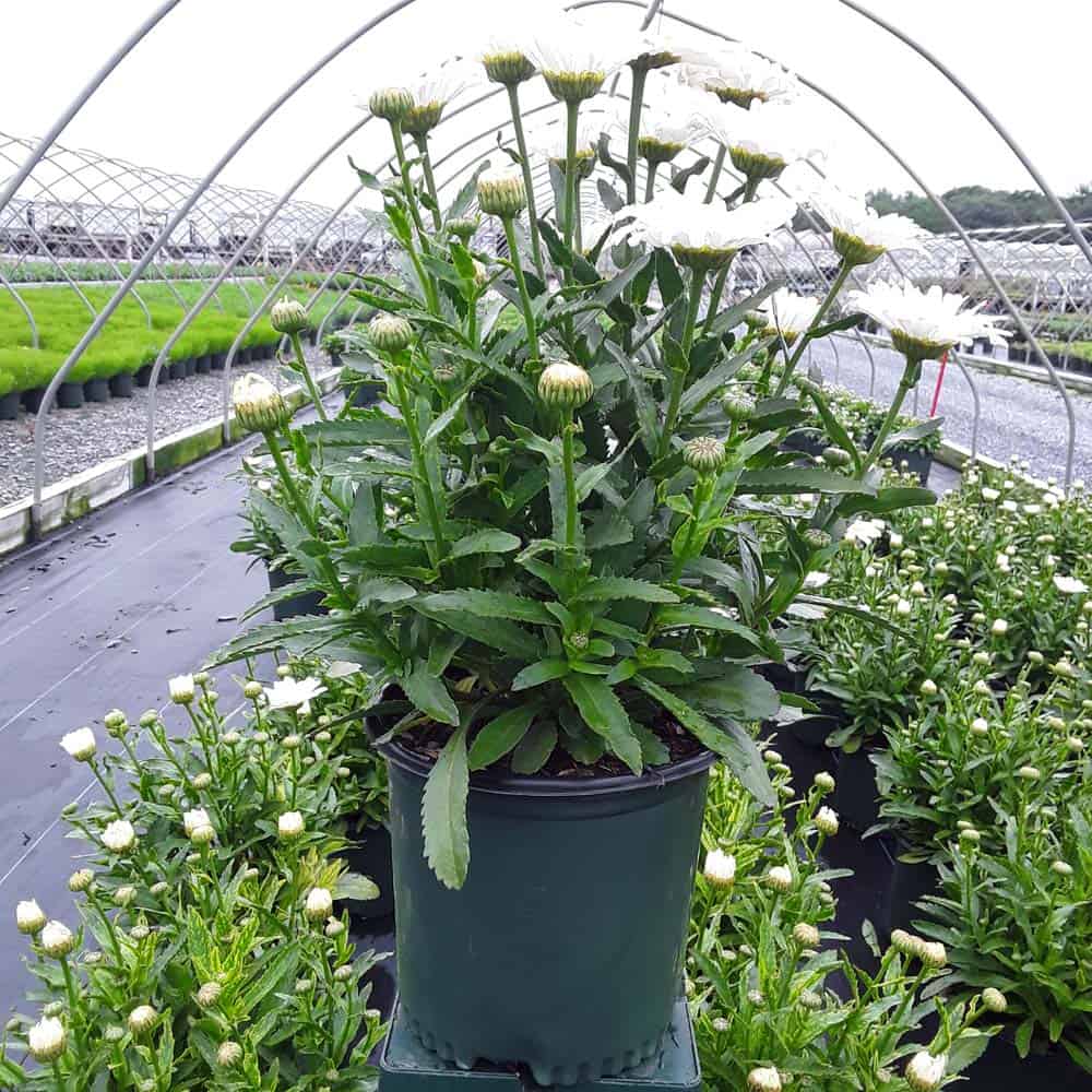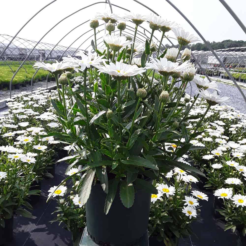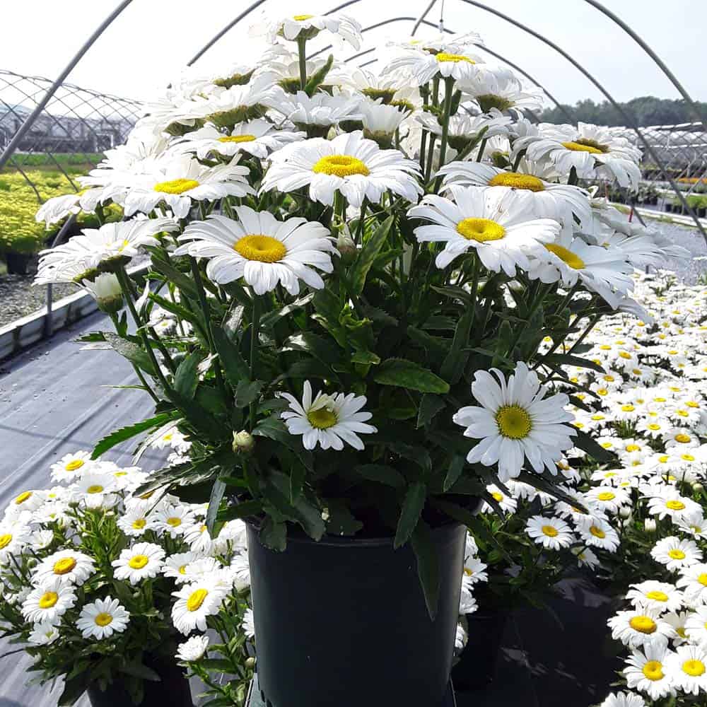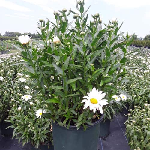 'Betsy' Shasta Daisy boasts the largest size blossoms of all shasta daisies. Flowers can grow to 5-7" across. Its white petals surround a bright yellow center and have a long bloom time. Easy to maintain, they are one of the most popular plants for perennial gardens.