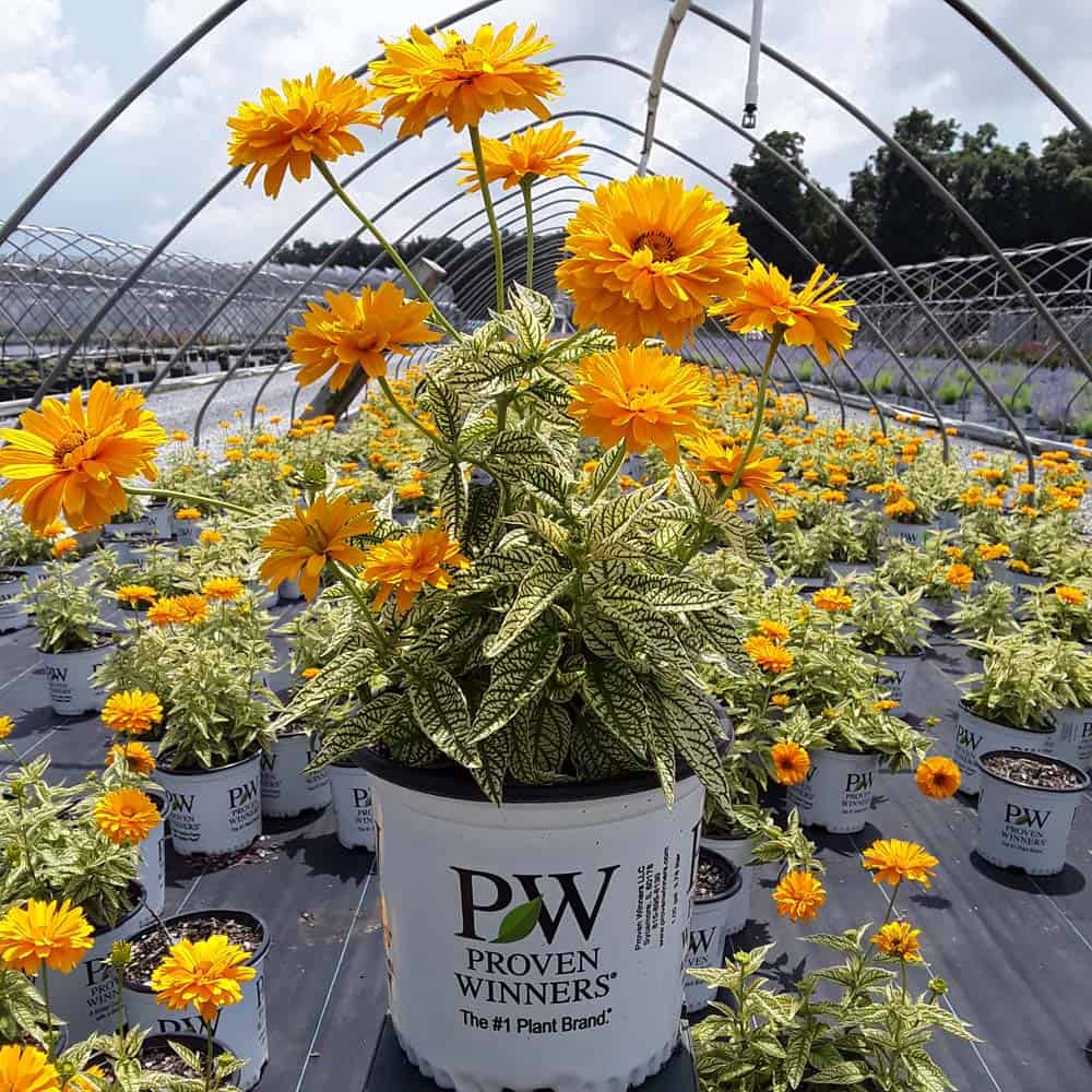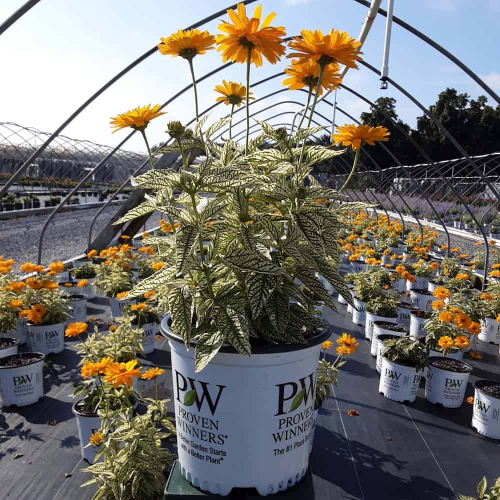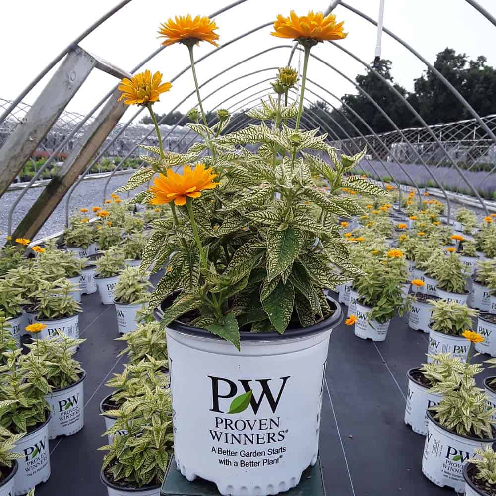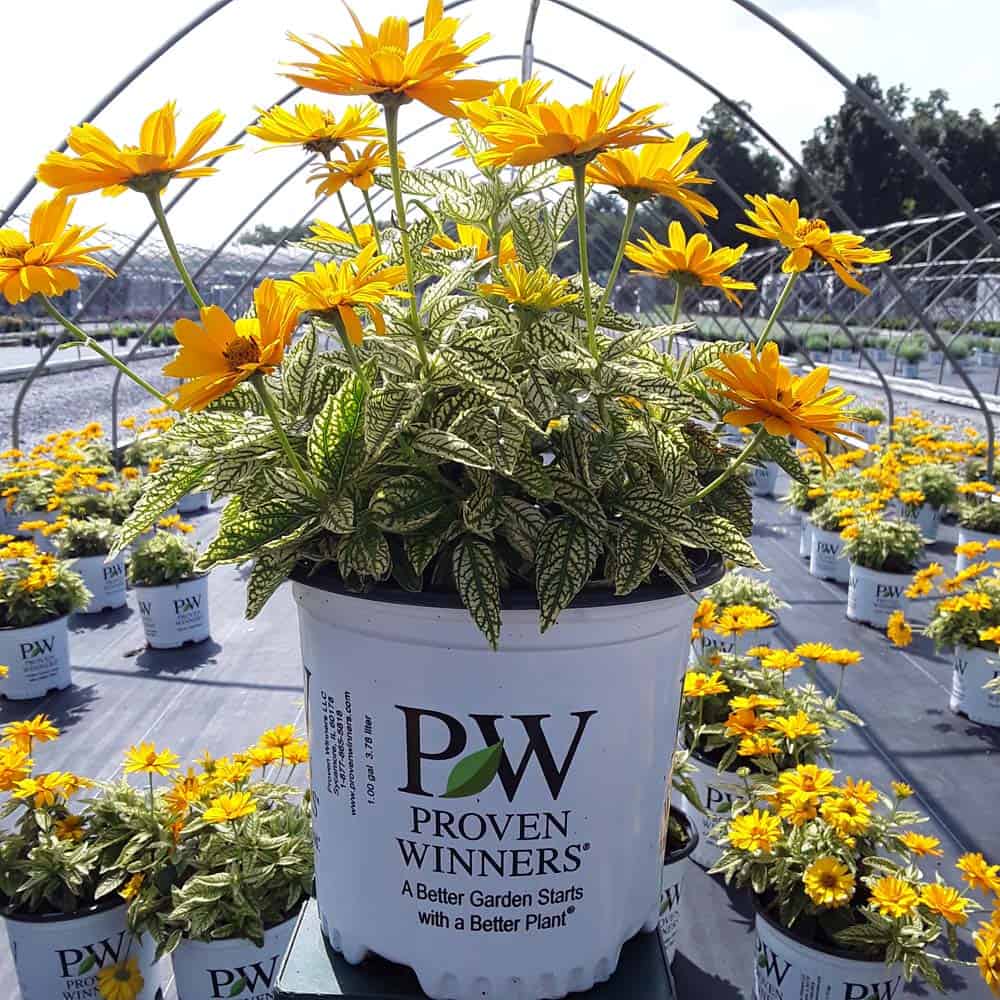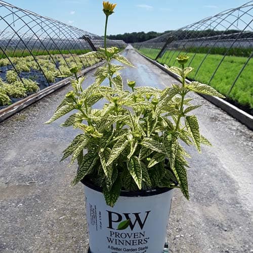 This North American Native heliopsis has variegated foliage and a low, dense habit. Its golden yellow flowers appear in mid-summer lasting to early fall. This is a hardy, easy-to-grow perennial that attracts butterflies and is great in container gardens or in front of mixed borders. [Heliopsis]