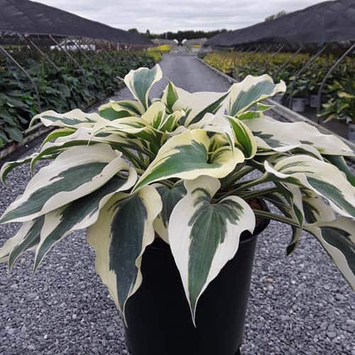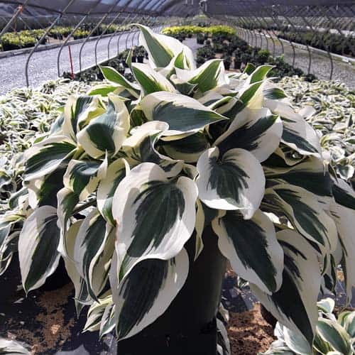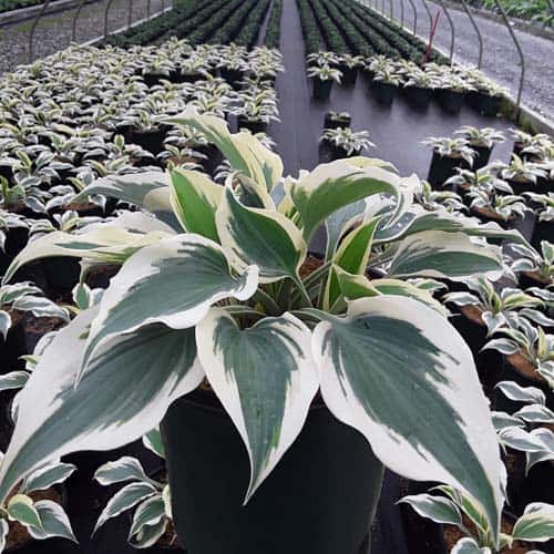"Showy sport of the ever-popular 'Halcyon', this is a medium-sized hosta with thick, slug resistant foliage. In spring, the leaves display a wide, creamy white margin and blue center, but by summer, the margins have brightened to white and the center deepens to blue-green; during the heat of late summer, a greenish blush may appear over portions of the margin. Lavender flowers are produced in midsummer." Walters Gardens [Hosta]