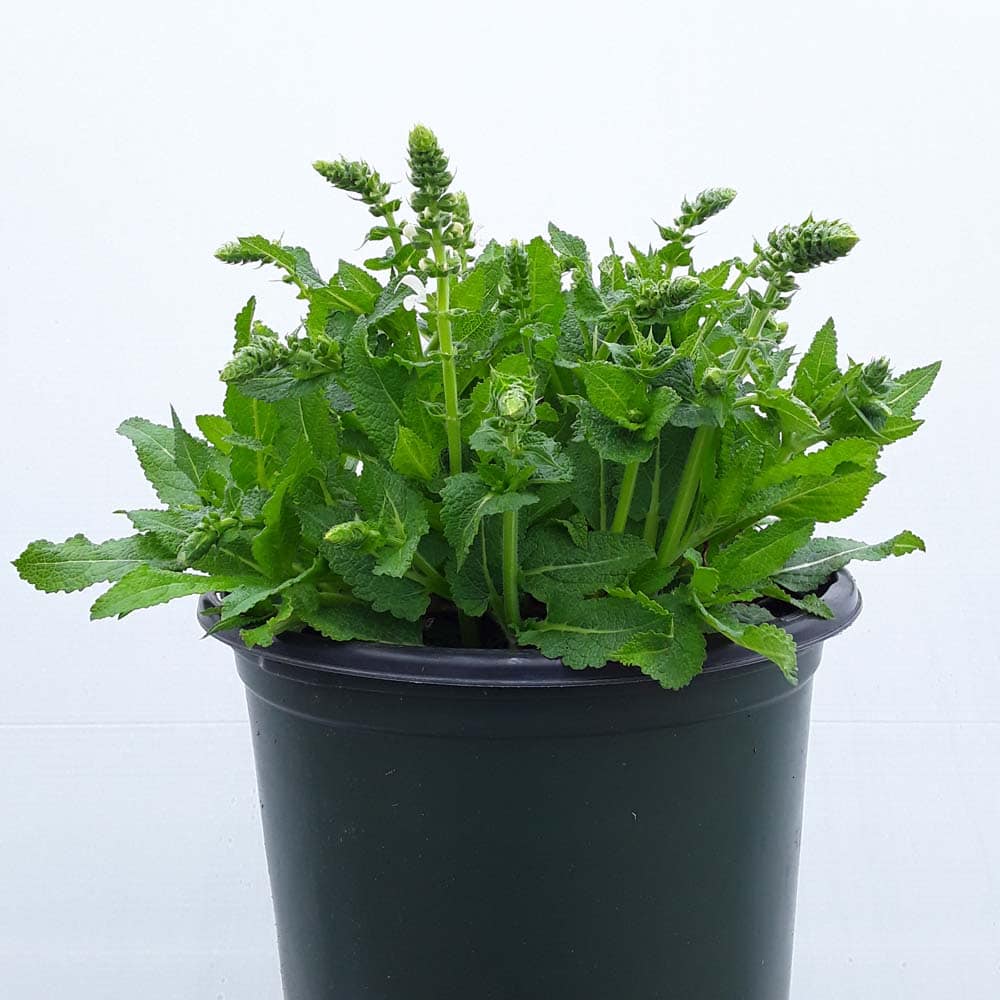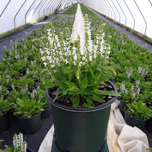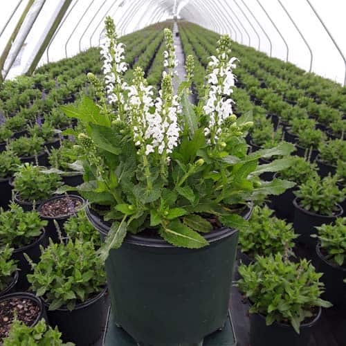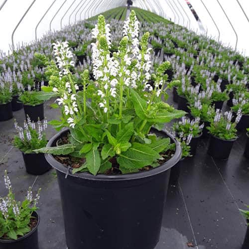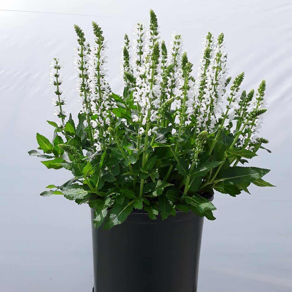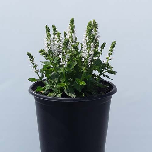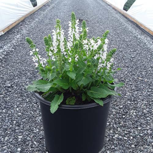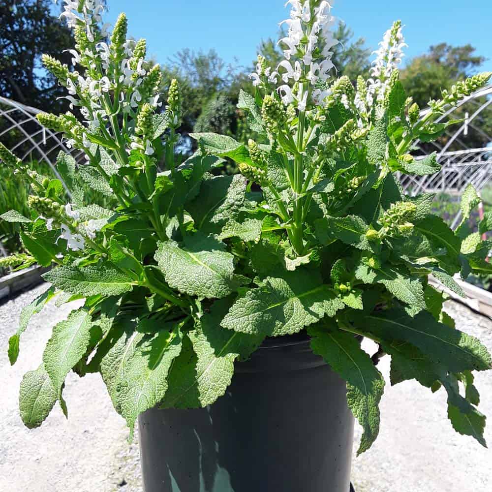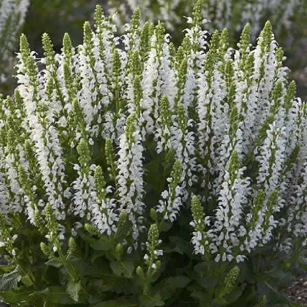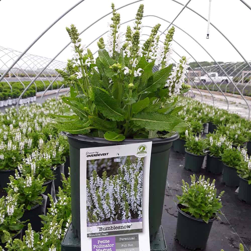 "Bumblesnow produces pure white flowers on a petite habit of attractive deep green foliage. Good rebloom if deadheaded. This cute sized package is perfect for the front of the border or grown in a quart pot." Walters Gardens [Salvia]