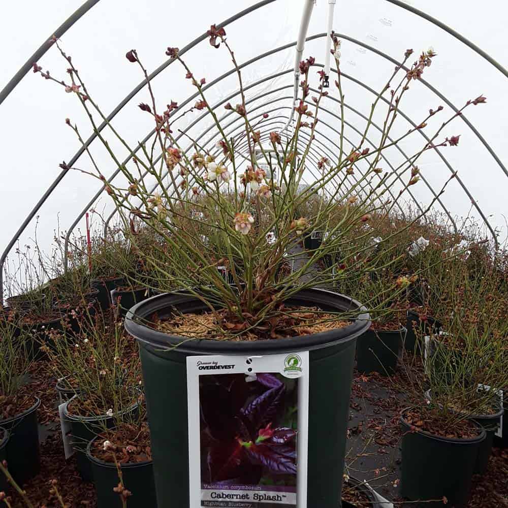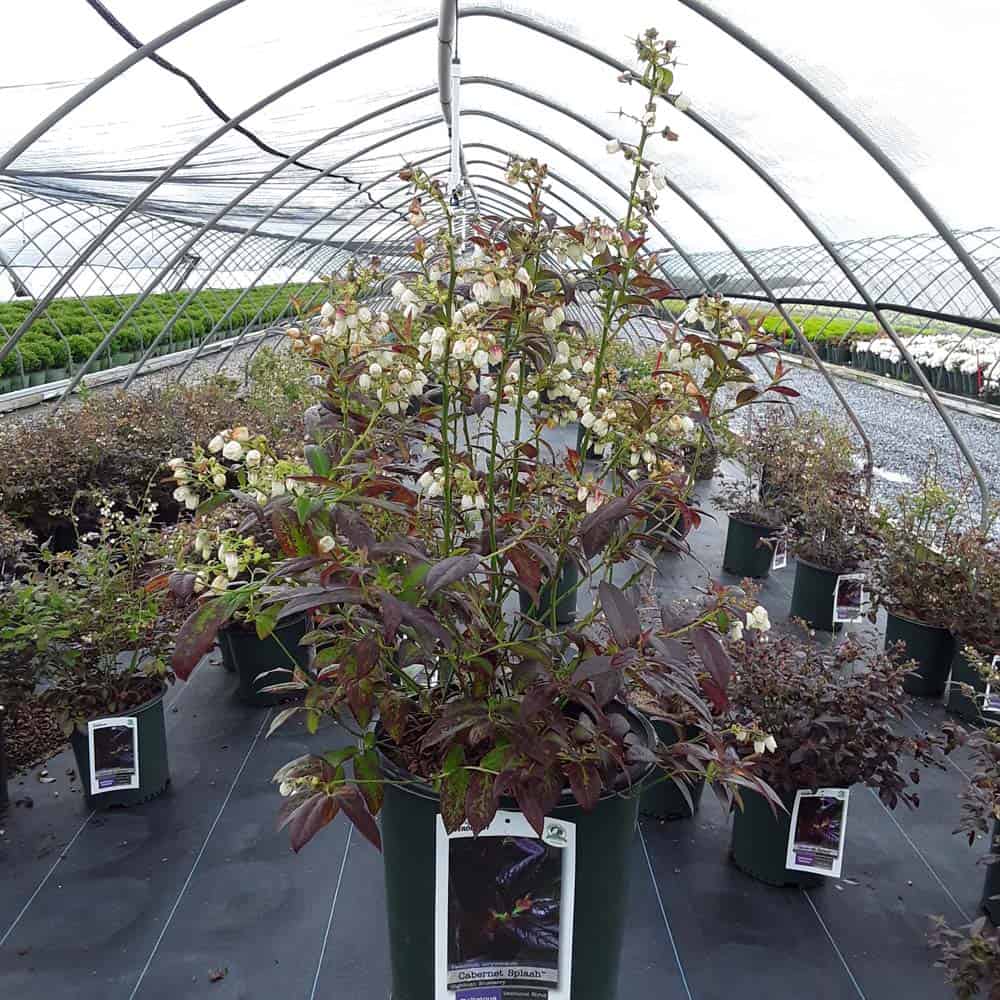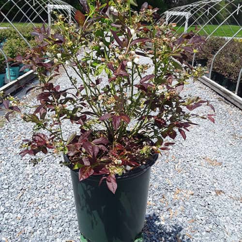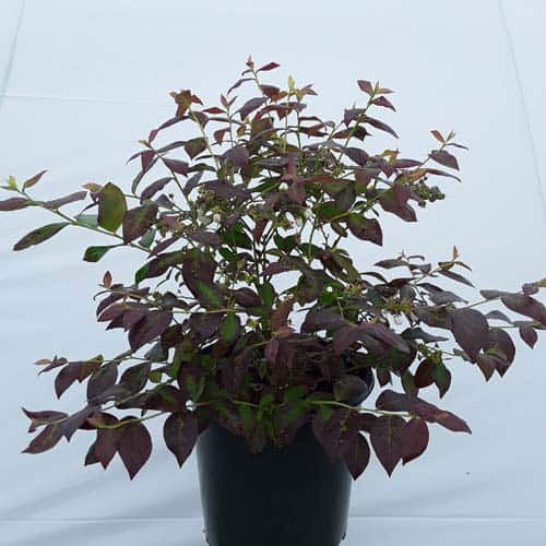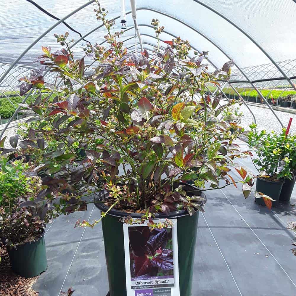"Cabernet Splash is a chance sport of Vaccinium ‘Toro’. Its new foliage emerges a deep, dark, cabernet color, then mottles cabernet-green as it matures. Cabernet Splash produces an abundance of delicious, medium sized fruits." Briggs Nursery [Vaccinium]