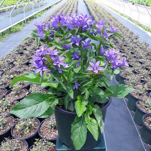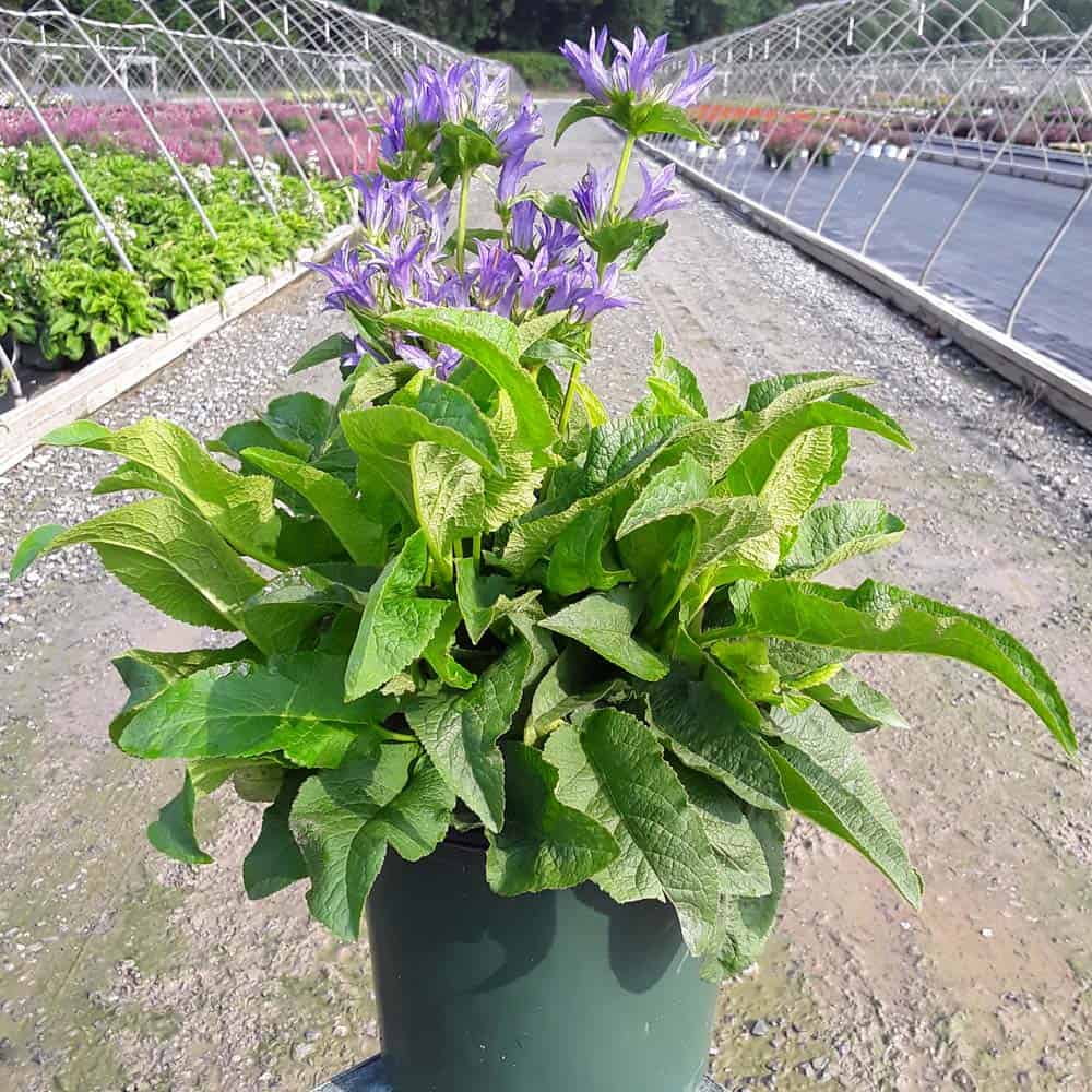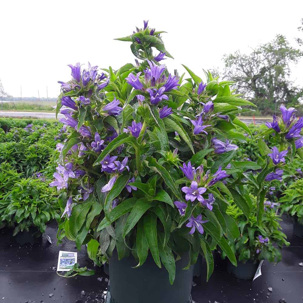 "Well-formed clusters of violet purple flowers are packed onto rich, dark green foliage. Match with its white counterpart, 'Angel Bells'. A great choice for the gardener looking for a pollinator-friendly, deer resistant perennial." Walters Gardens [Campanula]