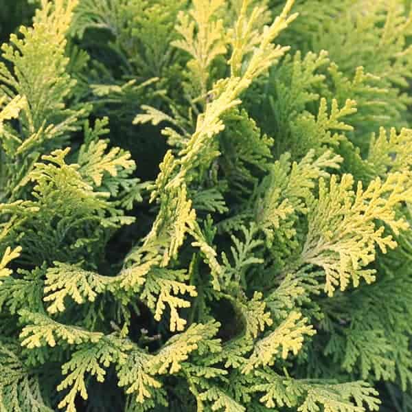 Broad, pyramidal evergreen. Lacy, fan-like leaves. Golden-yellow foliage color. Branch ends curve downward. Nice specimen or color contrast. [Chamaecyparis]