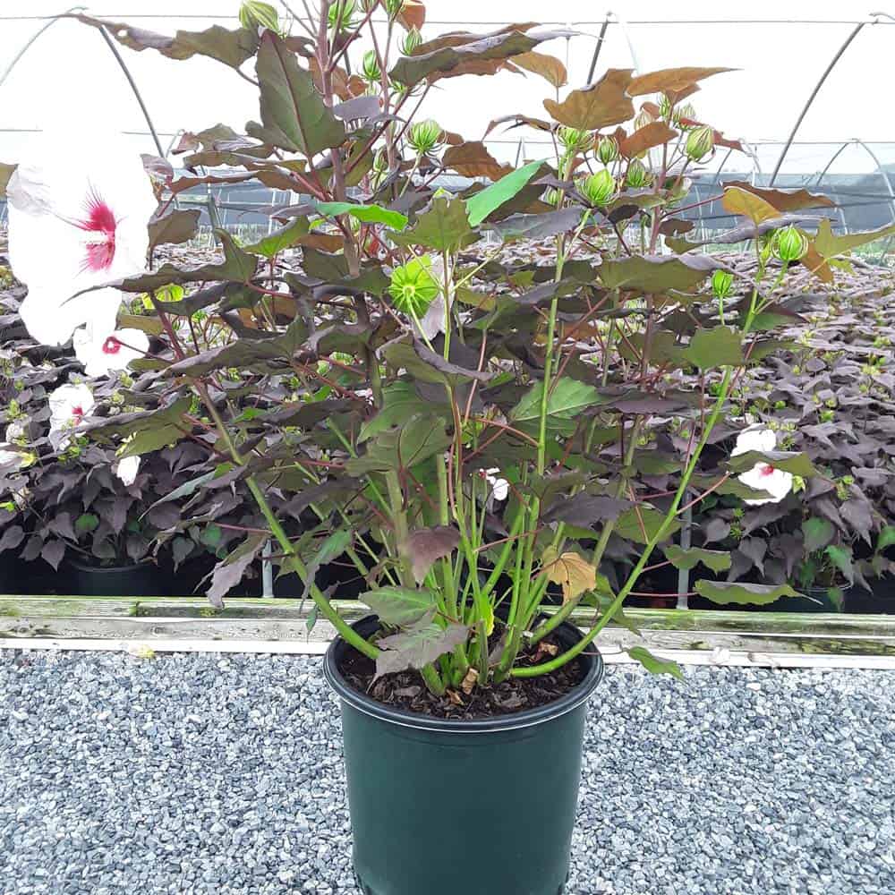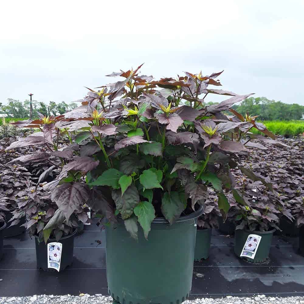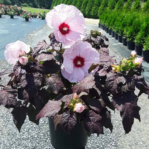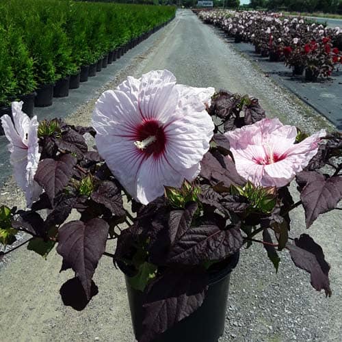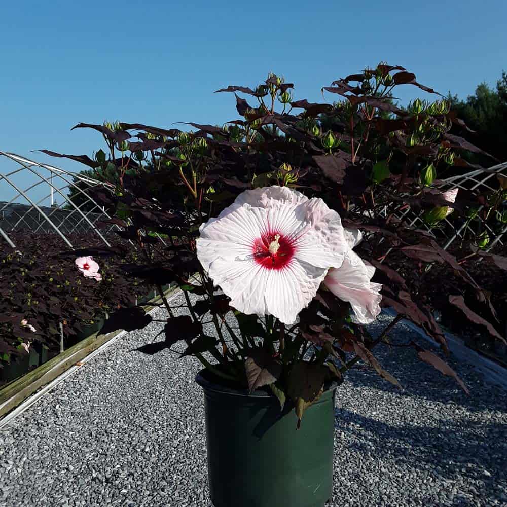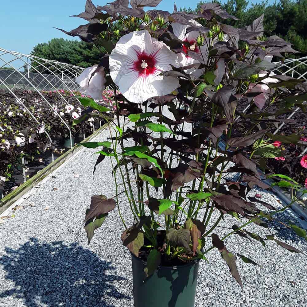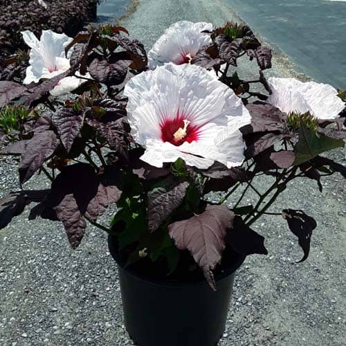 '"There's no mystery here – this Hibiscus has proven season after season to be a superior performer. Incredibly dark, wine purple foliage contrasts beautiful with the large 8-9" white flowers. Each flower has a cherry red eye and dark pink veining. Heart-shaped leaves cover the round habit. Perfect for use in large gardens, landscapes, or any place where you want to make an impact statement." Walters Gardens [Hibiscus]
