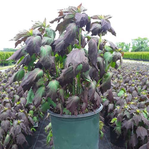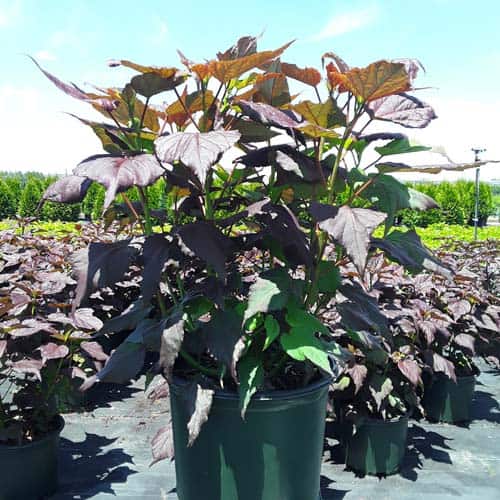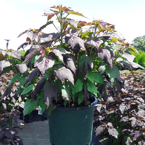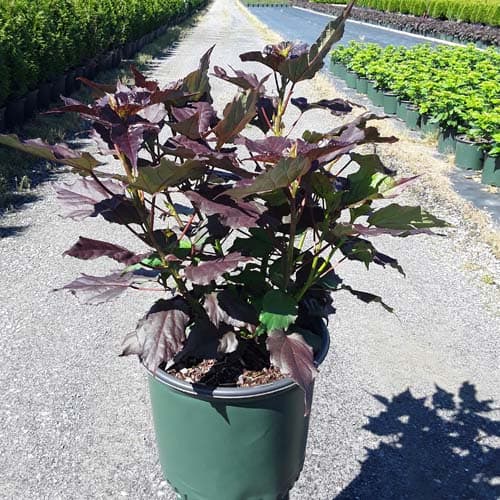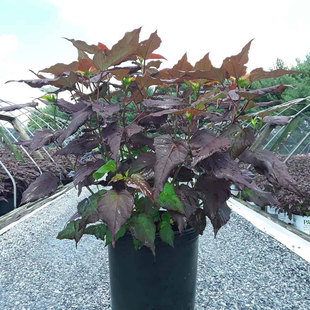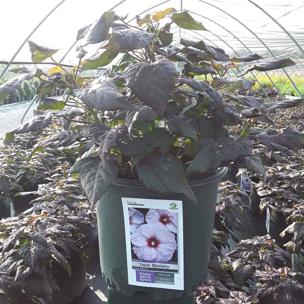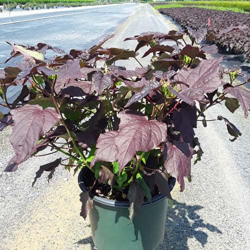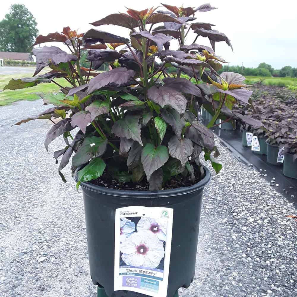 '"There's no mystery here – this Hibiscus has proven season after season to be a superior performer. Incredibly dark, wine purple foliage contrasts beautiful with the large 8-9" white flowers. Each flower has a cherry red eye and dark pink veining. Heart-shaped leaves cover the round habit. Perfect for use in large gardens, landscapes, or any place where you want to make an impact statement." Walters Gardens [Hibiscus]