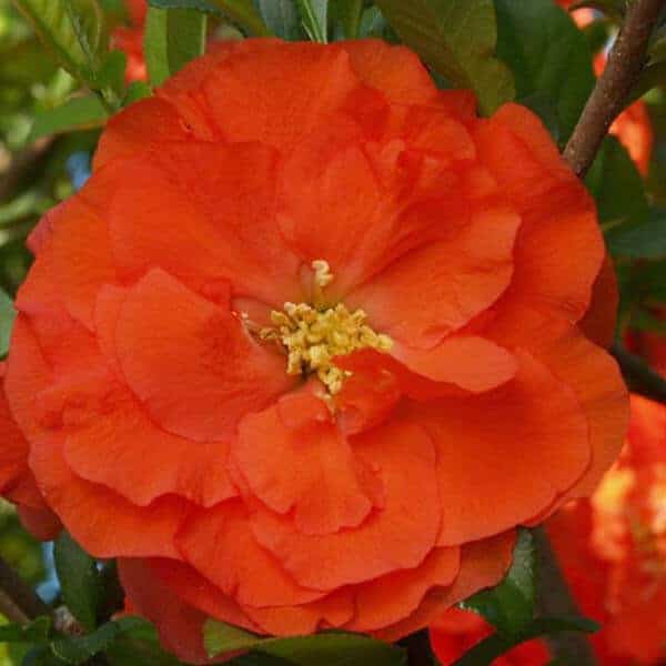 "Double Take Orange puts on a spectacular early spring display of large double flowers with intense orange color. The Double Take quince are easy to care for, having neither thorns or fruit. Once established, they are extremely drought tolerant. Developed by Dr. Tom Ranney in North Carolina, these are great plants for mixed borders and cutting gardens." -- Spring Meadow Nursery [Chaenomeles]