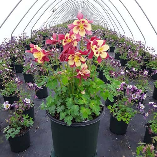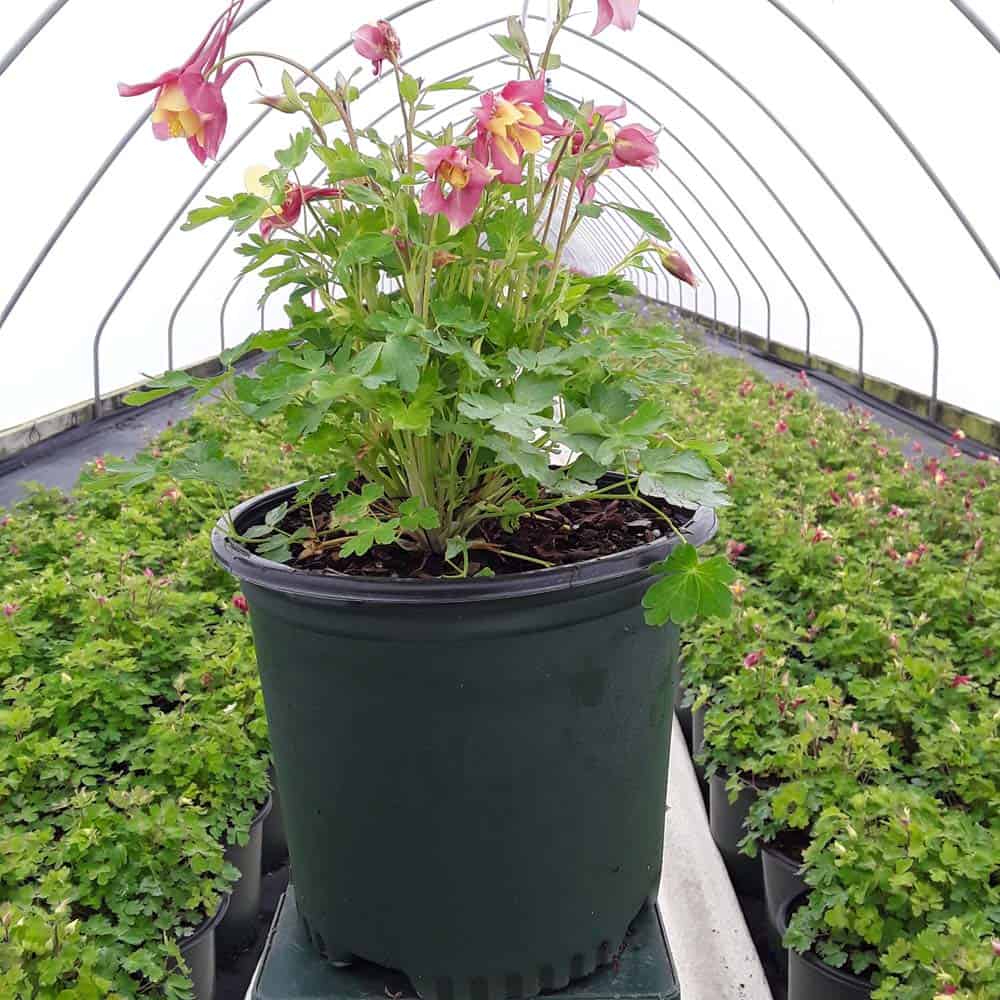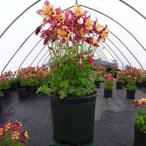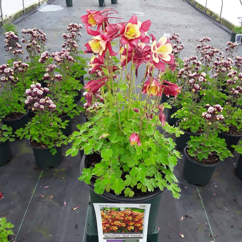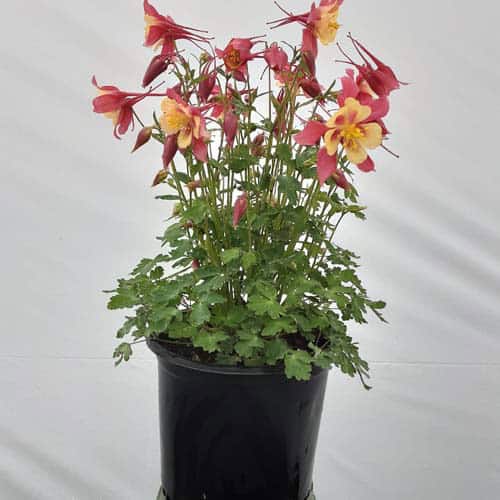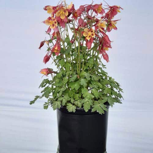 The Earlybird™ series of columbine features short stems and a well-rounded habit. Columbines are very hardy perennial plants that bloom in spring with delicate cup-shaped flowers. The two-toned flowers on this one are red with yellow centers. [Aquilegia]