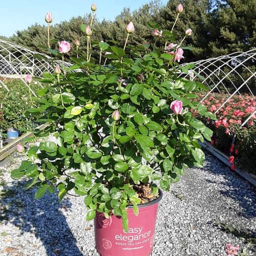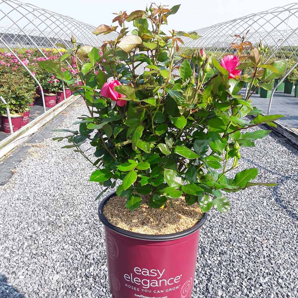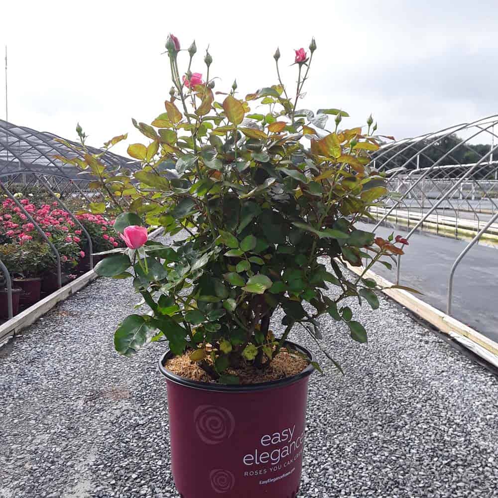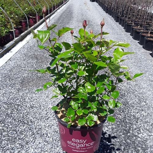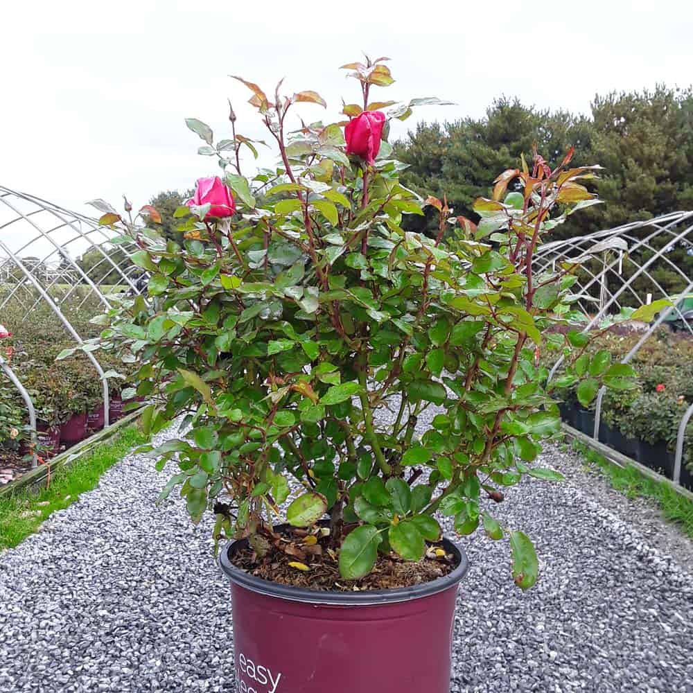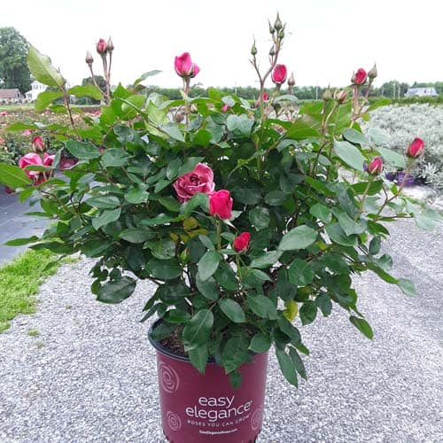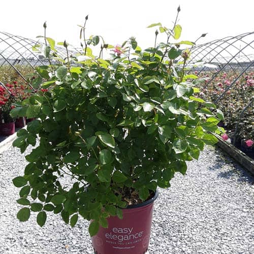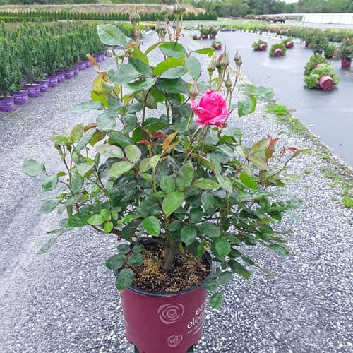 A charming Easy Elegance® selection with deep pink buds that open to paler pink Hybrid Tea type flowers, produced in small clusters it flowers reliably from early summer to frost. This low maintenance, easy to grow variety has glossy, green foliage with excellent disease resistance. [Rosa]