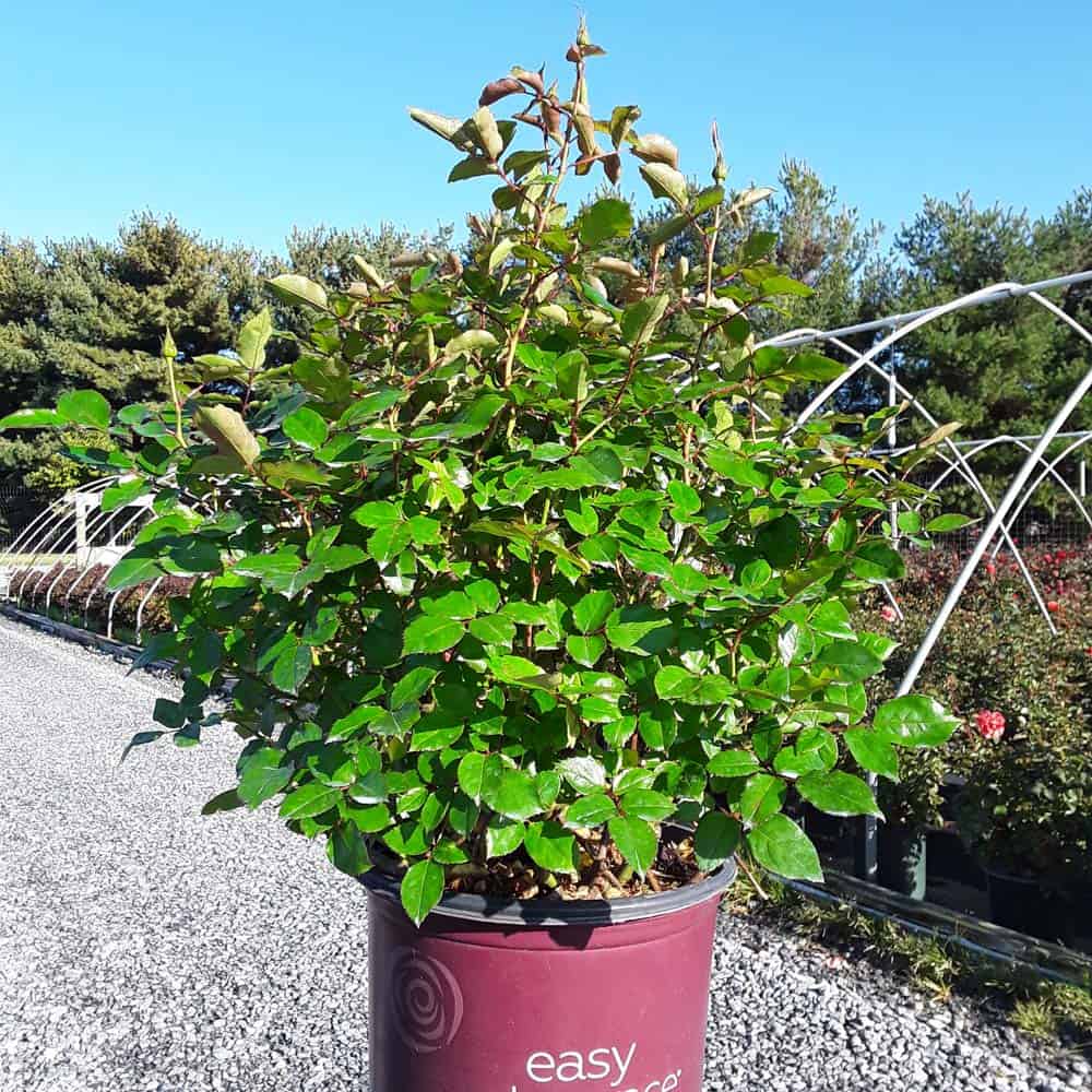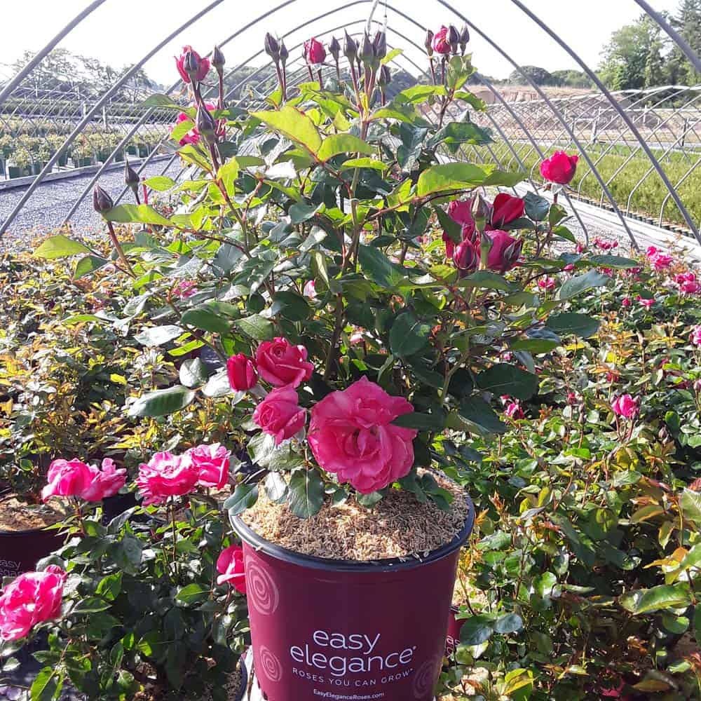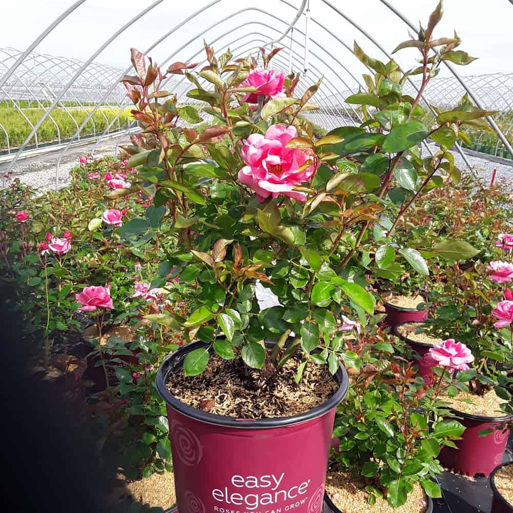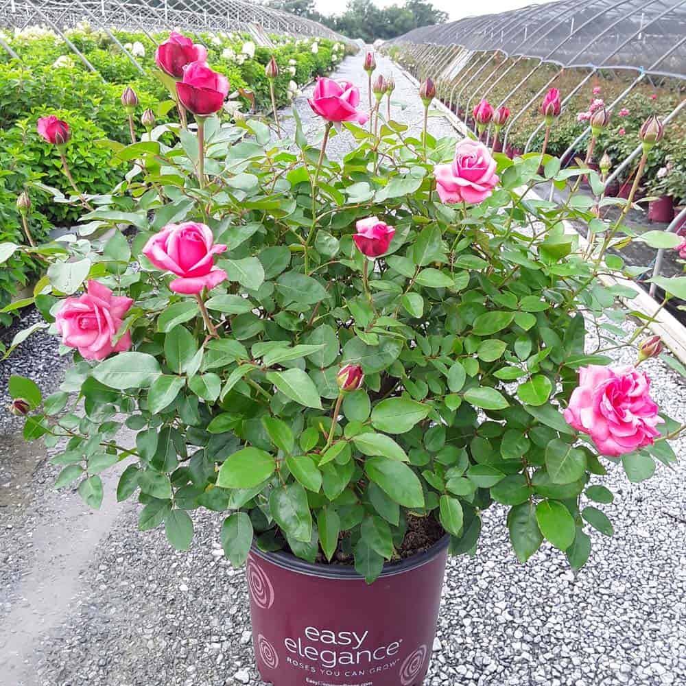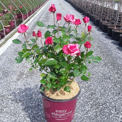 A charming Easy Elegance® selection with deep pink buds that open to paler pink Hybrid Tea type flowers, produced in small clusters it flowers reliably from early summer to frost. This low maintenance, easy to grow variety has glossy, green foliage with excellent disease resistance. [Rosa]