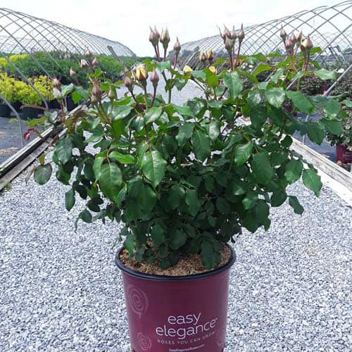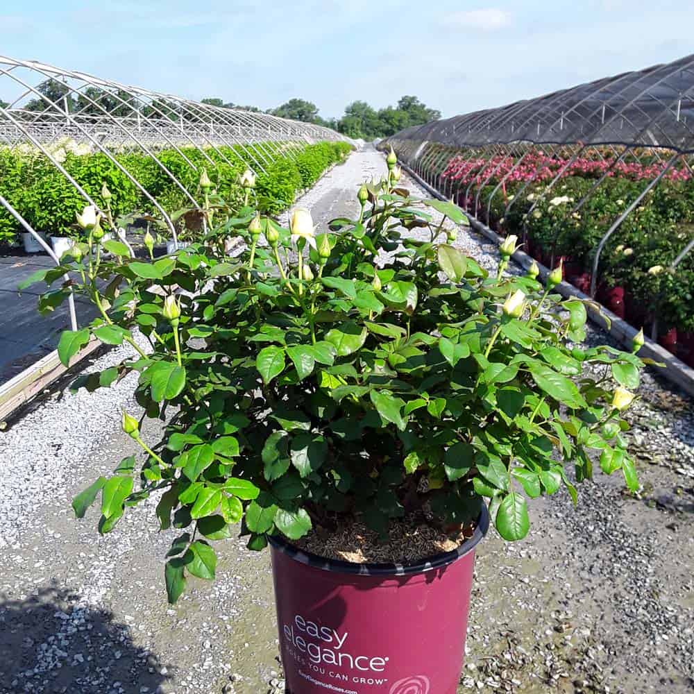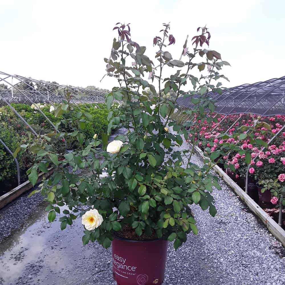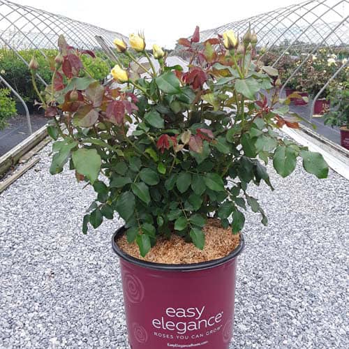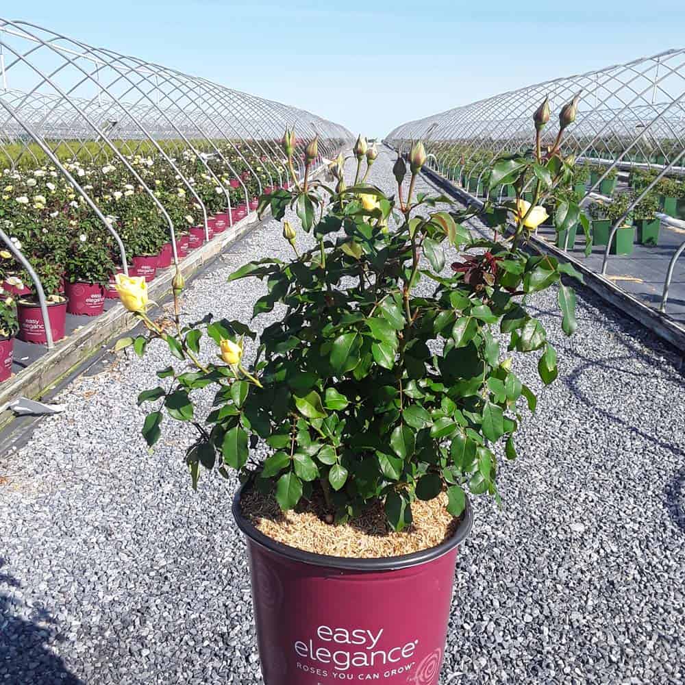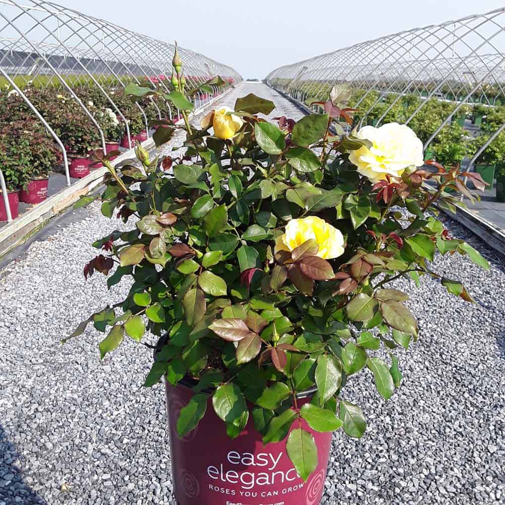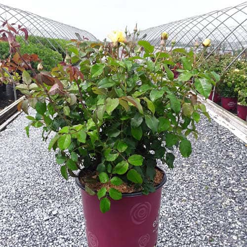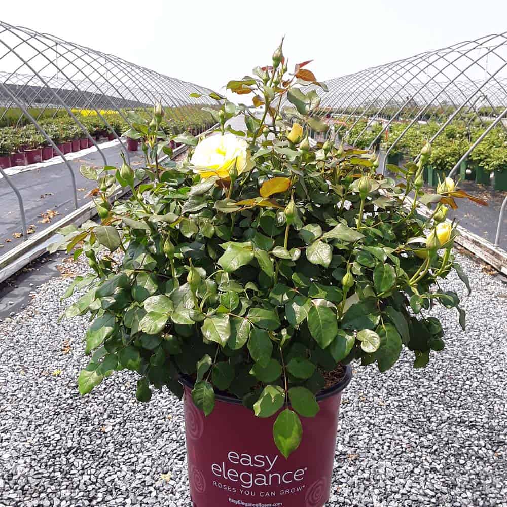 A bright, beaming Easy Elegance® selection with sunshine yellow double flowers that change with maturity to soothing lemon shades. Flowering recurrently on strong, upright stems from early summer to frost, this hardy, low maintenance, easy to grow variety has glossy, green foliage with excellent disease resistance. [Rosa]