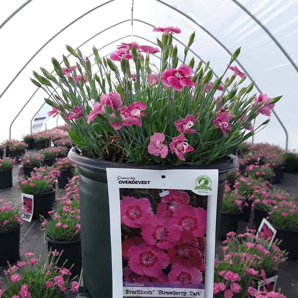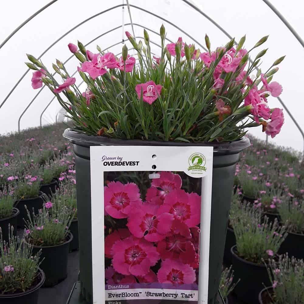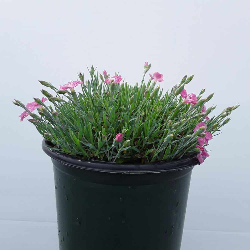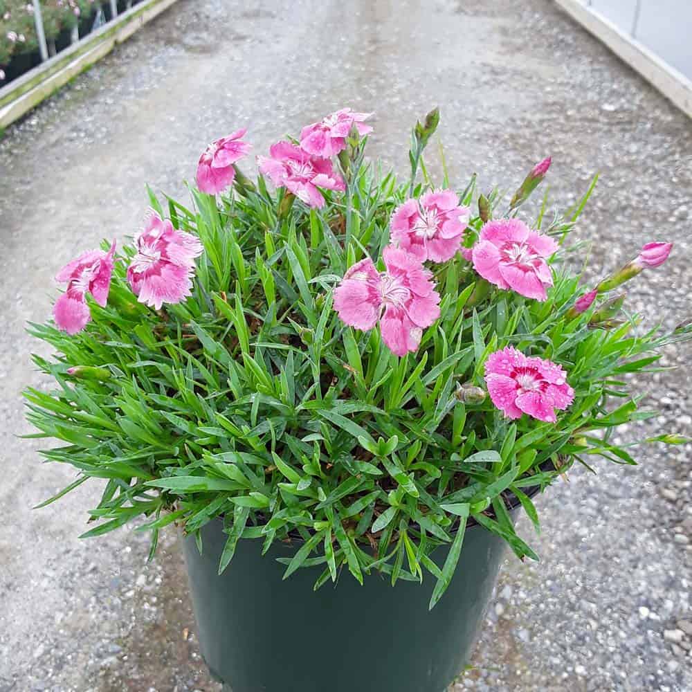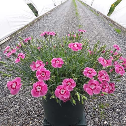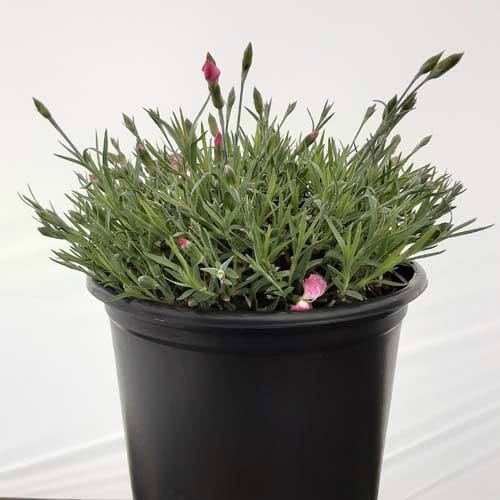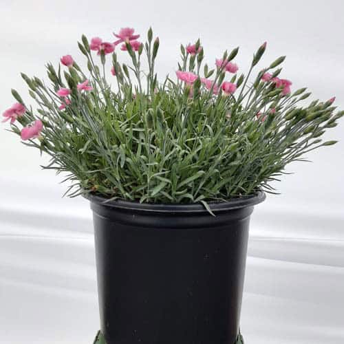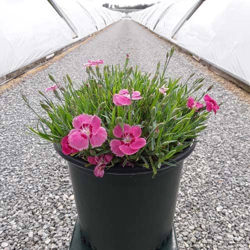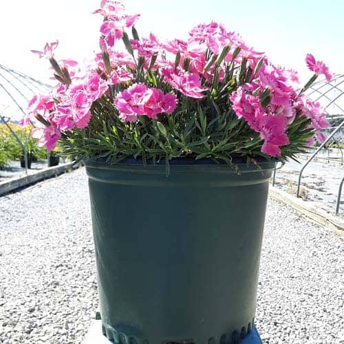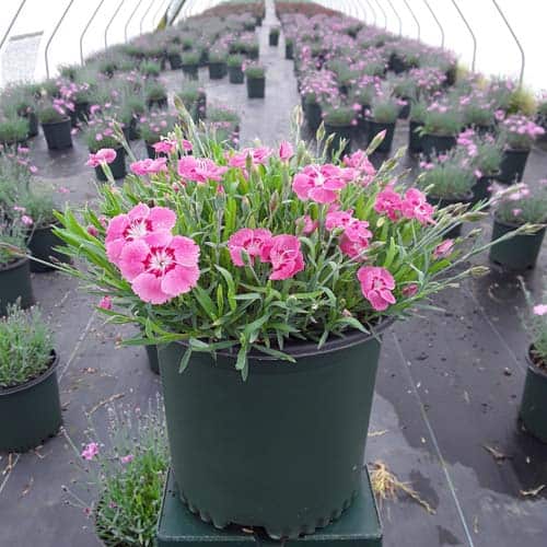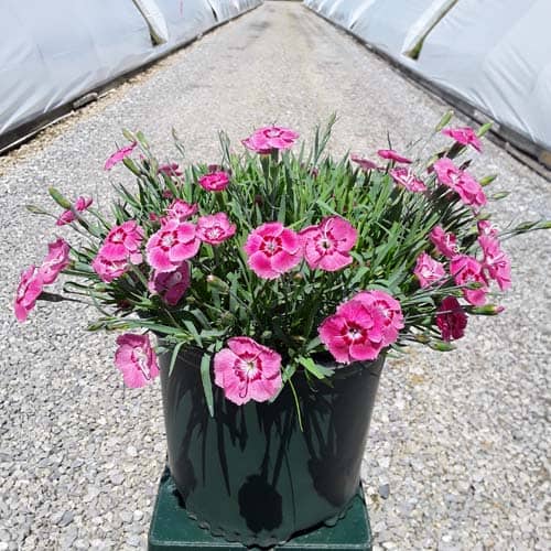 The flowers of this dianthus are a pretty pink with a red center and bloom nonstop from spring all the way through fall. This dianthus is 6-8" tall but has flowers as large as quarters. This vigorous and hardy grower is great as a border plant or in a patio container. [Dianthus]