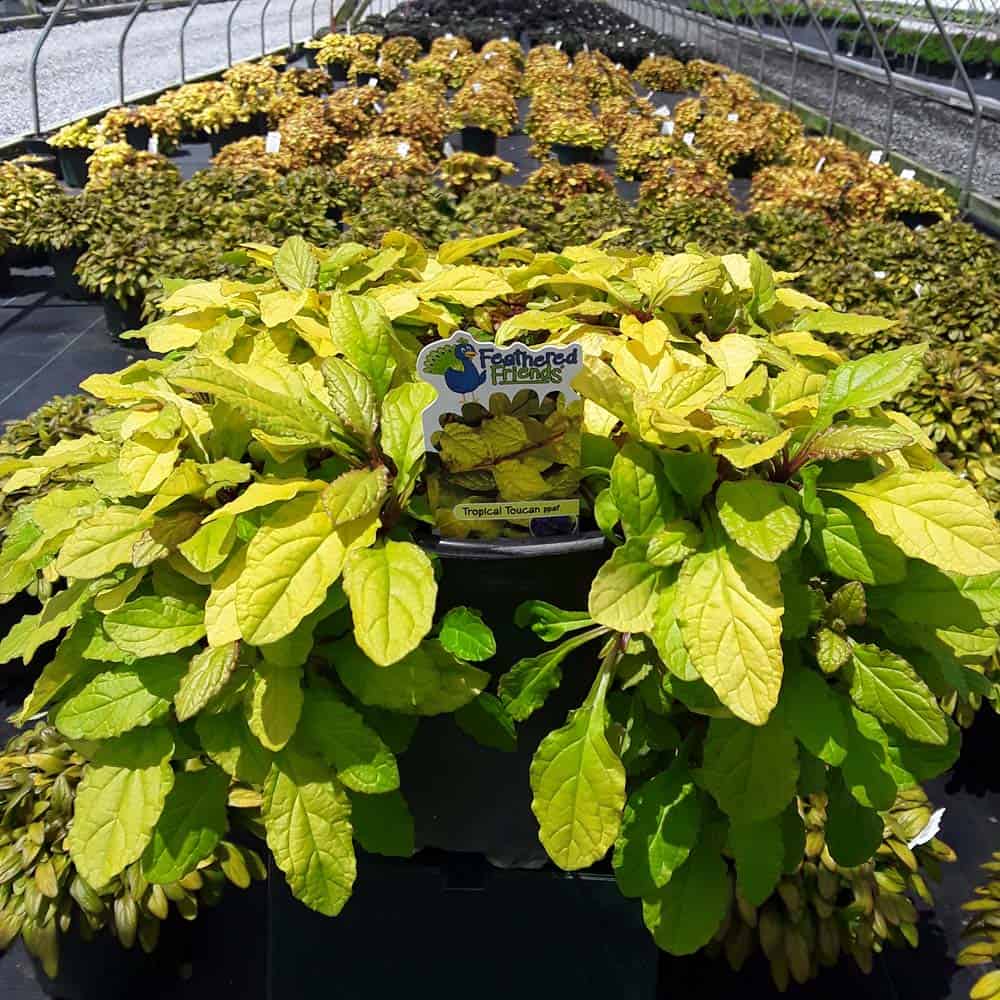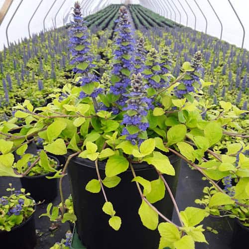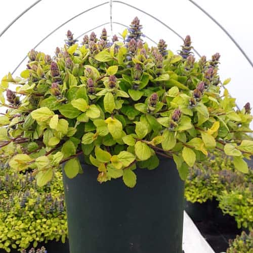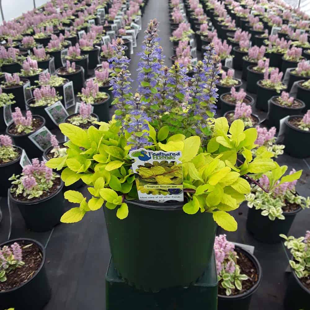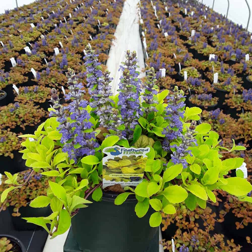 Feathered Friends™ is a new 2021 series of colorful, easy care ajuga. Low growing and easily maintained they are great groundcovers, and perfect for container plantings. Tropical Toucan is the first gold, big leaved ajuga with vividly contrasting cobalt blue flowers. [Ajuga]
