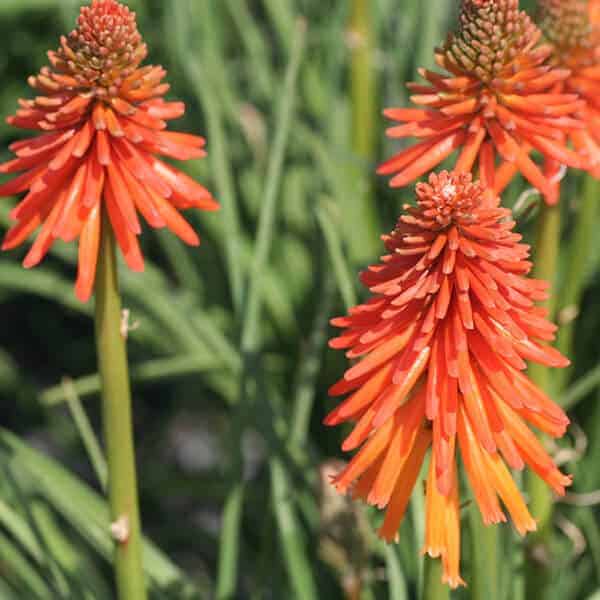 Bi-color orange and red flower spikes bloom from August to frost. [Kniphofia]