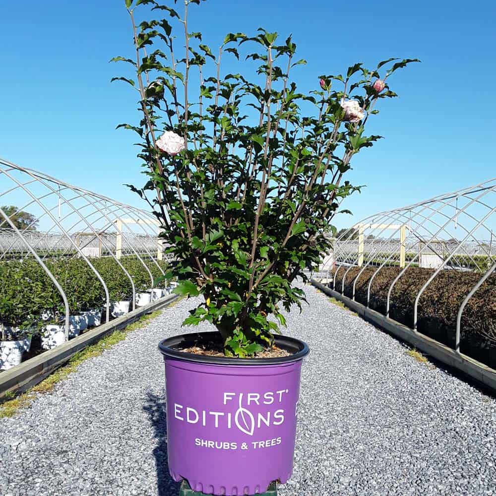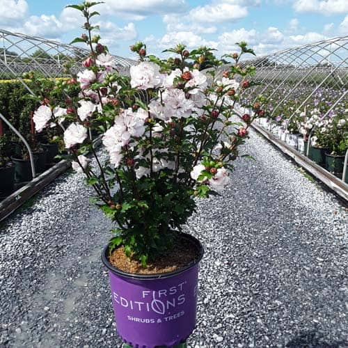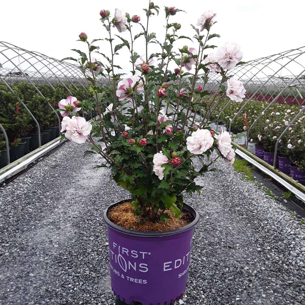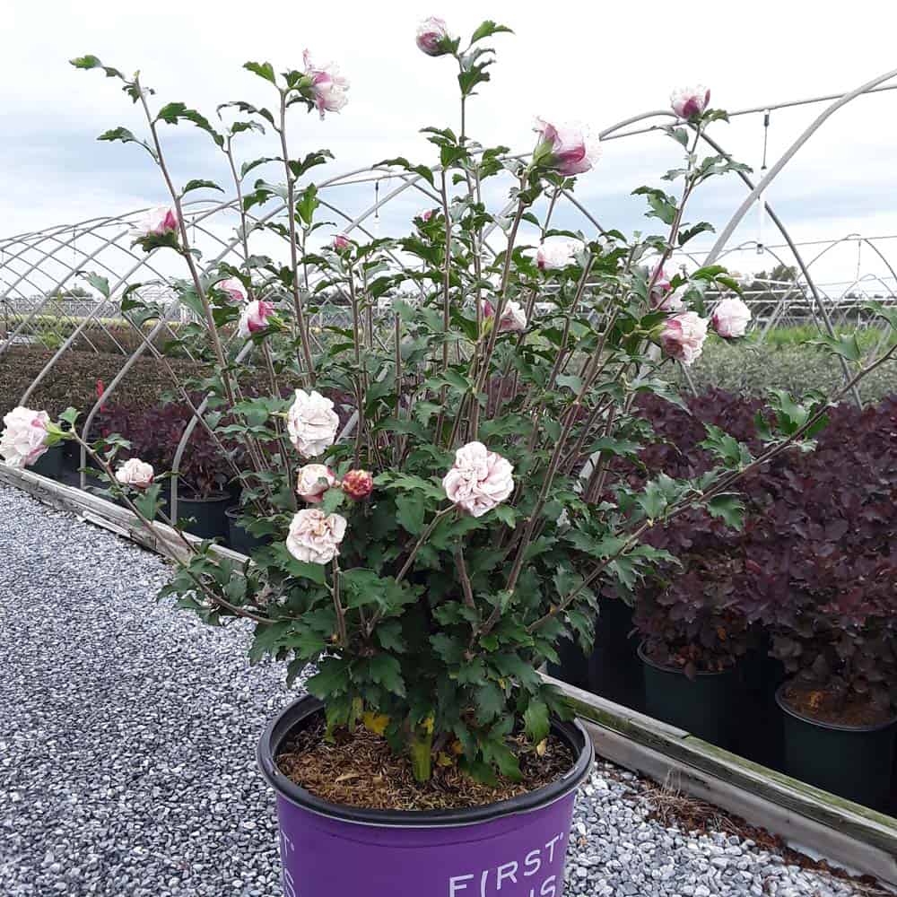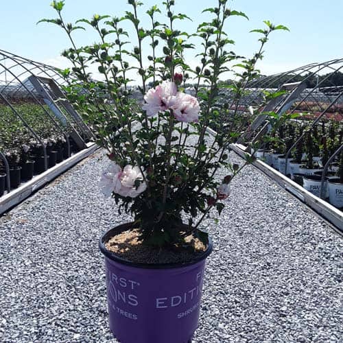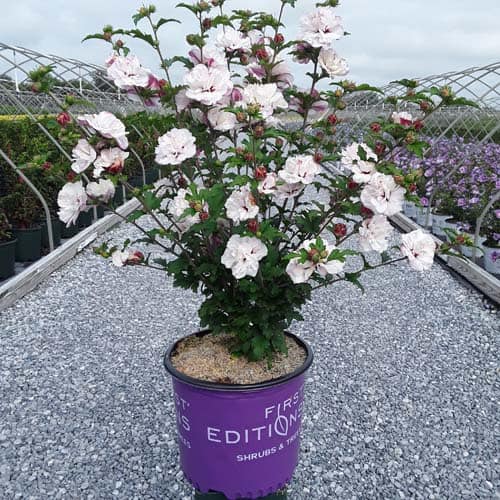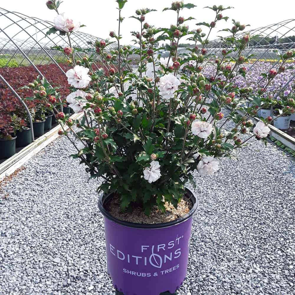 "Dark pink flower buds open to a delicate blush pink with shades of white. Large, double, pompom flowers bloom profusely from July to October. Compact in size with an upright habit. Heat tolerant, drought tolerant and adapted to alkaline soils." First Editions, Bailey Nurseries [Hibiscus]
