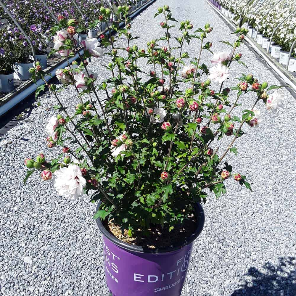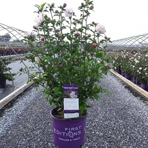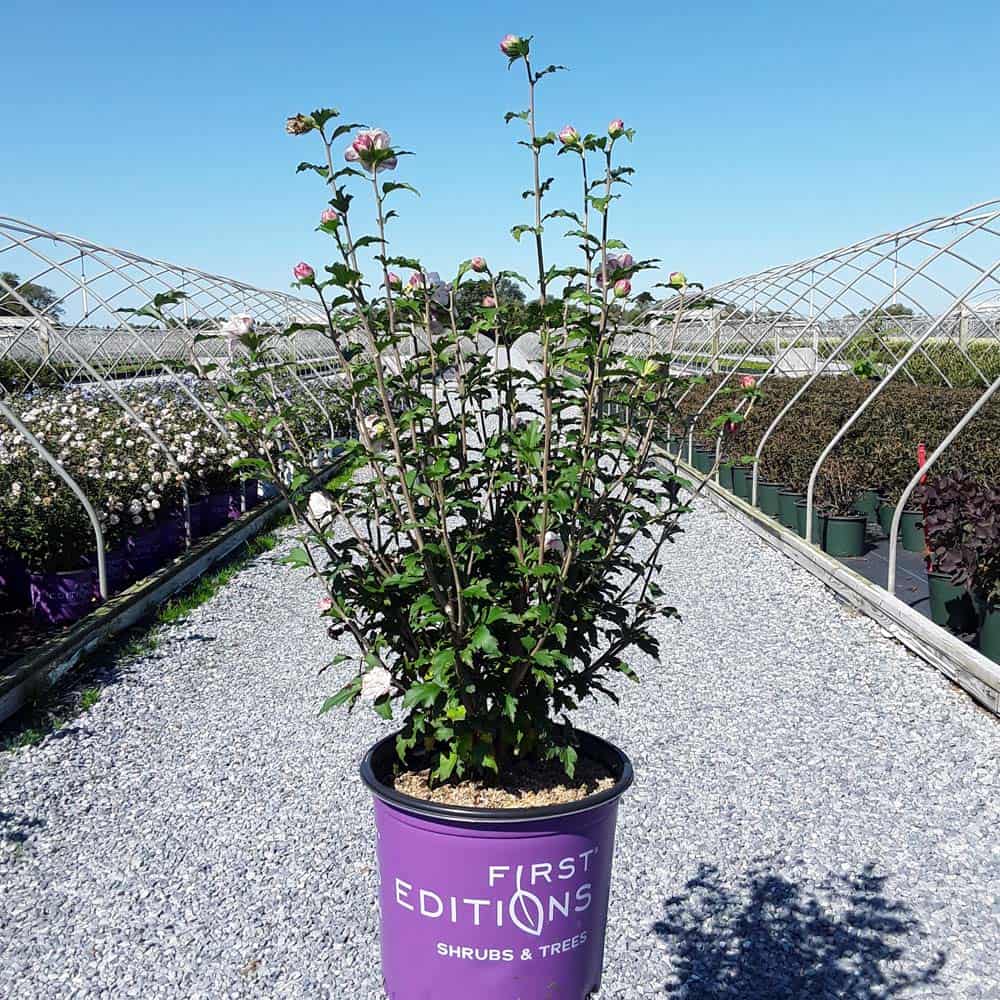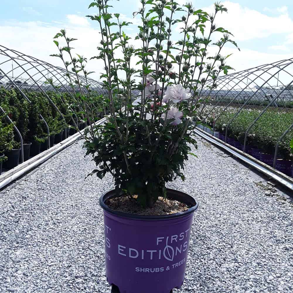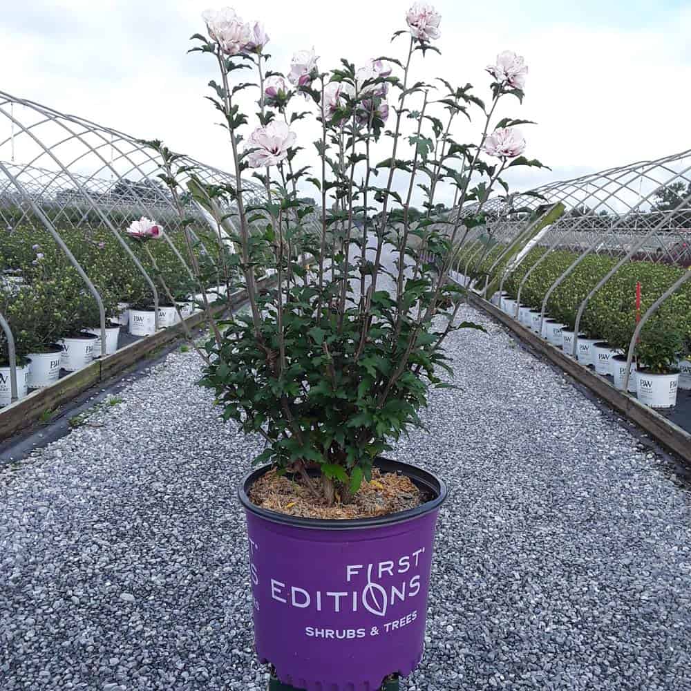 "Dark pink flower buds open to a delicate blush pink with shades of white. Large, double, pompom flowers bloom profusely from July to October. Compact in size with an upright habit. Heat tolerant, drought tolerant and adapted to alkaline soils." First Editions, Bailey Nurseries [Hibiscus]