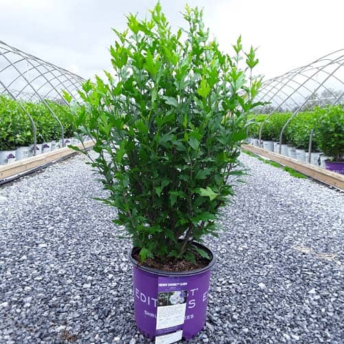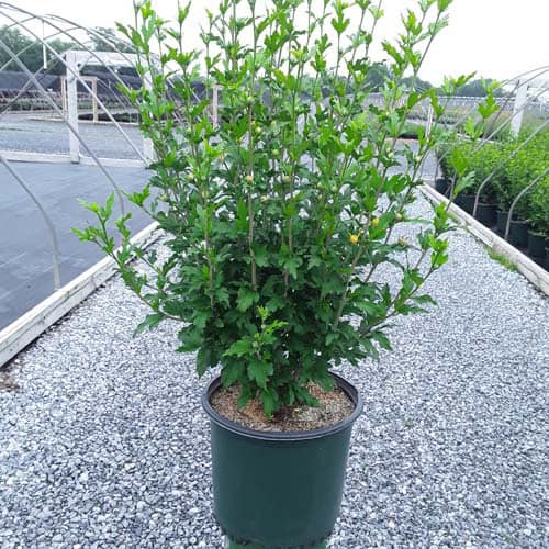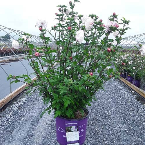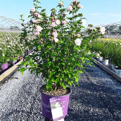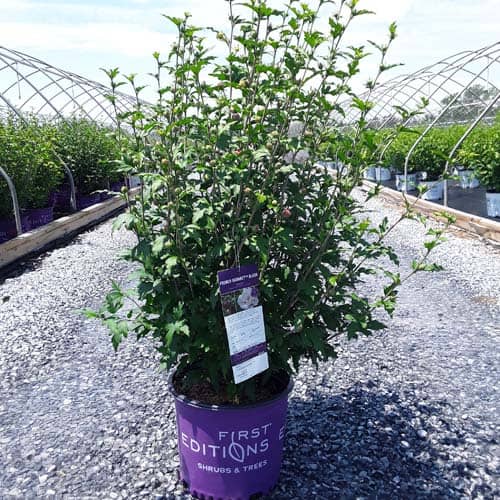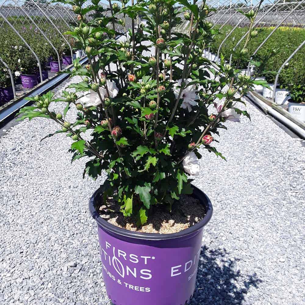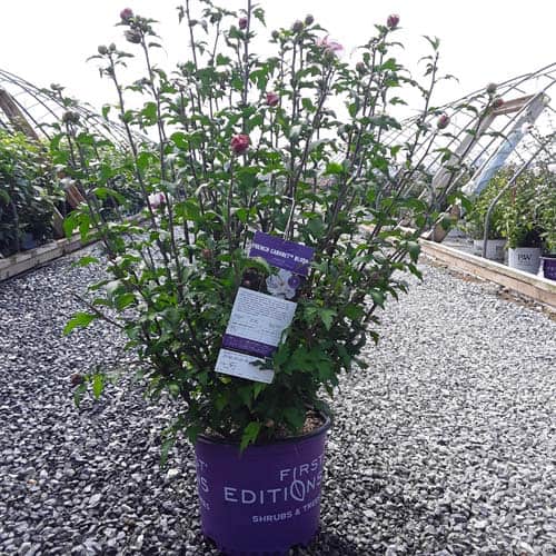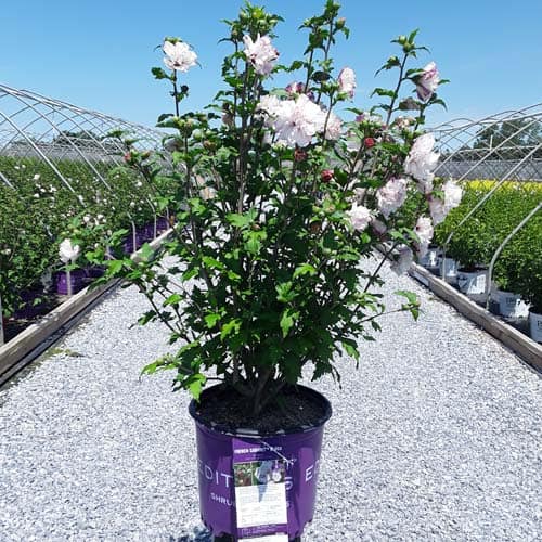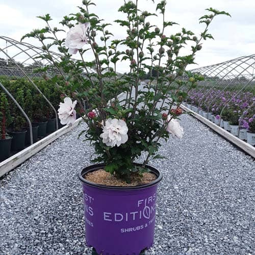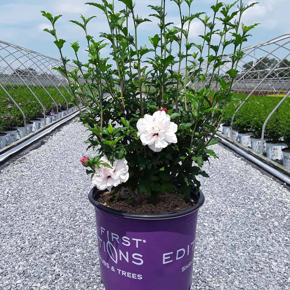"Dark pink flower buds open to a delicate blush pink with shades of white. Large, double, pompom flowers bloom profusely from July to October. Compact in size with an upright habit. Heat tolerant, drought tolerant and adapted to alkaline soils." First Editions, Bailey Nurseries [Hibiscus]