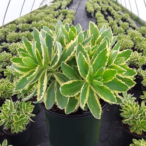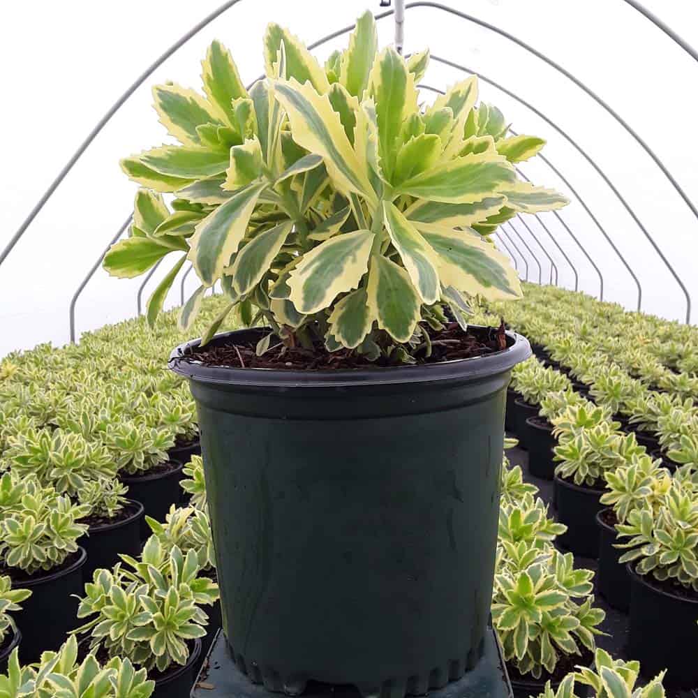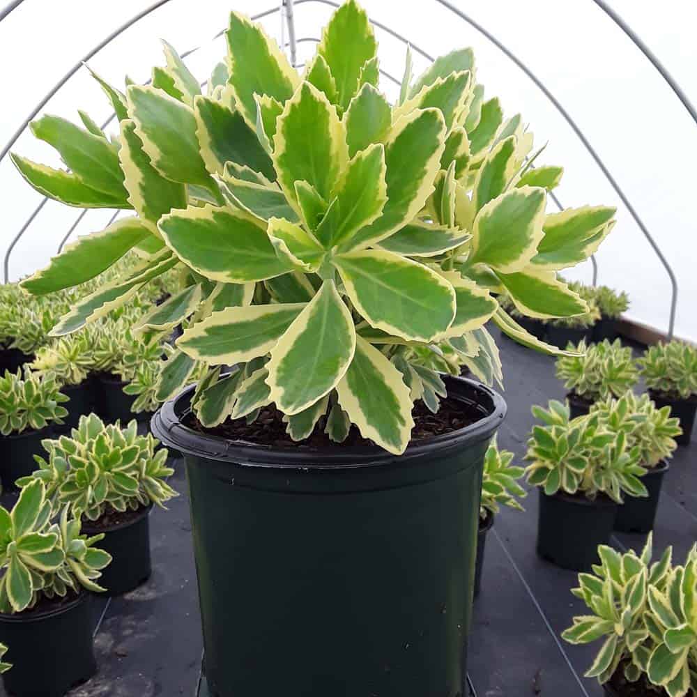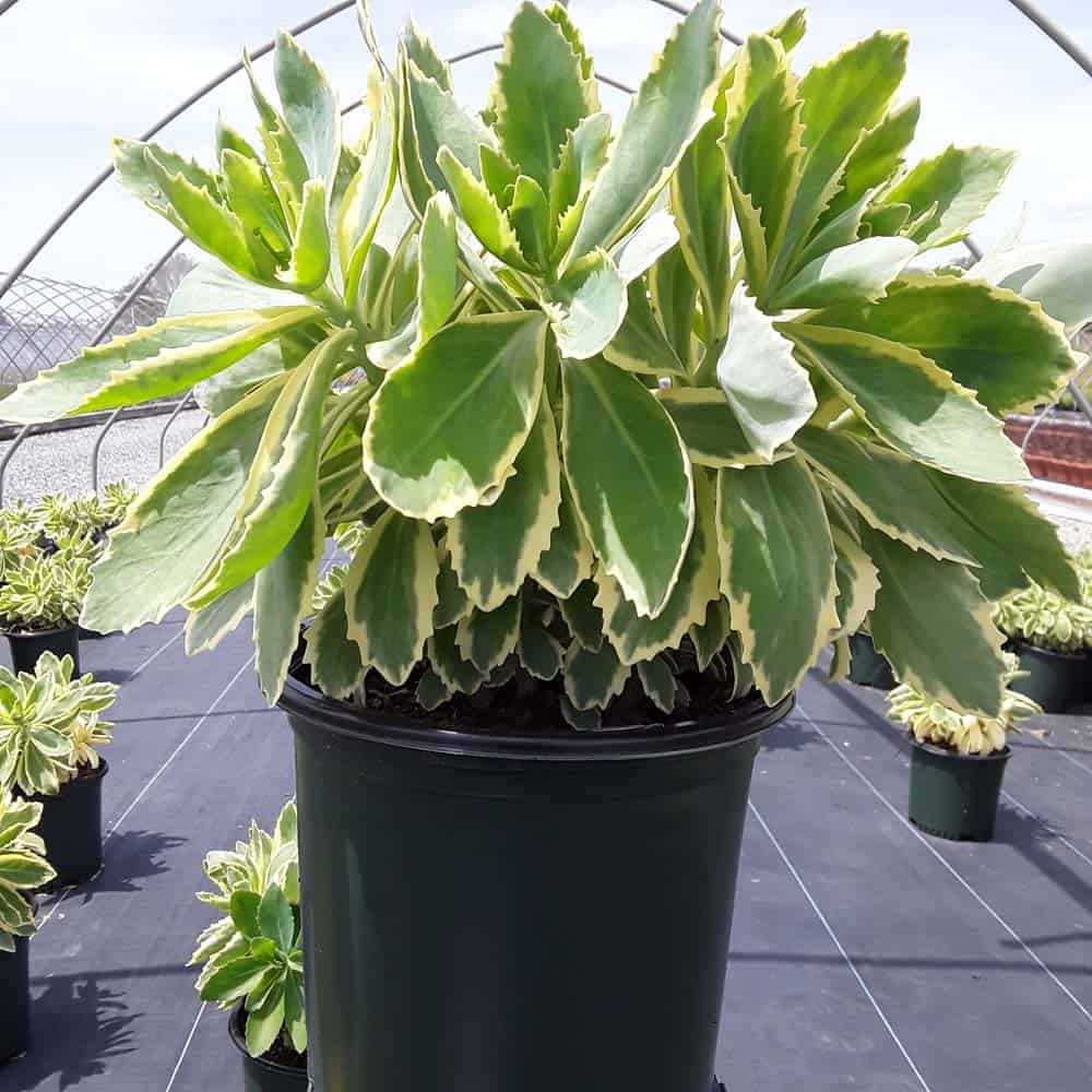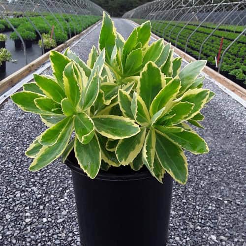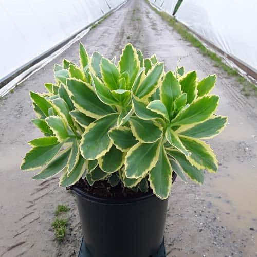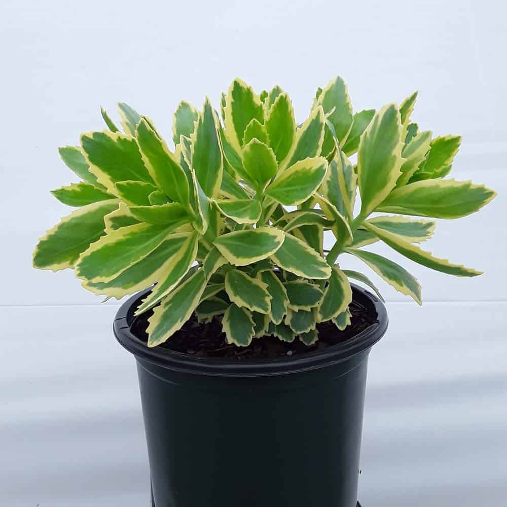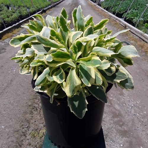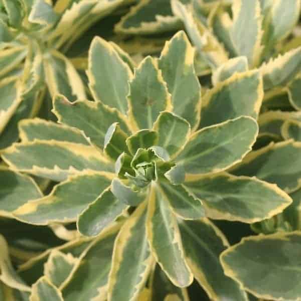 "Similar to AUTUMN CHARM™, ‘Frosted Fire’ is a variegated sport of ‘Autumn Fire’ rather than ‘Autumn Joy’. This plant shares the same brightly colored rosy flower heads, tighter growth habit, and thicker foliage as ‘Autumn Fire’. Light green leaves with creamy yellow, serrated margins form a dense, upright mound." Walters Gardens [Sedum]
