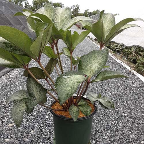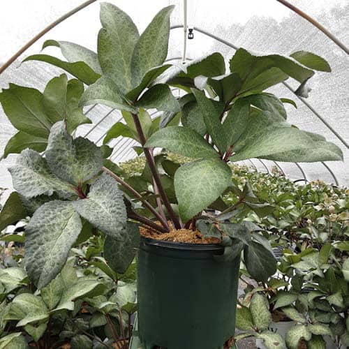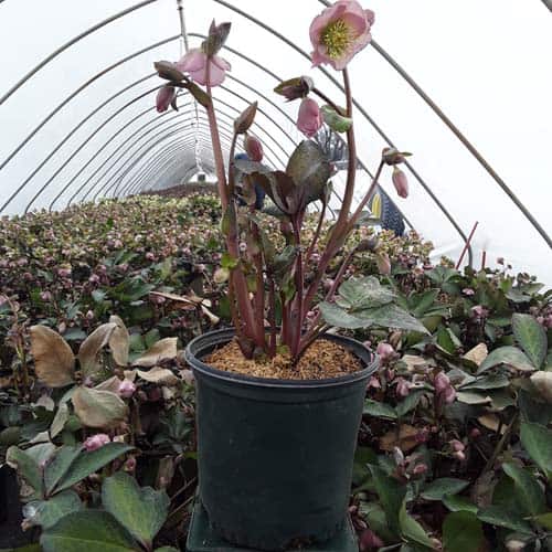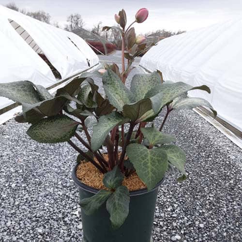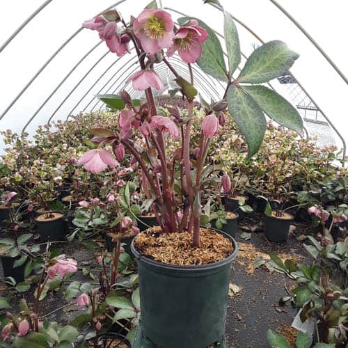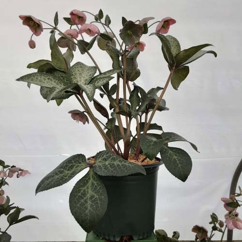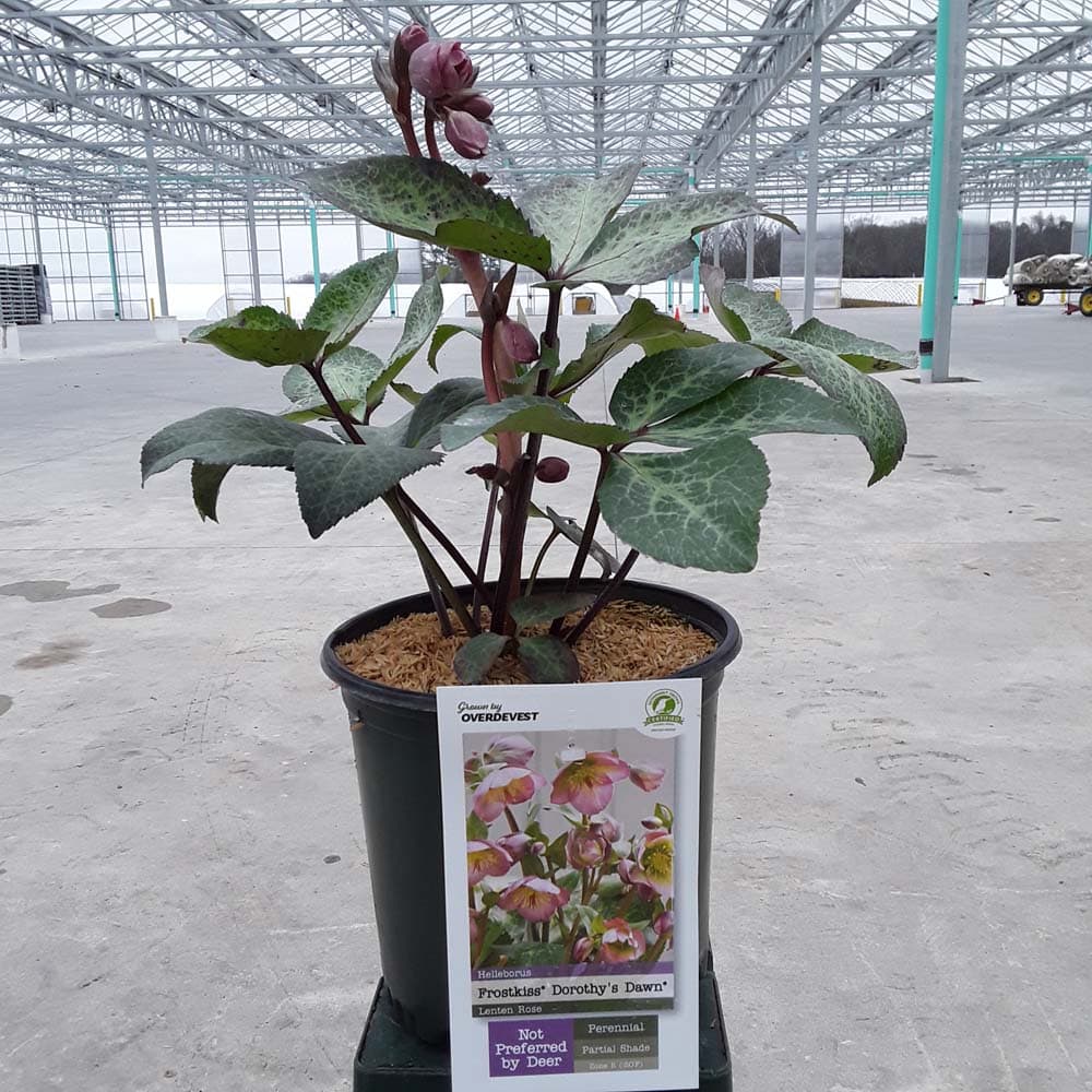 Large, pink, forward facing blooms are held above richly colored, silvery-green, marbled foliage. Dorothy's Dawn™ will brighten the partially shaded garden and will slowly naturalize. Like all of the Frostkiss® hellebores, the evergreen foliage is attractive year round and the beautiful spring blooms appear later than other hellebores. [Helleborus]