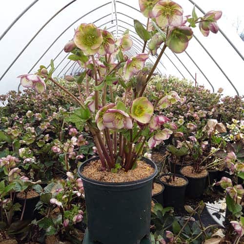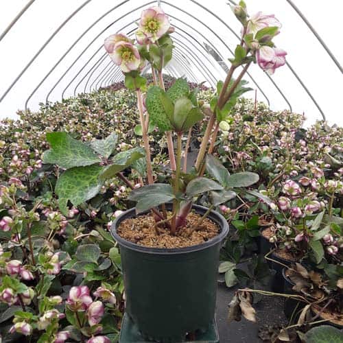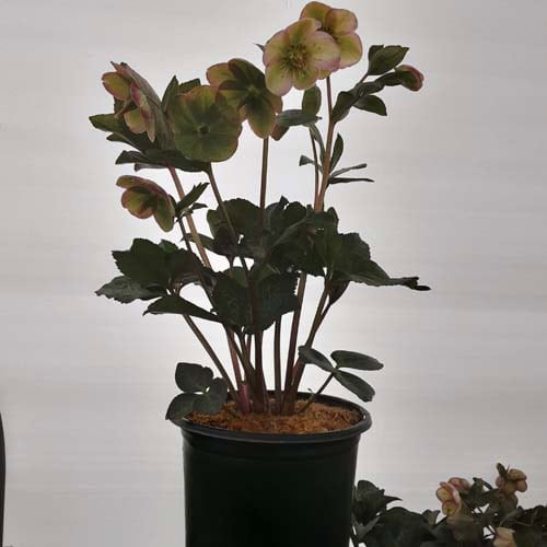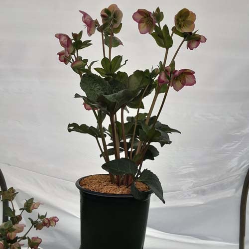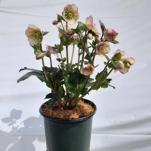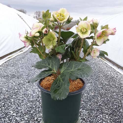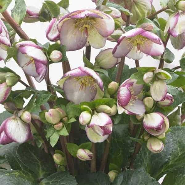 Marbled foliage has bicolor flowers, having the look of a white flower dipped in violet paint. Like all of the Frostkiss® hellebores, the evergreen foliage is attractive year round and the beautiful spring blooms appear later than other hellebores. [Helleborus]