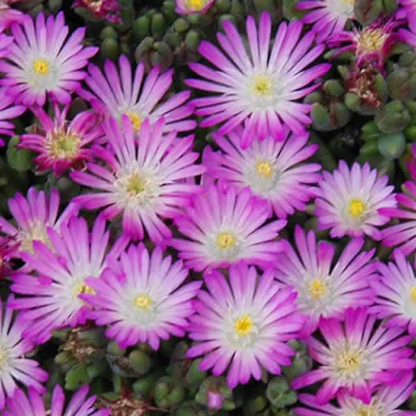 Numerous, aromatic light fuchsia flowers with snowy white centers which end in golden stamen. Each blossom presents an intense vanilla fragrance. [Delosperma]