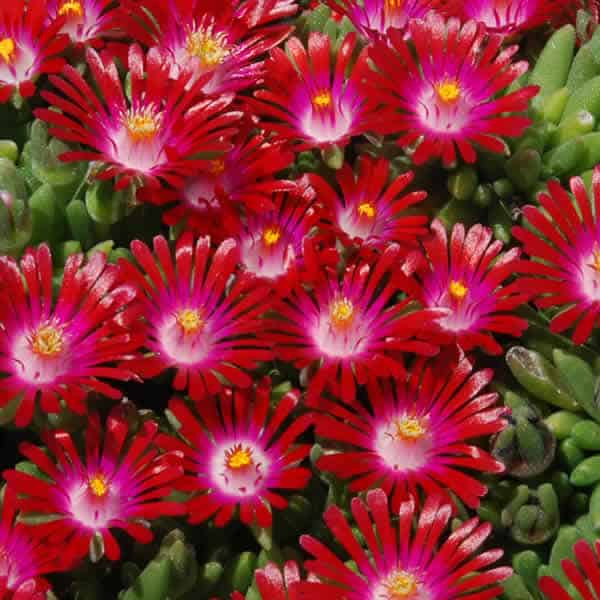Berry red, scarlet, fuchsia, white and yellow blooms cover its foliage. Flowers are heavily scented like warm vanilla [Delosperma]
