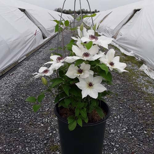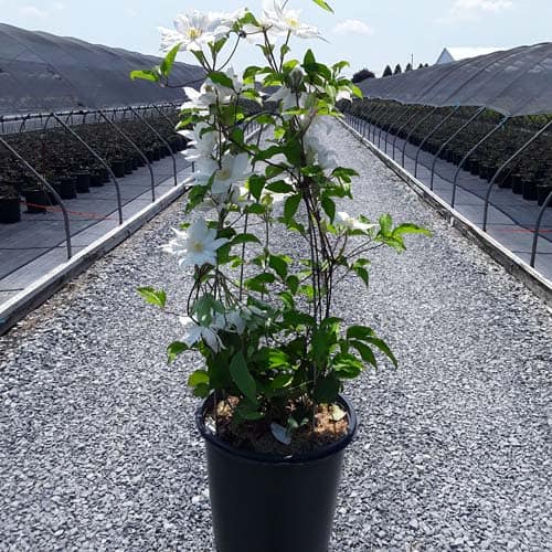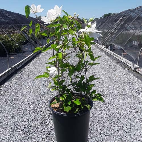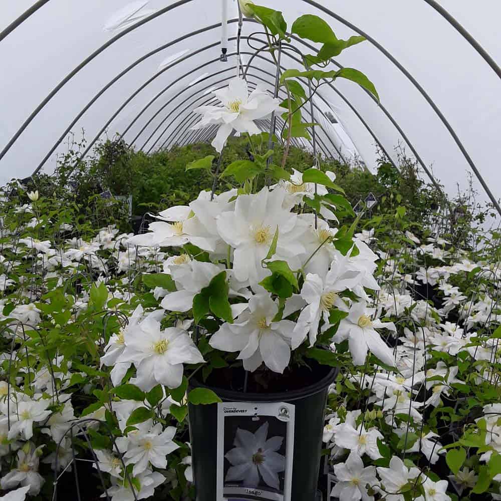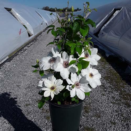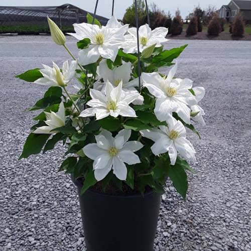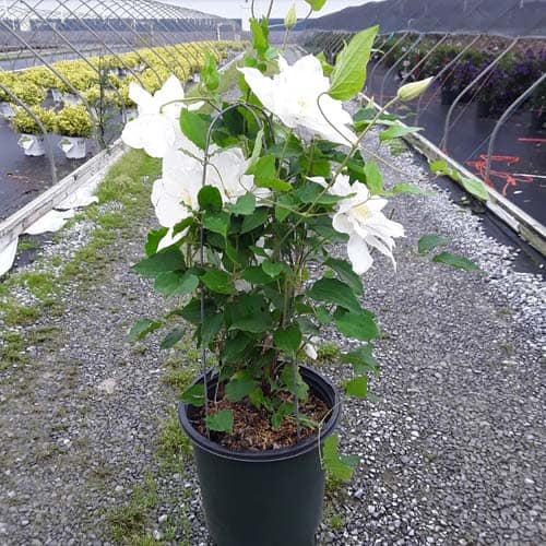Elegant, double white, fluffy flowers bloom in late spring to early summer and then again in late summer with both single and double flowers. [Clematis]