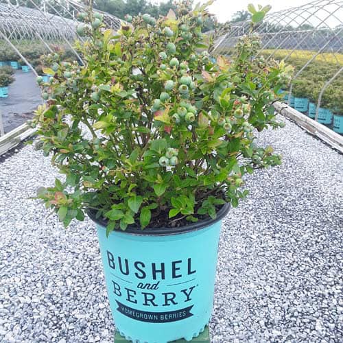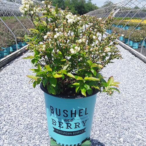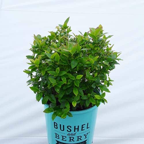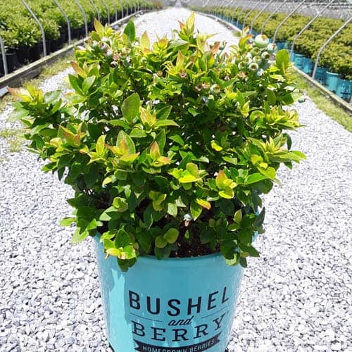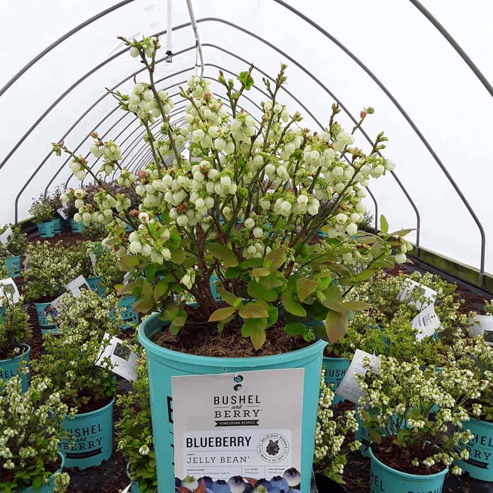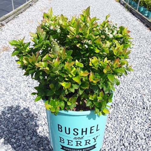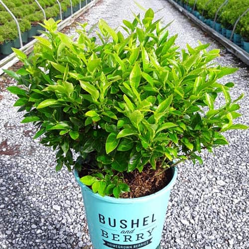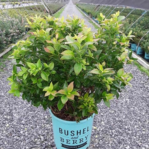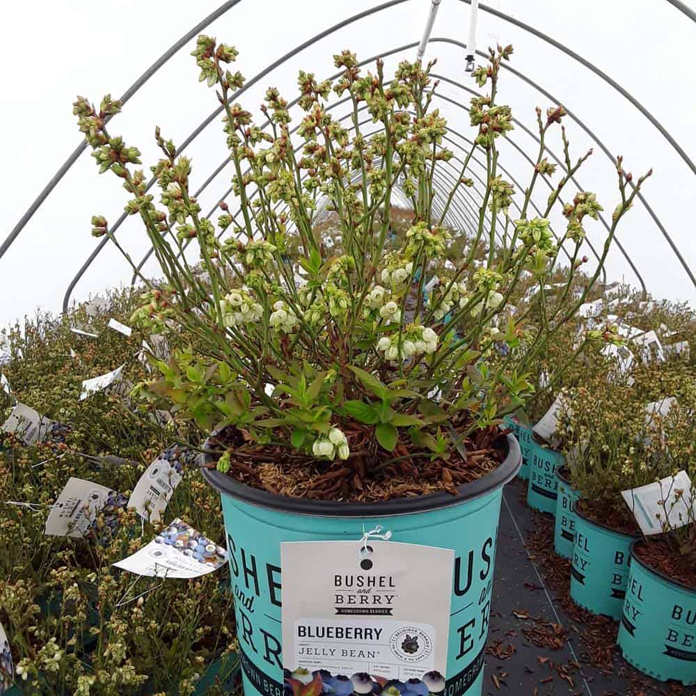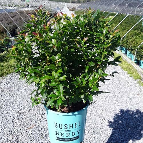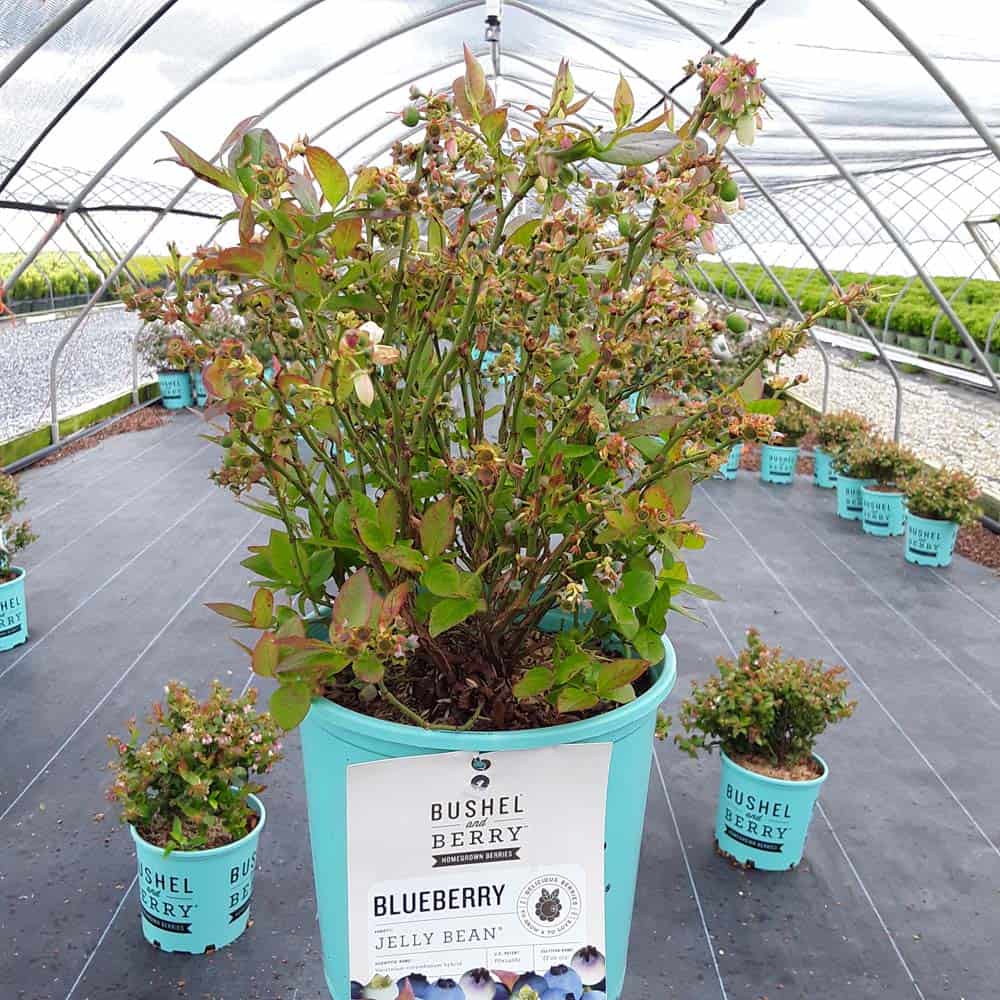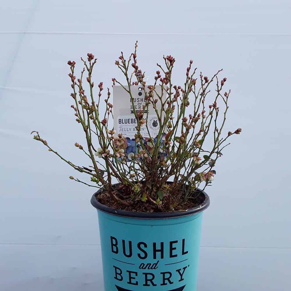 "Jelly Bean® has large, flavorful blueberries mid-summer that taste like sweet, homemade blueberry jelly. The foliage is unlike other blueberries and has unique, elongated green leaves with highlights of red in cooler climates. Try a mini-hedge along a pathway, in the landscape or in decorative patio containers." -- Bushel and Berry® [Vaccinium]
