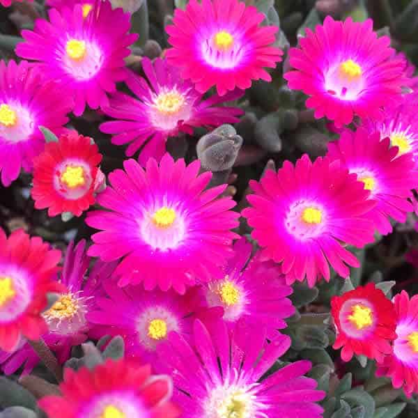 Daisy-like blooms of pink, each with a purple center accented with yellow anthers, make a superb groundcover for a stunning garden display. [Delosperma]