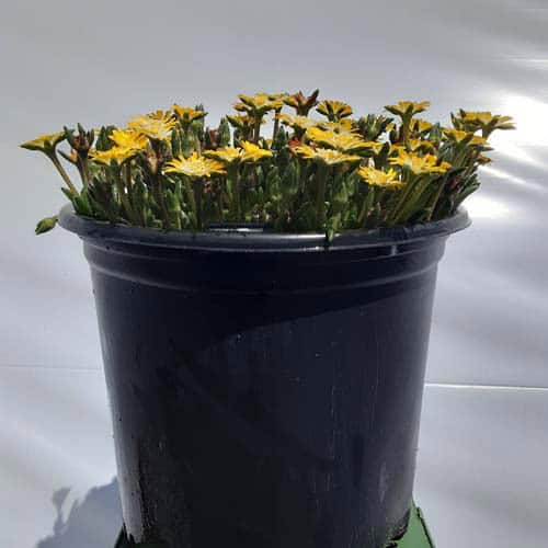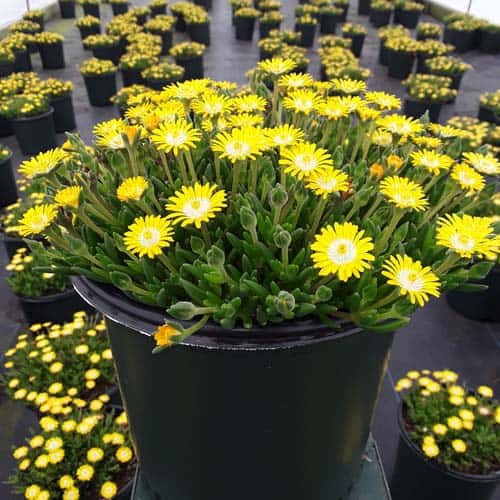 Lemon-yellow flowers with white centers highlighted by yellow anthers, bloom on this drought resistant variety from late spring until frost. [Delosperma]