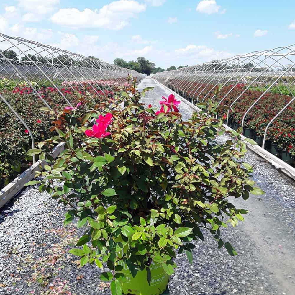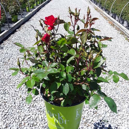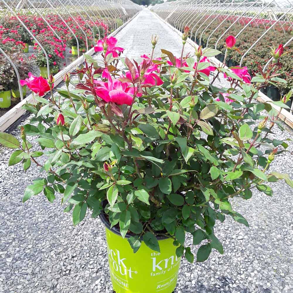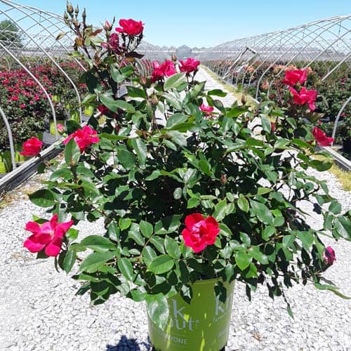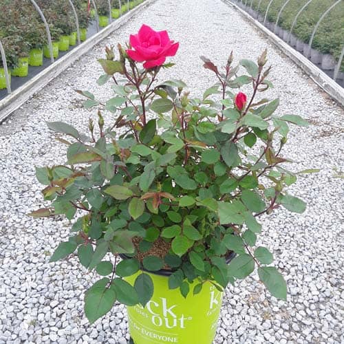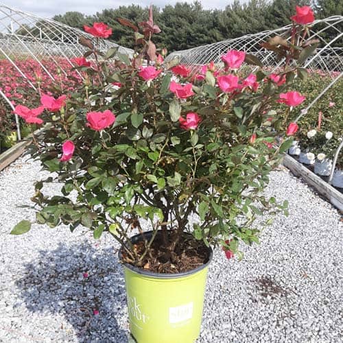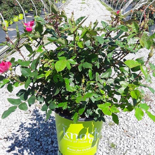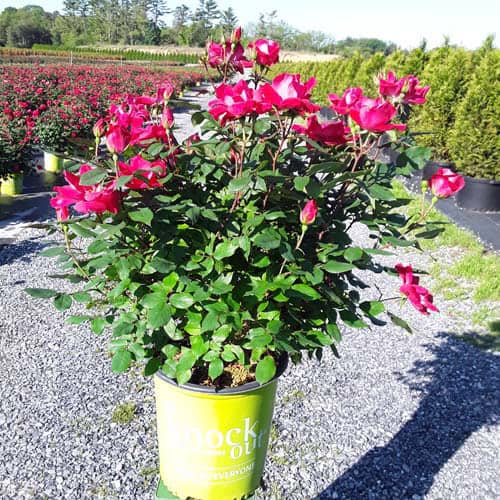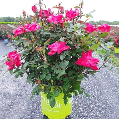 Setting new standards in rose culture & enjoyment, this award winning selection is a reliable & easy to grow variety with cherry-red / hot pink blooms that are carried in profusion from early summer to frost. Black spot resistant, drought tolerant and self-cleaning, it suits every garden and every lifestyle. [Rosa]