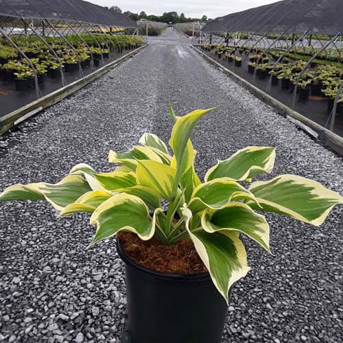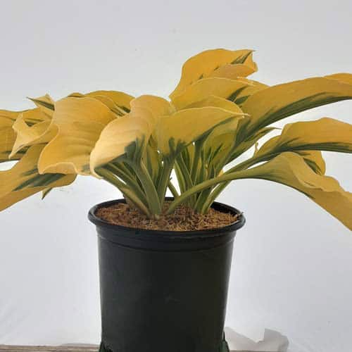 The thick, dark green leaves of this hosta are edged with a wide, golden yellow border that changes to cream in summer. Lavender flowers appear in summer. [Hosta]