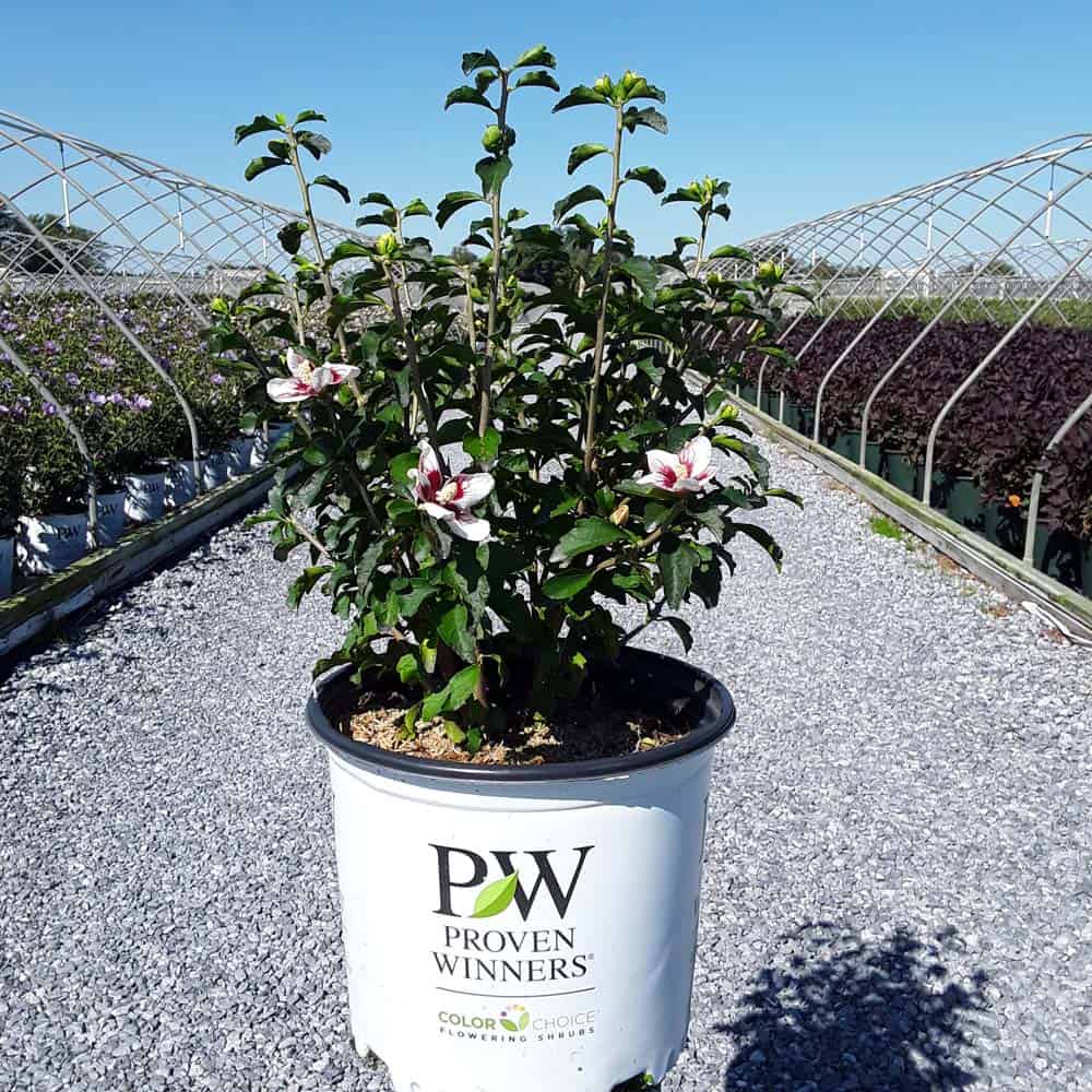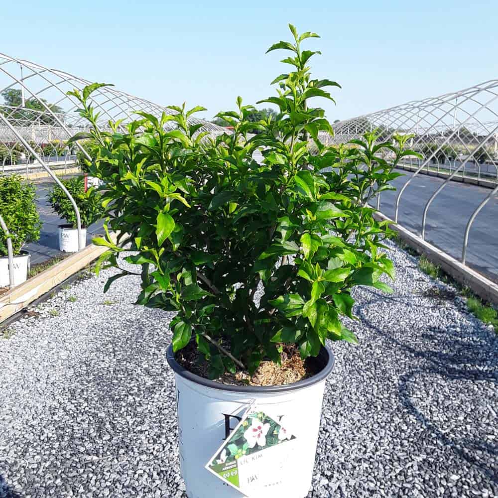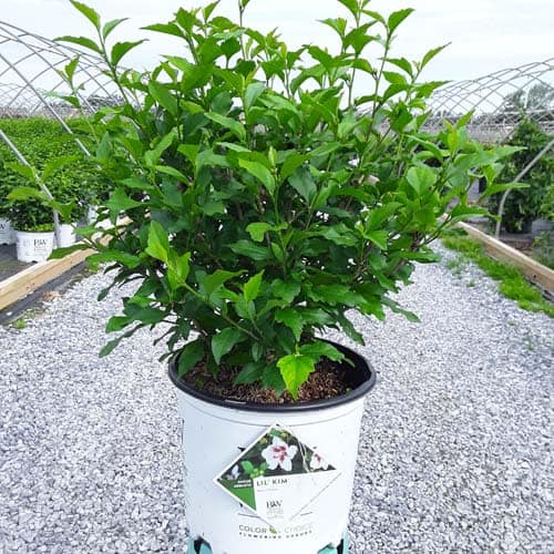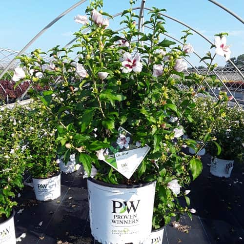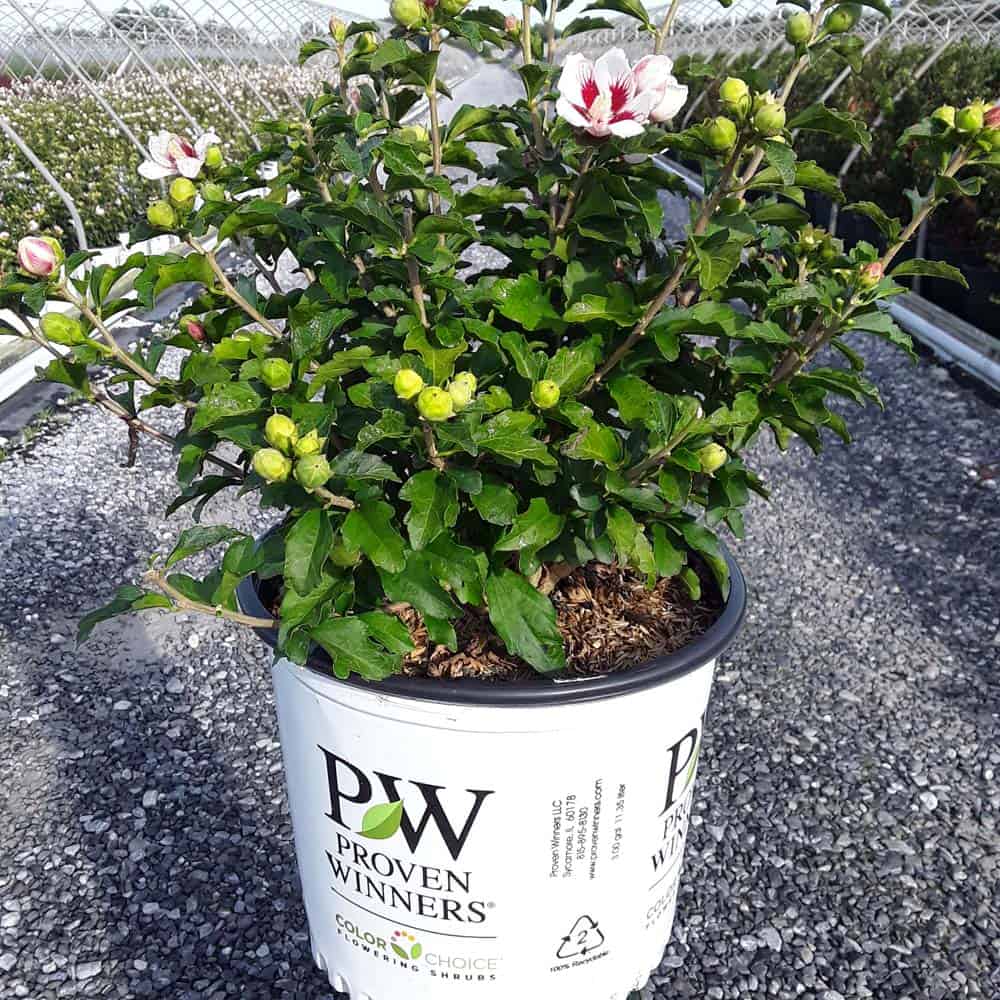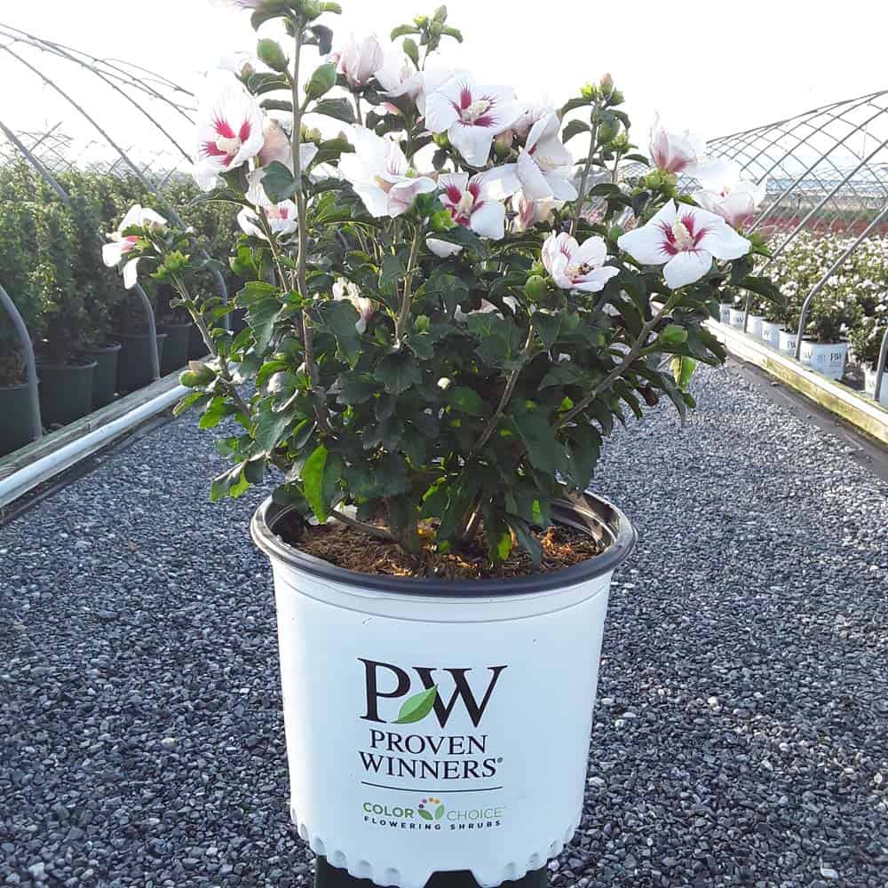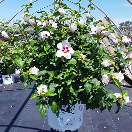 "Lil' Kim rose of Sharon is unique little shrub: dainty white flowers punctuated with a showy red eye pack every branch. The plant has thick, dark green leaves and the flowers last for three days instead of the typical one day before falling. Dwarf habit creates new landscape and garden uses: mixed containers, perennial beds, around decks, entry gardens, foundation plantings. Developed by noted plantsman Dr. Shim of South Korea." -- Spring Meadow Nurseries [Hibiscus]