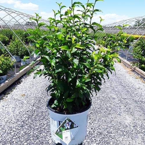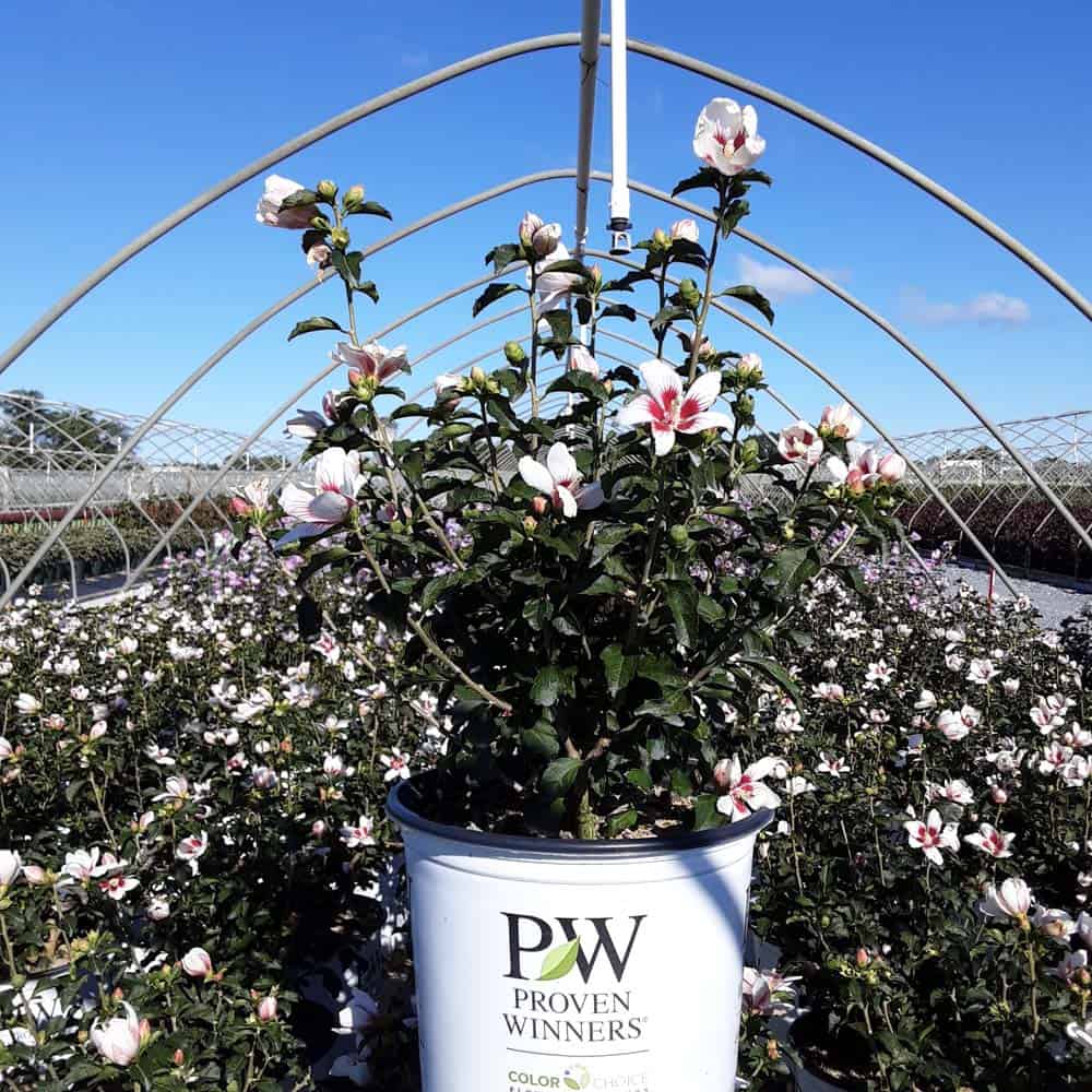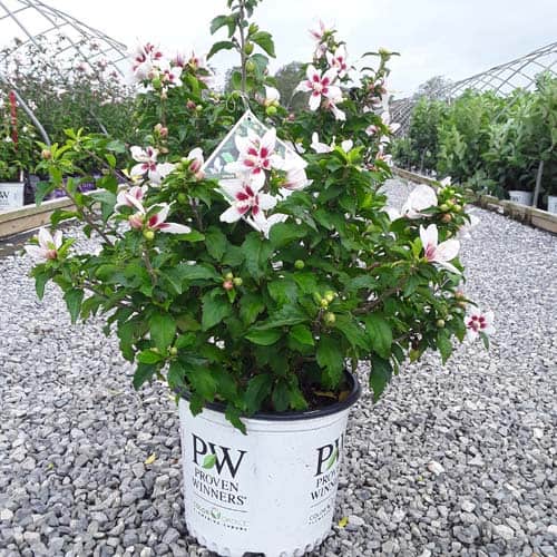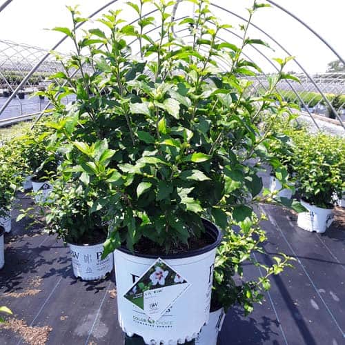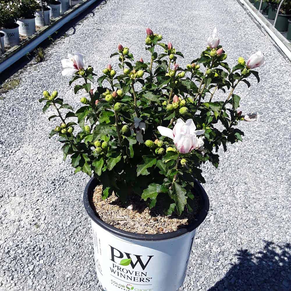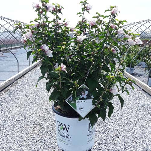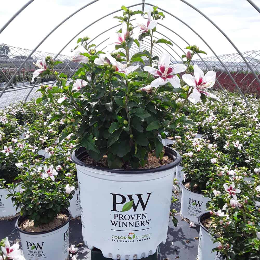 "Lil' Kim rose of Sharon is unique little shrub: dainty white flowers punctuated with a showy red eye pack every branch. The plant has thick, dark green leaves and the flowers last for three days instead of the typical one day before falling. Dwarf habit creates new landscape and garden uses: mixed containers, perennial beds, around decks, entry gardens, foundation plantings. Developed by noted plantsman Dr. Shim of South Korea." -- Spring Meadow Nurseries [Hibiscus]
