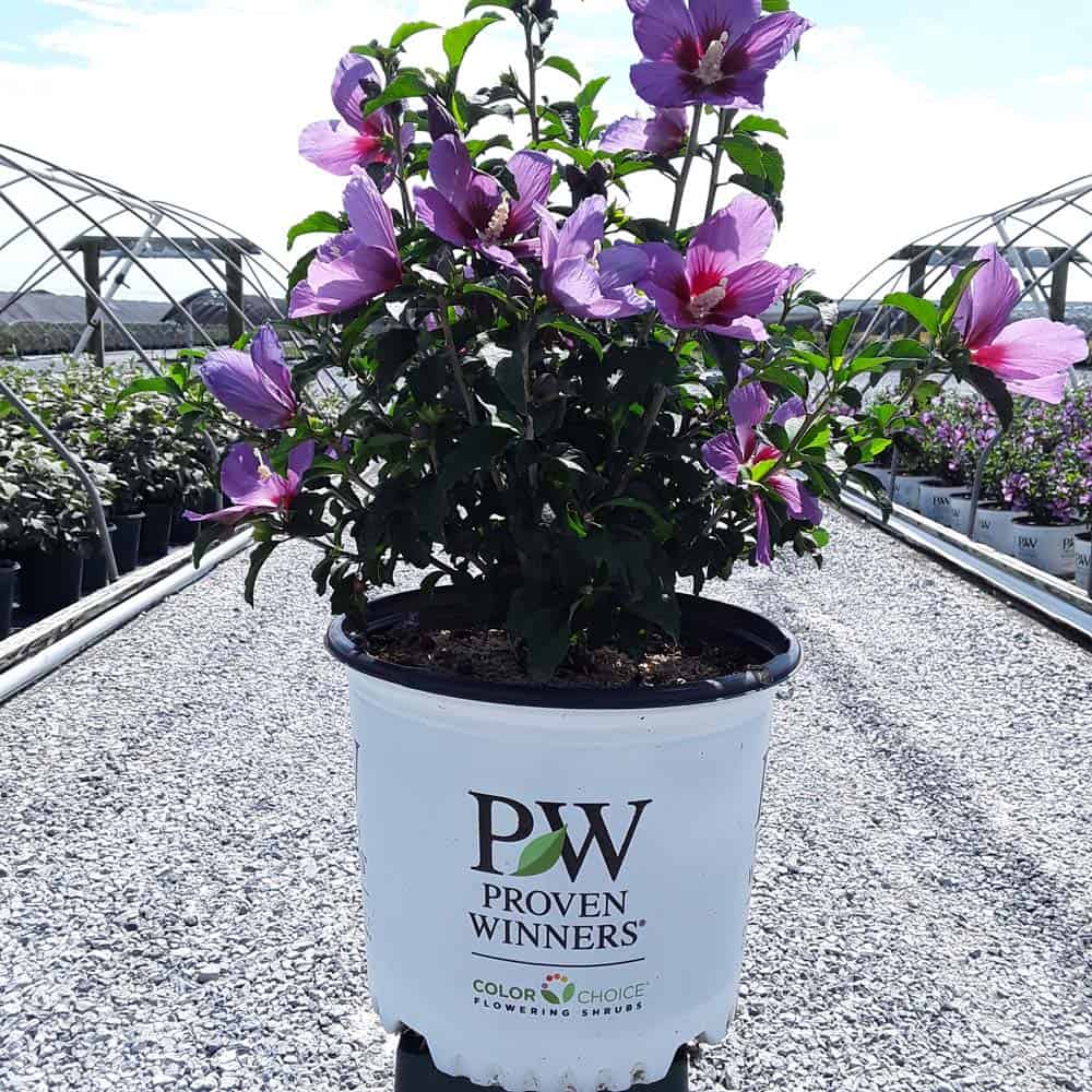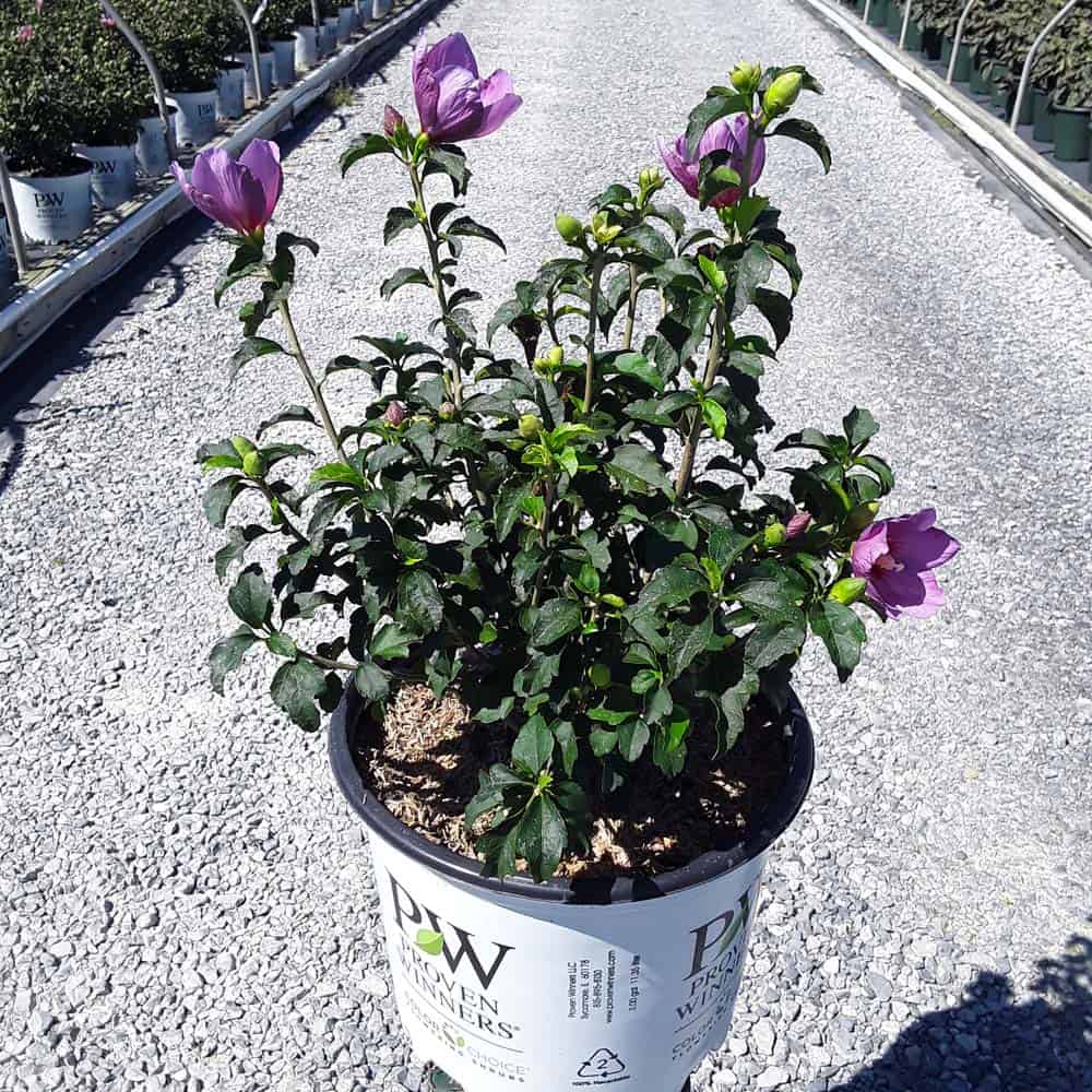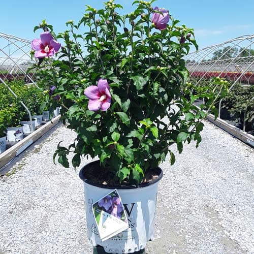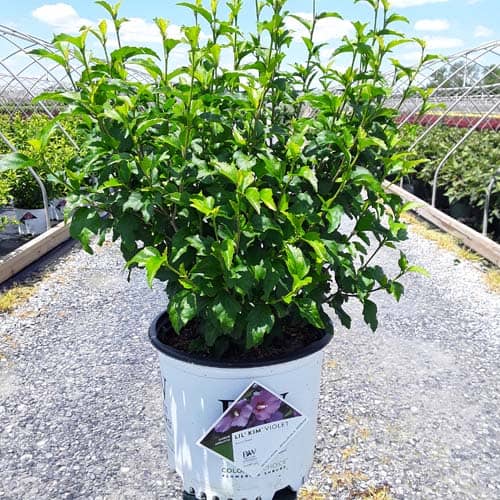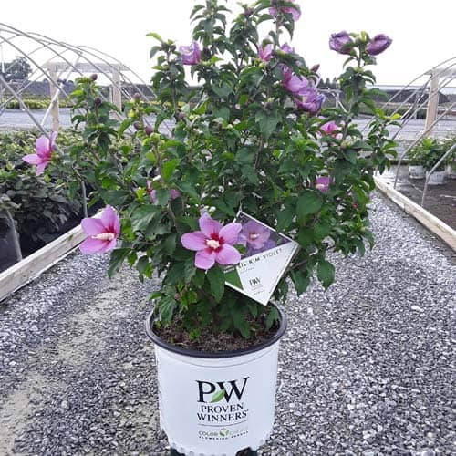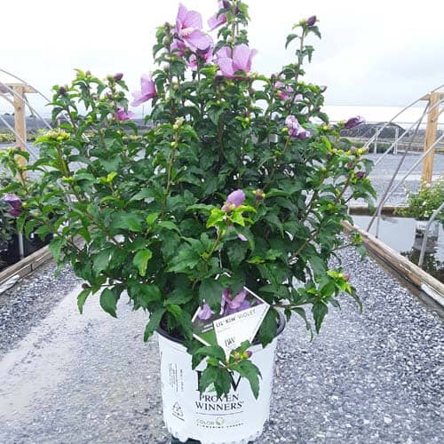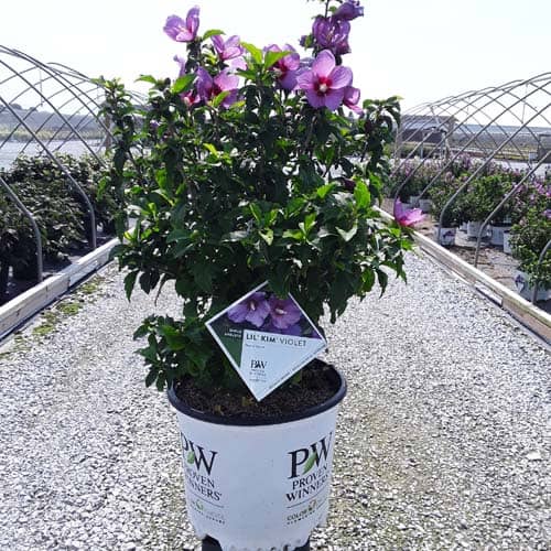 "This purple form of the dwarf Lil' Kim® rose of Sharon is perfect for containers and smaller gardens. It has the same compact habit but with plum-violet flowers accented by a red eye. The large - up to 3" across - flowers are very striking against the dark, glossy foliage and are held up by very strong stems." Spring Meadow Nursery [Hibiscus]