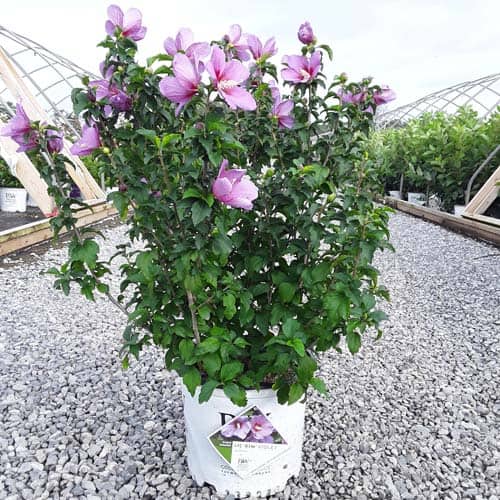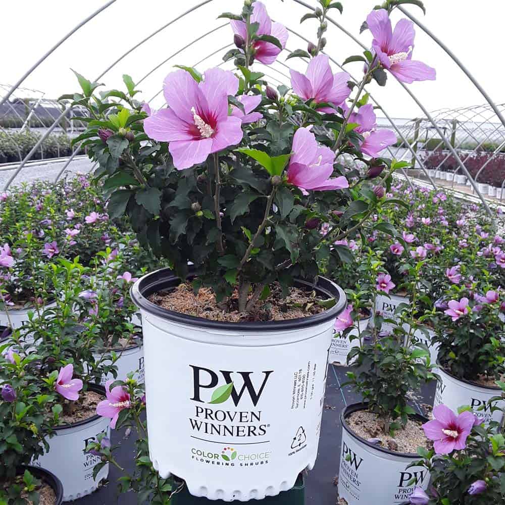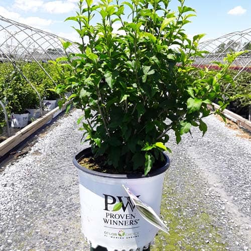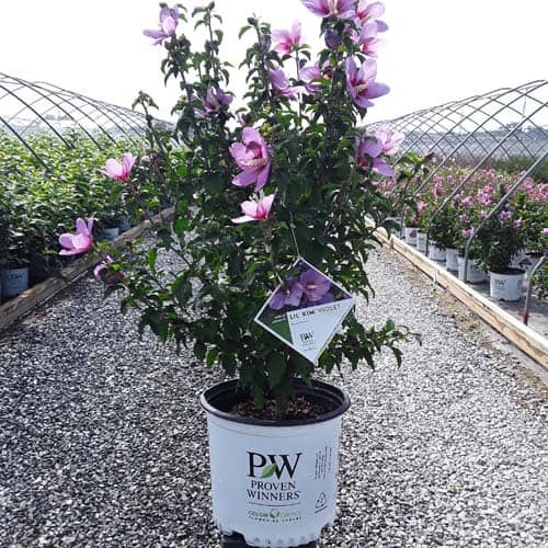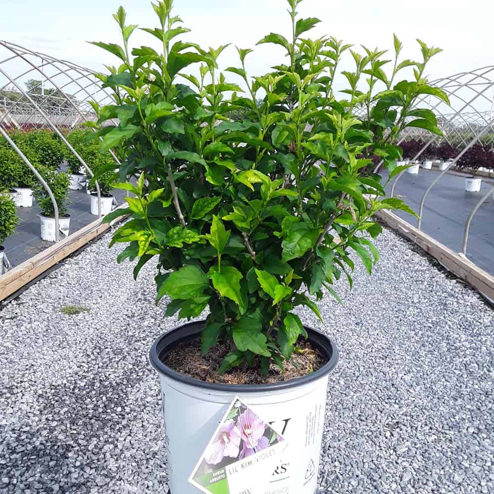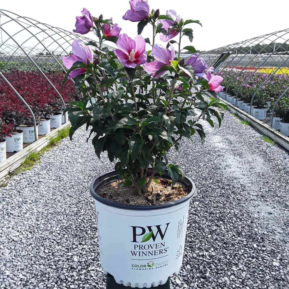 "This purple form of the dwarf Lil' Kim® rose of Sharon is perfect for containers and smaller gardens. It has the same compact habit but with plum-violet flowers accented by a red eye. The large - up to 3" across - flowers are very striking against the dark, glossy foliage and are held up by very strong stems." Spring Meadow Nursery [Hibiscus]
