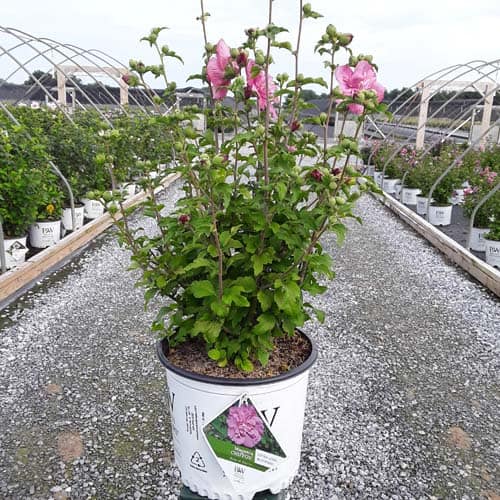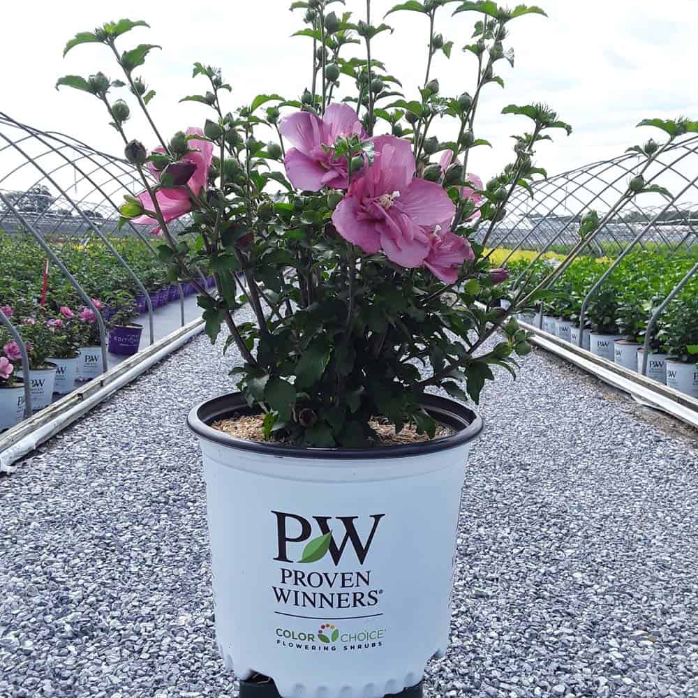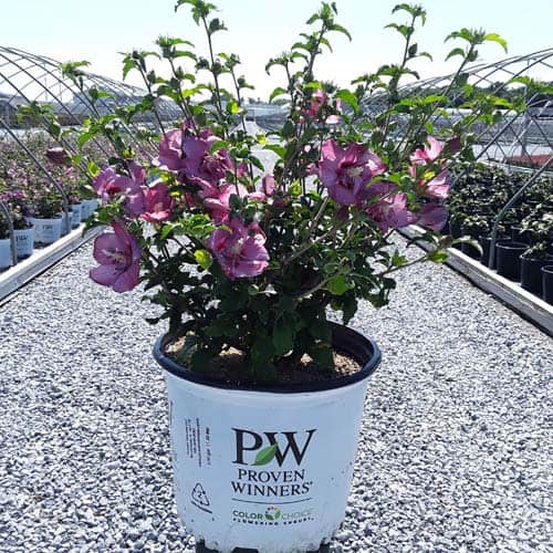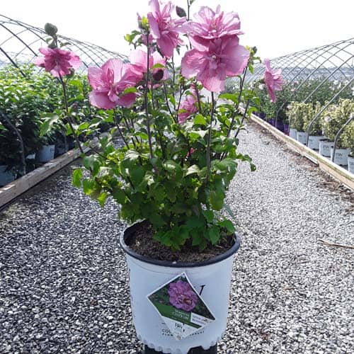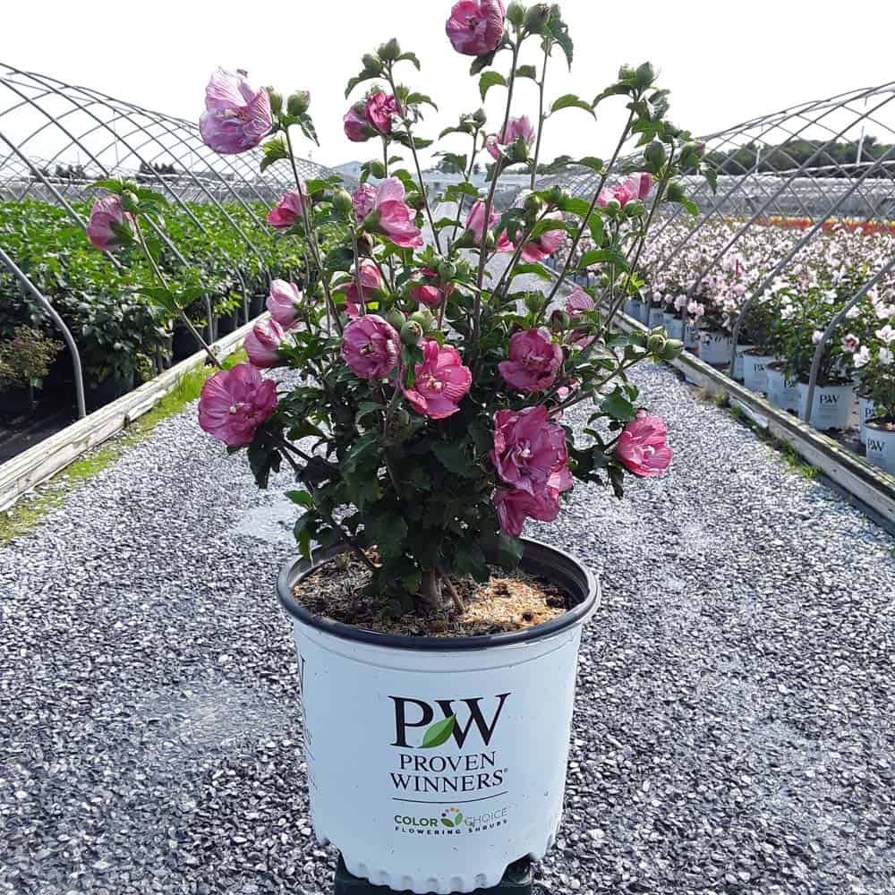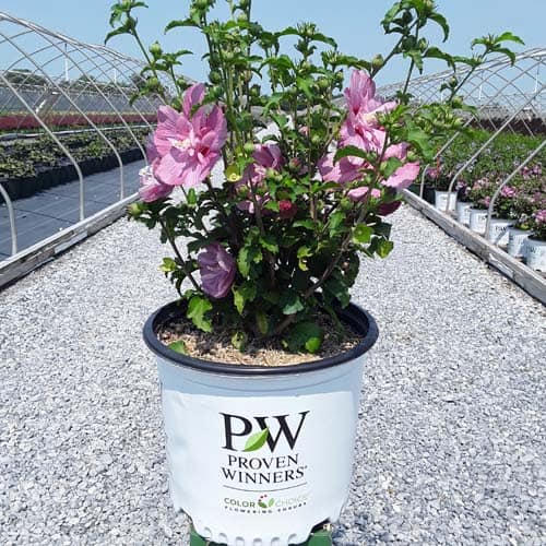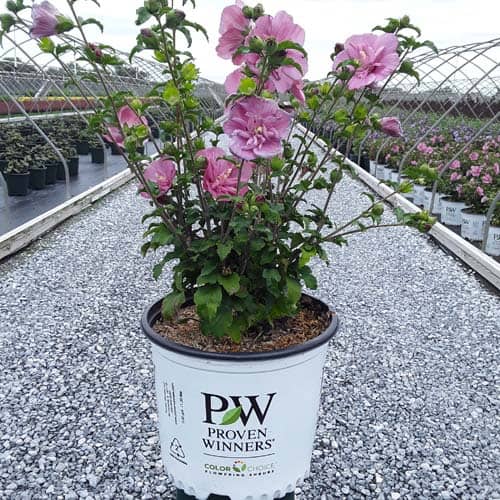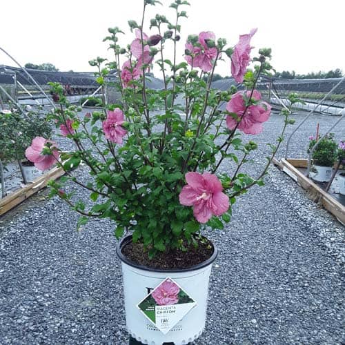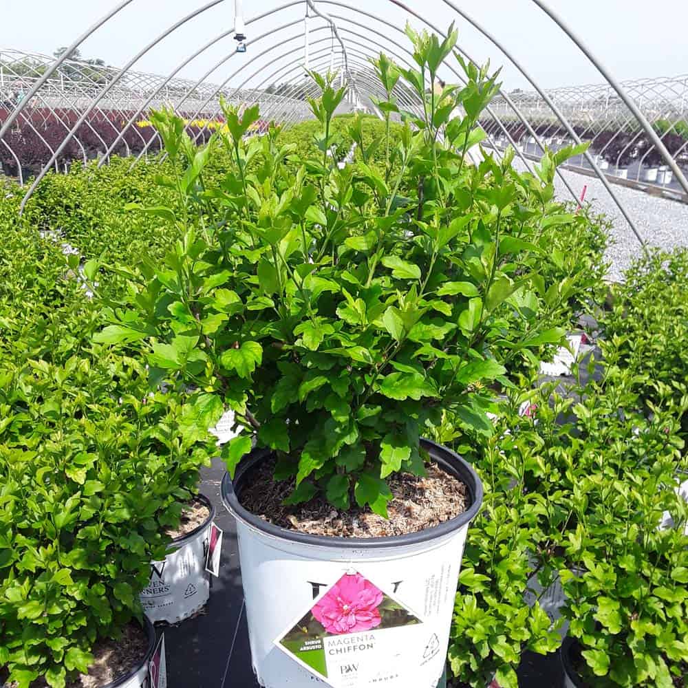 "This addition to the best selling Chiffon® Hibiscus series shares the trademark double, anemone-like blooms and soft, graceful habit but with deeply saturated vibrant magenta flowers. Can be grown as a standard or as a shrub." - Spring Meadow Nursery [Hibiscus]