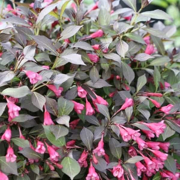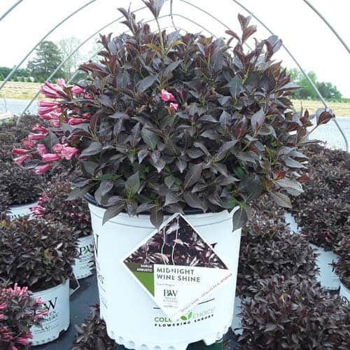 "Everything you love about Midnight Wine®, but with more va-voom than ever! It has darker, shinier leaves which make a huge impact in the landscape from spring to fall. And as for autumn, you'll be relieved to hear that it has had displayed much better hardiness when it comes to tip die-back. Find it in better garden centers anywhere, starting in 2022 and beyond." - Proven Winners [Weigela]
