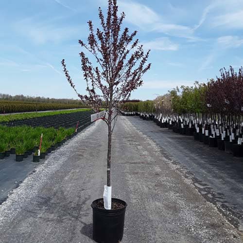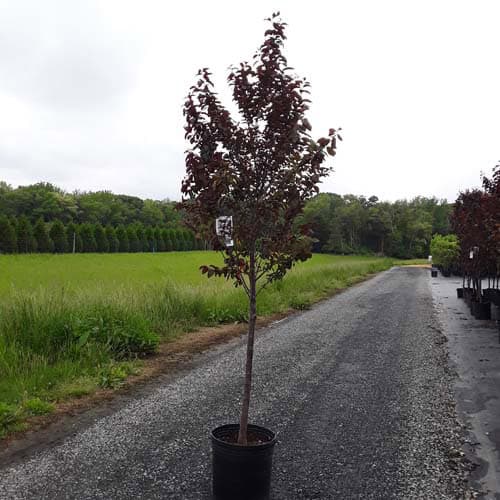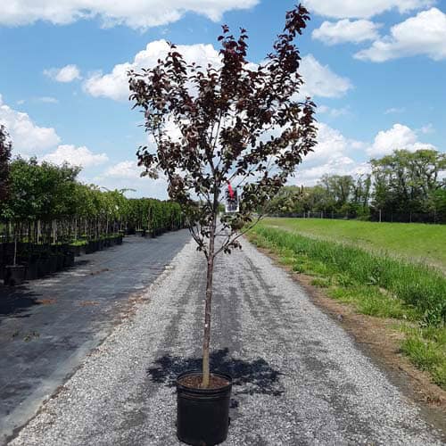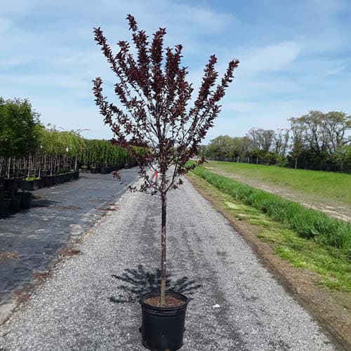 Fast-growing, spring-blooming, ornamental tree has deep purple leaves that hold color through summer. Colorful foliage makes this an excellent specimen plant. [Prunus]