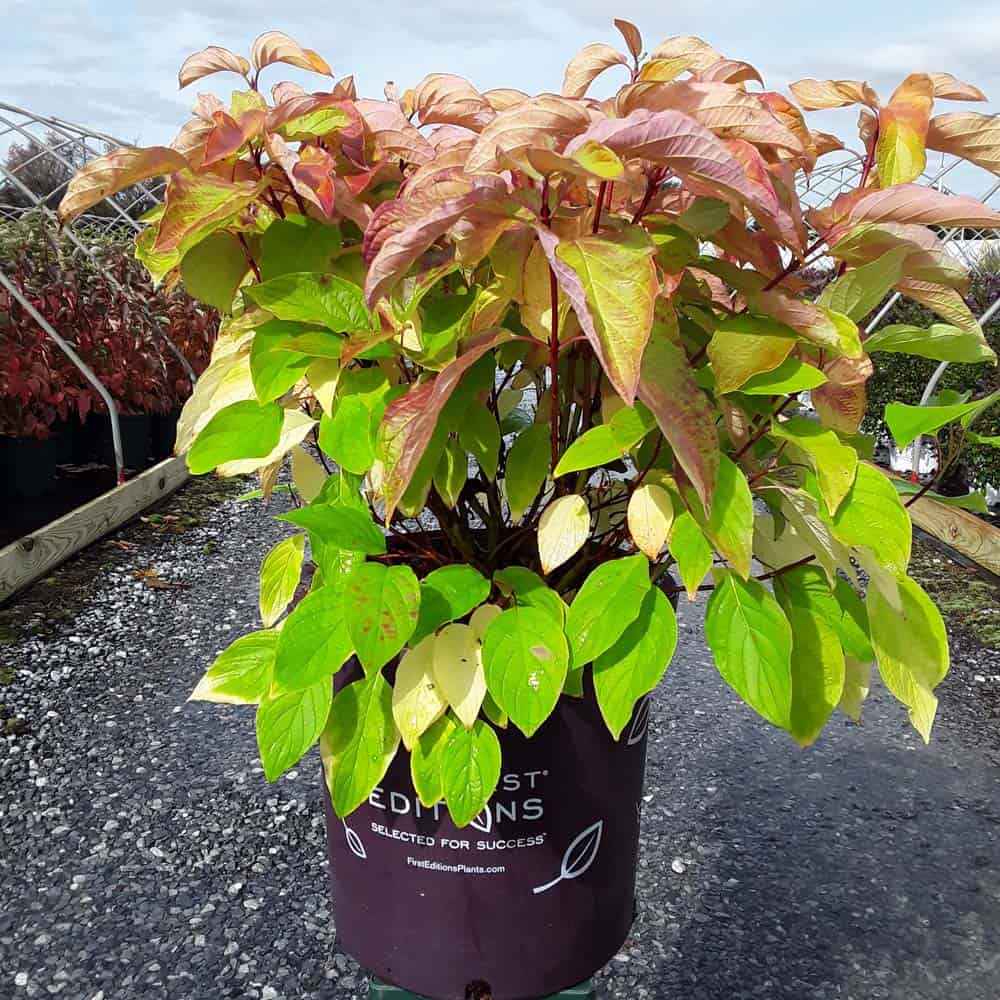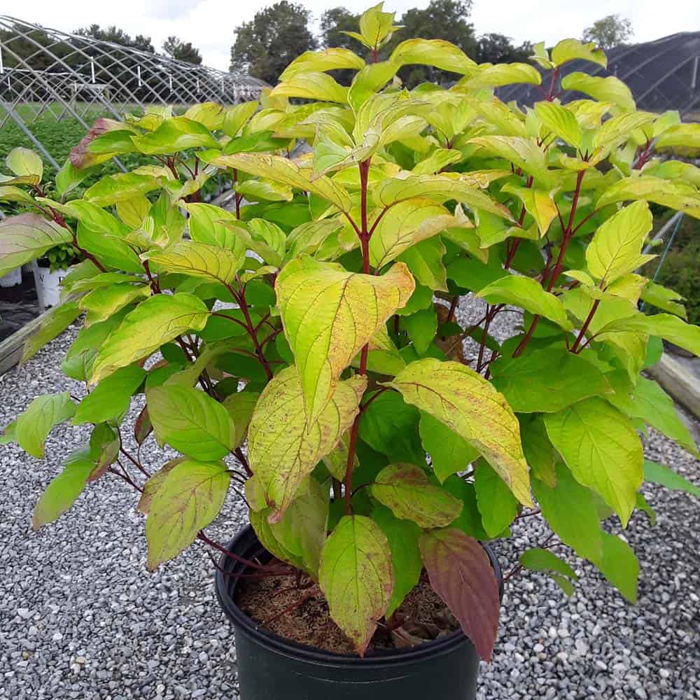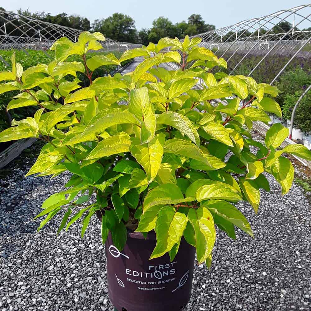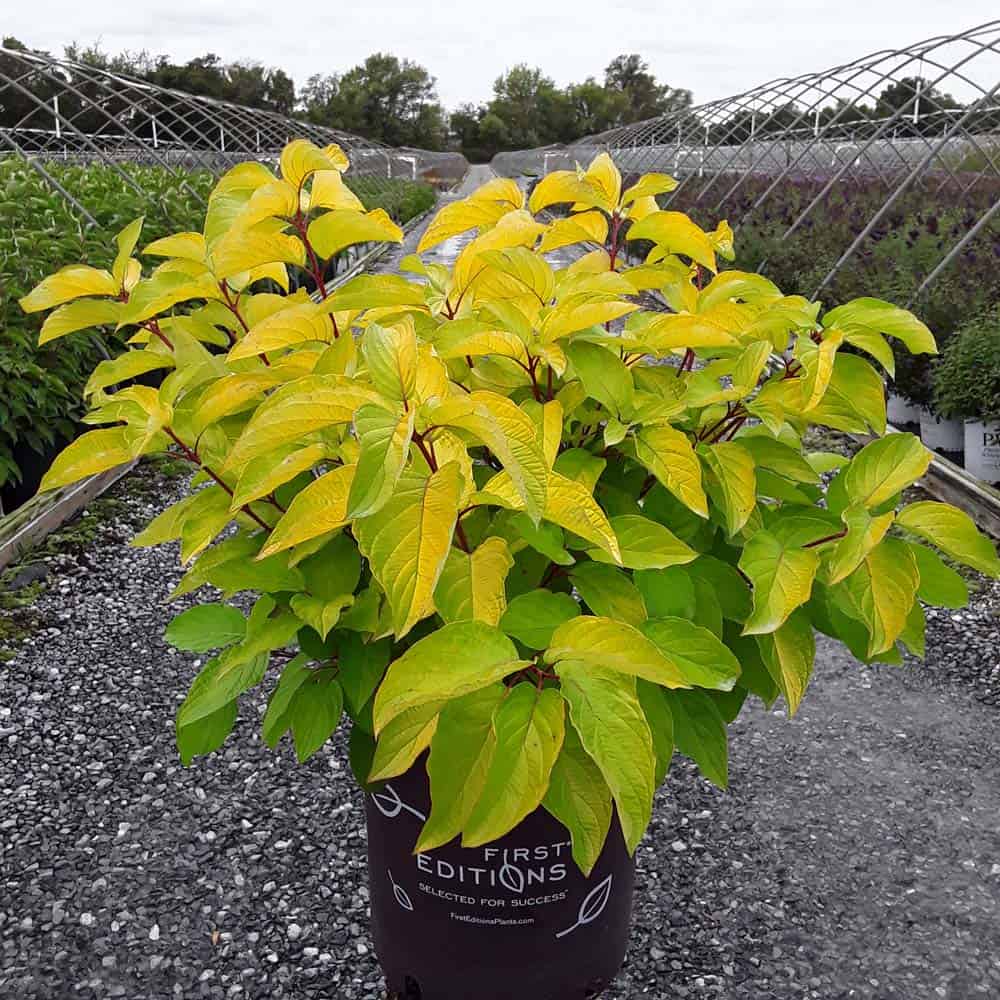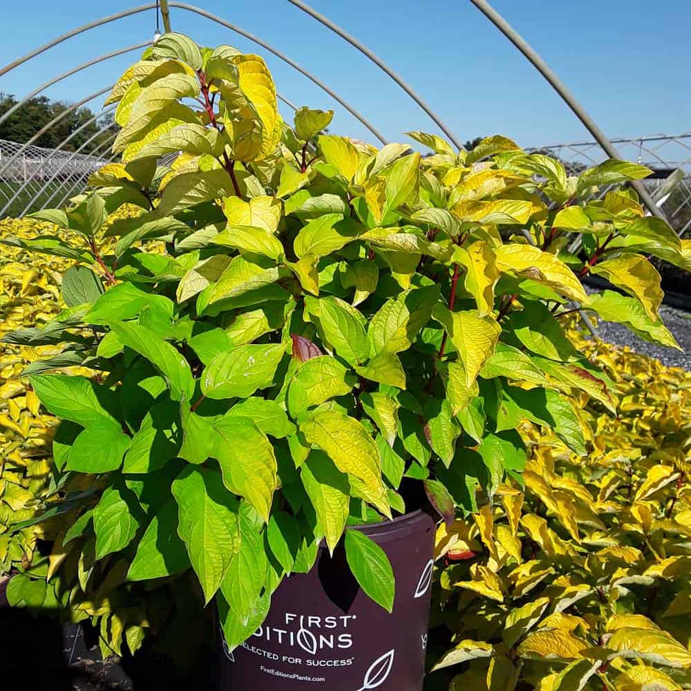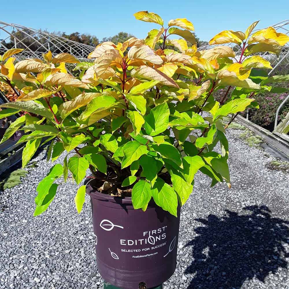 "Attractive chartreuse leaves keep their color in the sun and through the heat of the summer. New leaves are tinged with bronze and the stems have a rich red hue early in the season. In the fall, the foliage becomes a rainbow of purple, red, yellow, and orange with stems turning glossy scarlet red in the winter. Beautiful, compact habit." First Editions, Bailey Nurseries [Cornus]