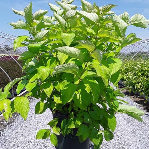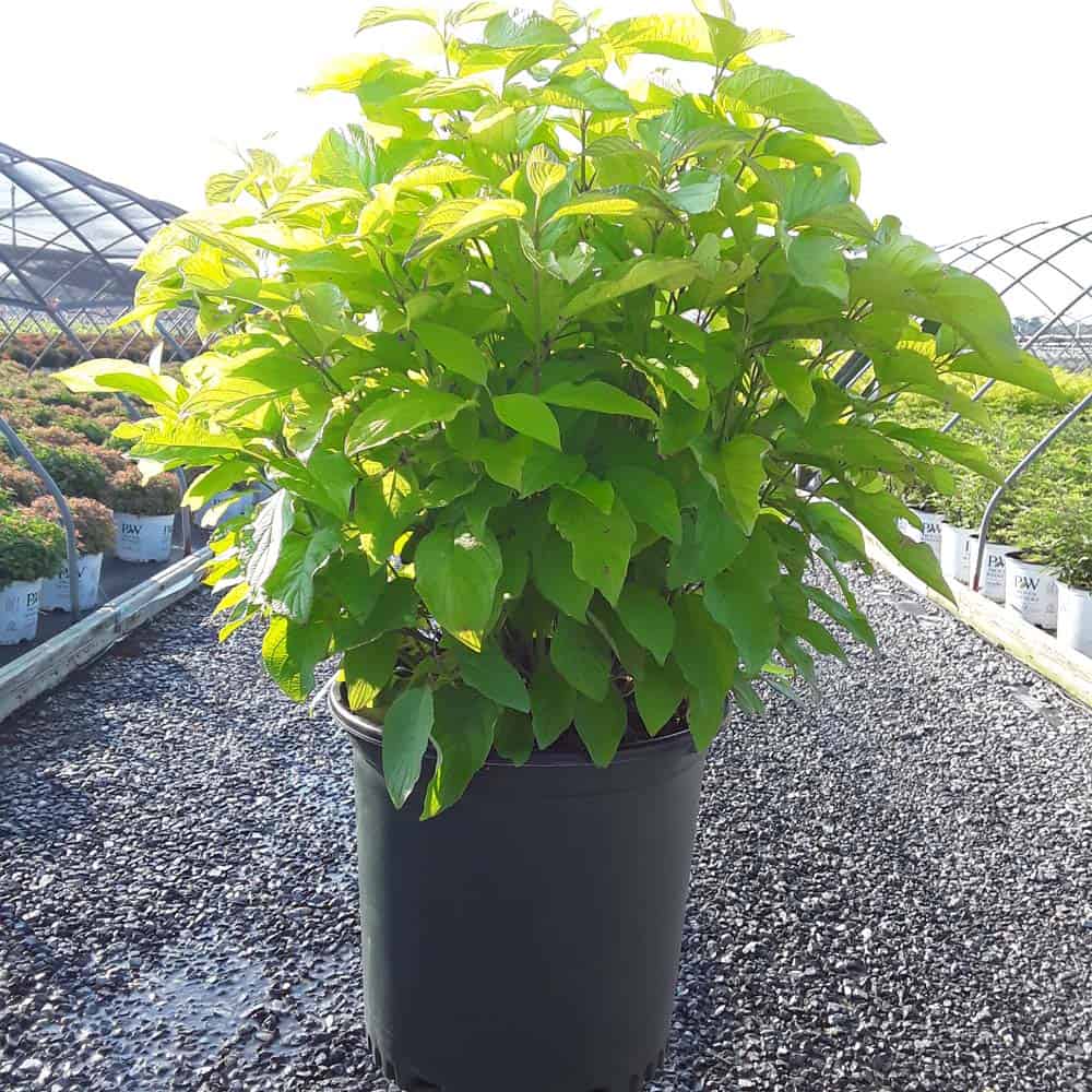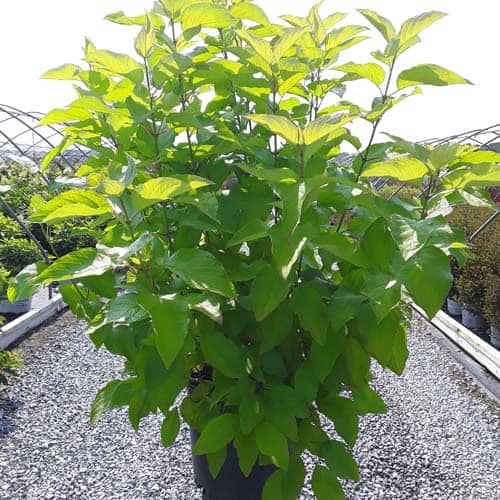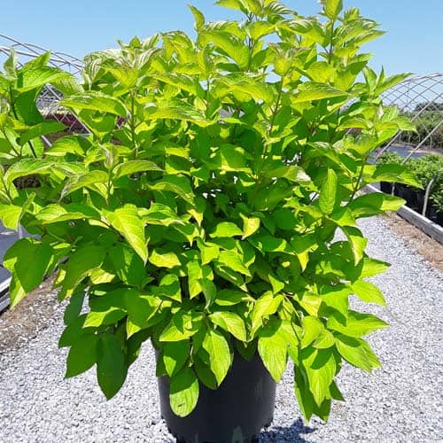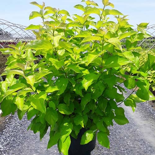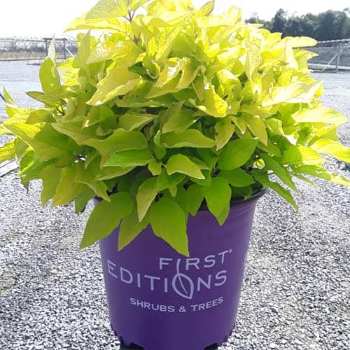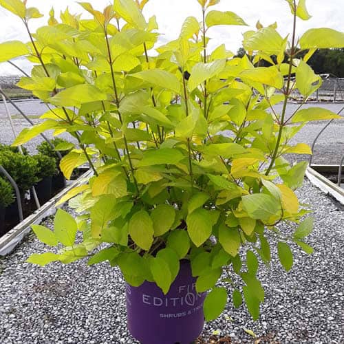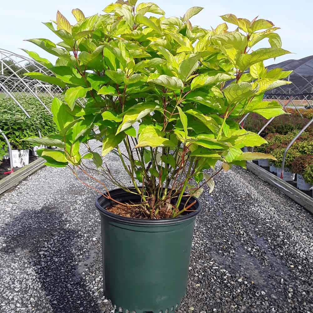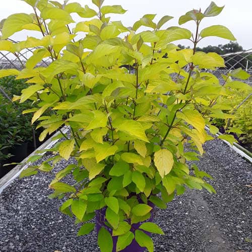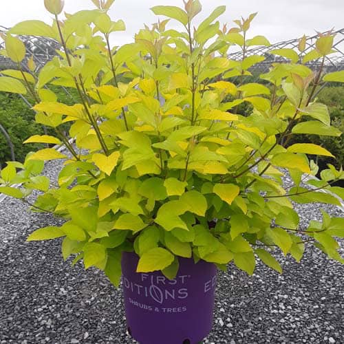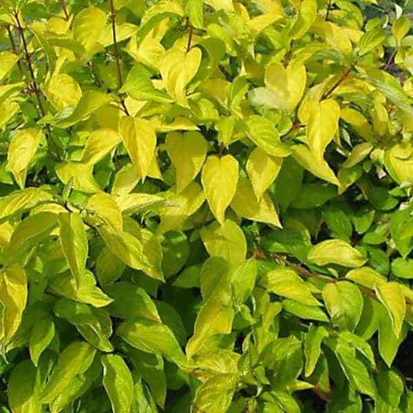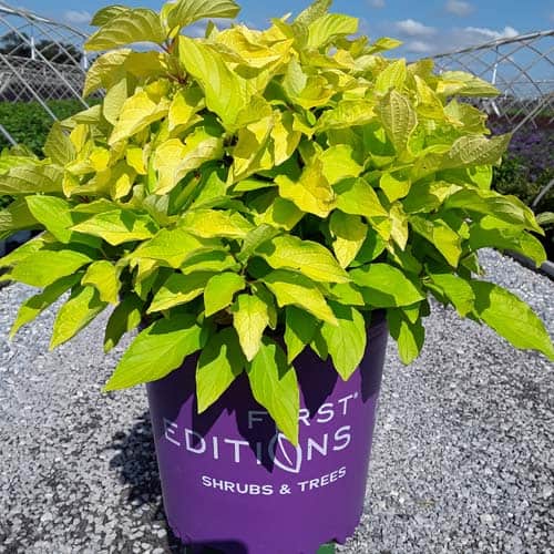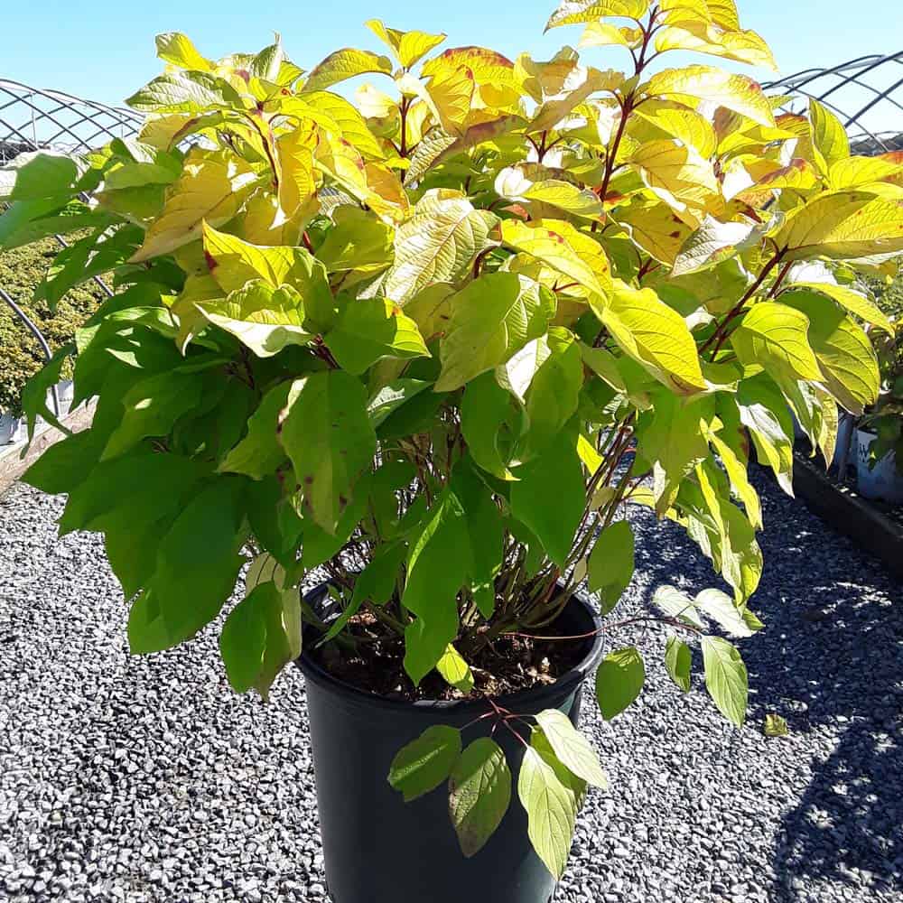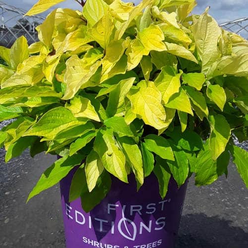 "Attractive chartreuse leaves keep their color in the sun and through the heat of the summer. New leaves are tinged with bronze and the stems have a rich red hue early in the season. In the fall, the foliage becomes a rainbow of purple, red, yellow, and orange with stems turning glossy scarlet red in the winter. Beautiful, compact habit." First Editions, Bailey Nurseries [Cornus]