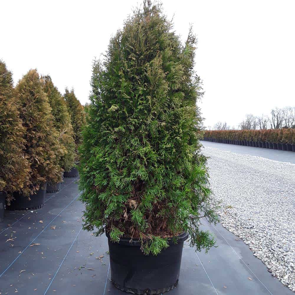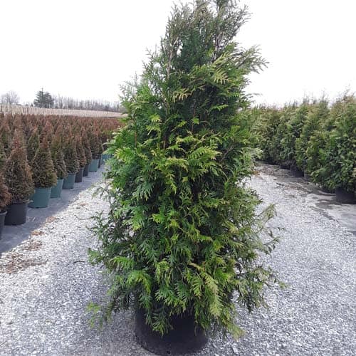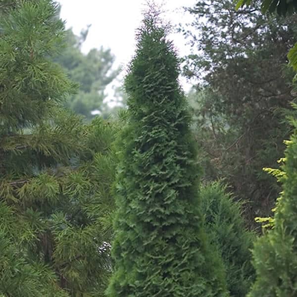 "This narrow columnar selection of 'Wintergreen' has excellent hardiness and dark green winter foliage color, and is fast-growing. More narrow than Emerald Green. Selected by Art Boe of Faribault, MN, it is resistant to winter burn." -- Spring Meadow Nursery [Thuja]