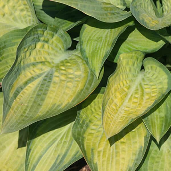 Striking greenish-yellow foliage with thin green margins brings excitement to any shady garden. Slender stalks of trumpet-like blooms are an added bonus. [Hosta]